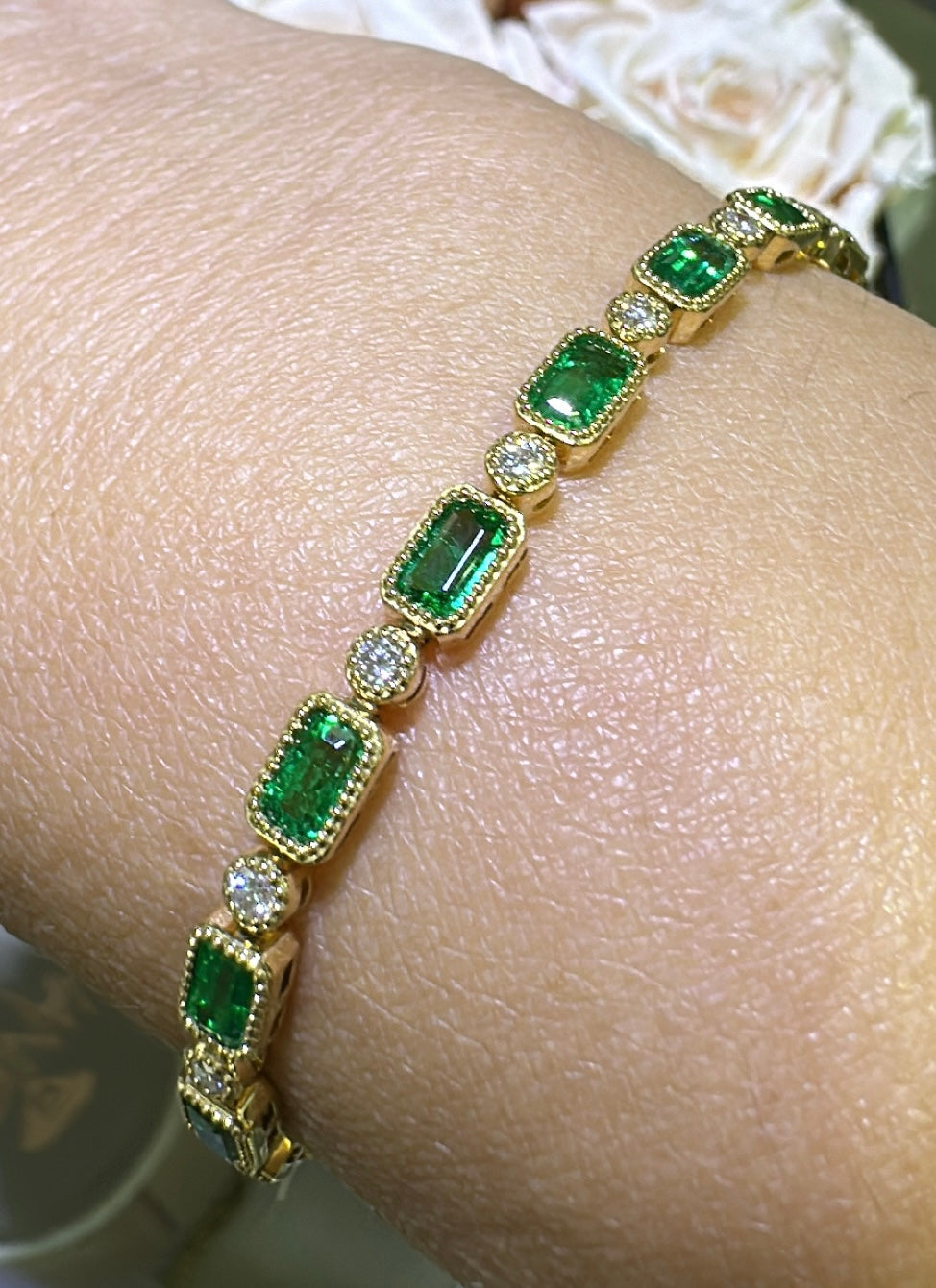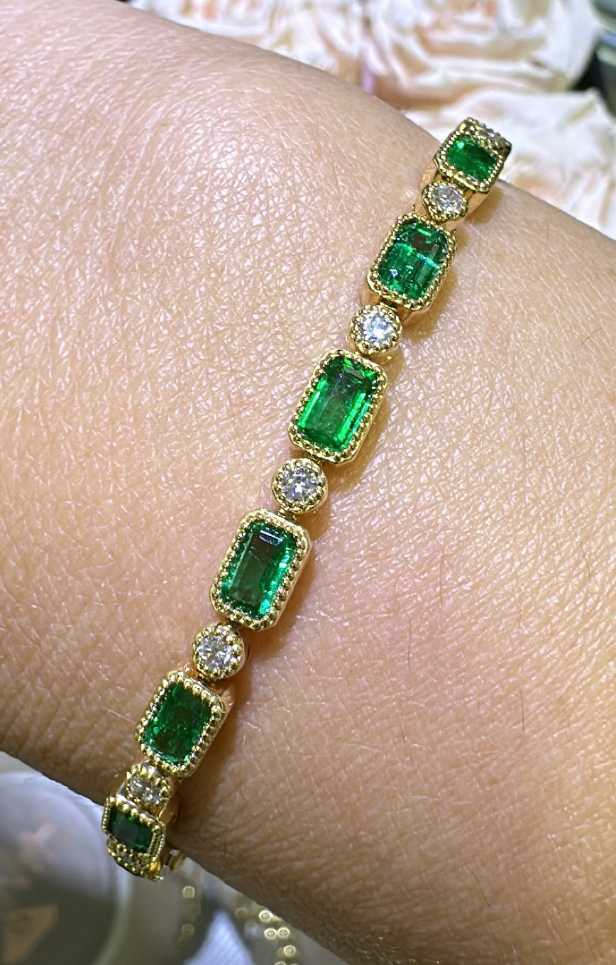 Elevate your style with our stunning diamond & emerald tennis statement bracelet! With 5.14ct t.w. of sparkling diamonds and rich emeralds, this bracelet exudes luxury and sophistication. Make a statement and stand out in any event with this dazzling piece. Add it to your jewelry collection today!