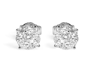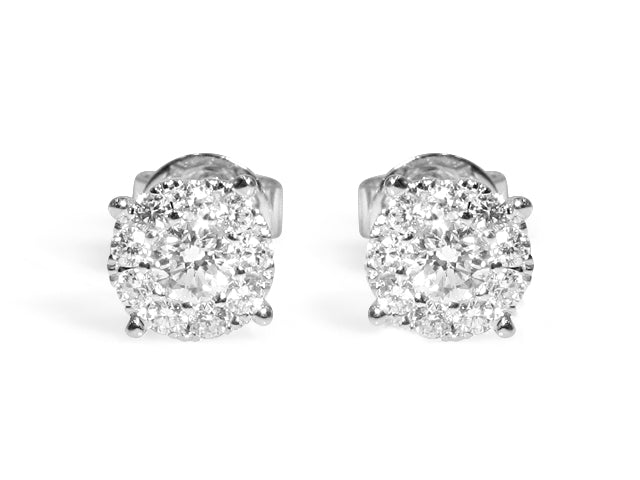 Designed to have the illusion of a larger stone, these exquisite diamond cluster stud earrings are a modern twist on the traditional diamond stud earrings. Metal: 18KT White Gold Diamond Weight: (18) Round Brilliant 0.25cttw Diamond Weight: (2) Round Brilliant 0.25cttw Backing: Push Backs