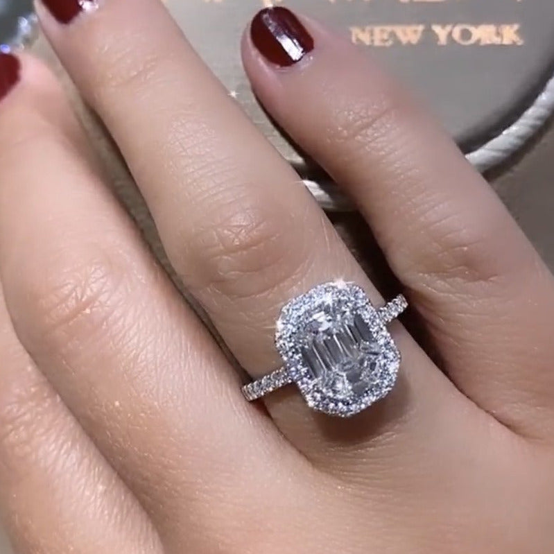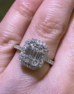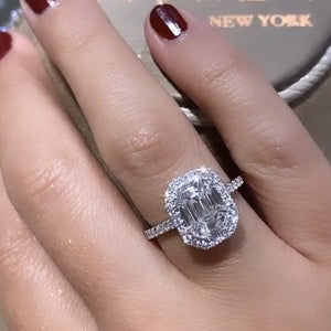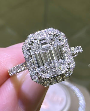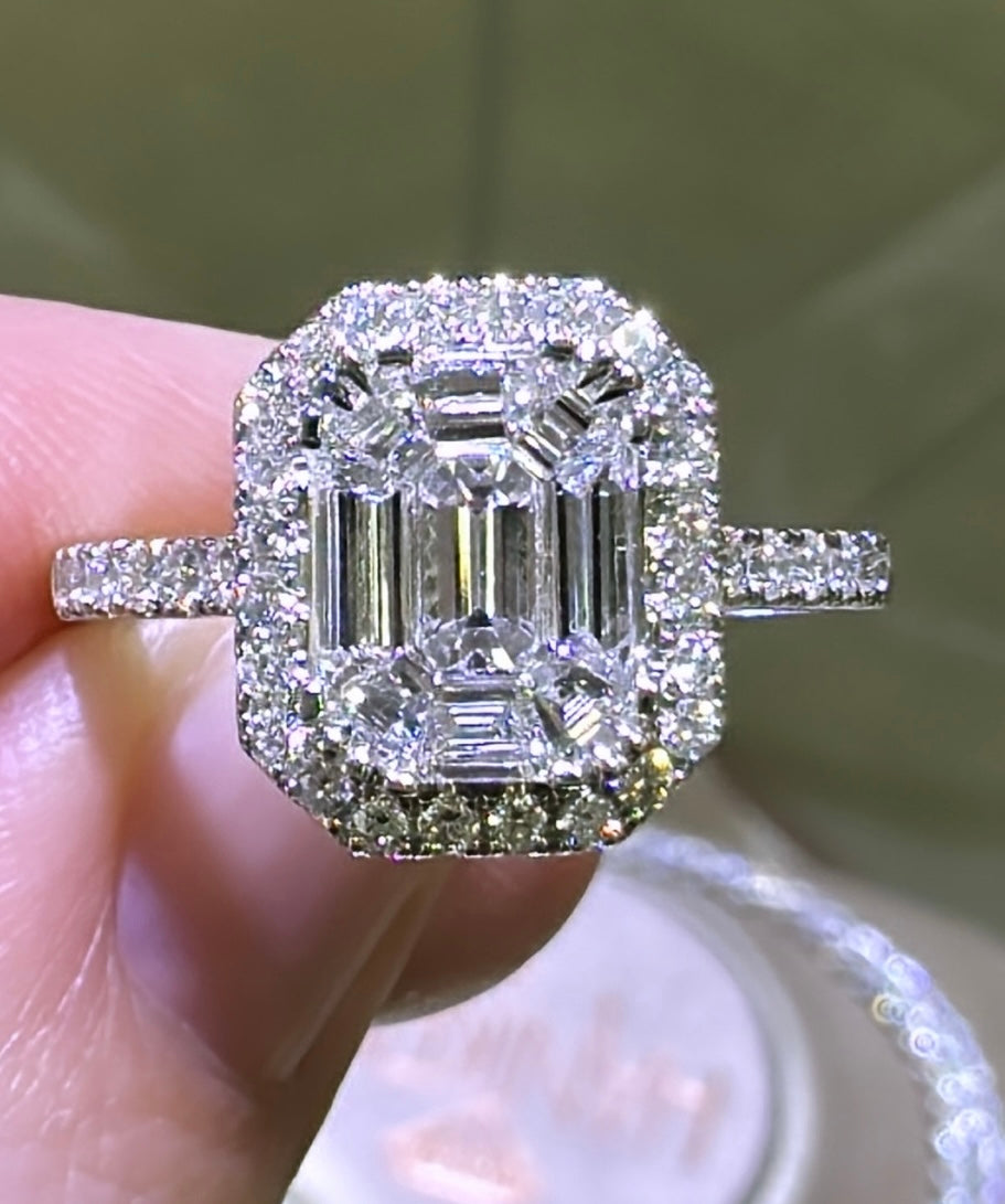 Are you shopping around for a fabulous cocktail, right hand ring? Or maybe you are looking for that engagement ring? Then you have definitely come to the right place. Our "Forever Octagon" emerald cut diamond ring will do just that, and even more! The design of it is incredibly unique and it has a sleek pave and invisible setting. You will fall in love with the way it captures and reflects the light. It has the look of a 3.50carats diamond glamour.