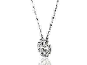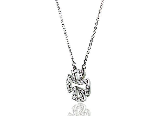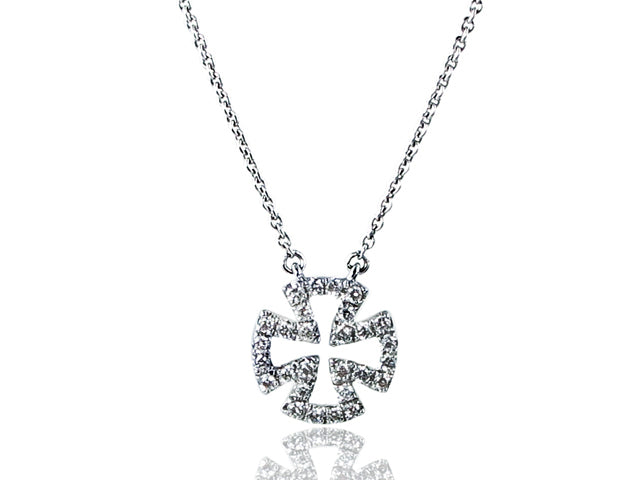 Petite diamond jewelry can look so crisp and clean. You can see exactly what we mean when you take a peek at our petite Celtic diamond cross necklace. This is a diamond pendant made up of 18kt white gold and set with gleaming 0.14ct t.w. round diamonds.  Cross pieces are great inspirational designs that can not only perk up your outfit, but can lift up your mood as well. And because this is a petite necklace, you will find that you will be able to wear it with anything and everything in your closet.