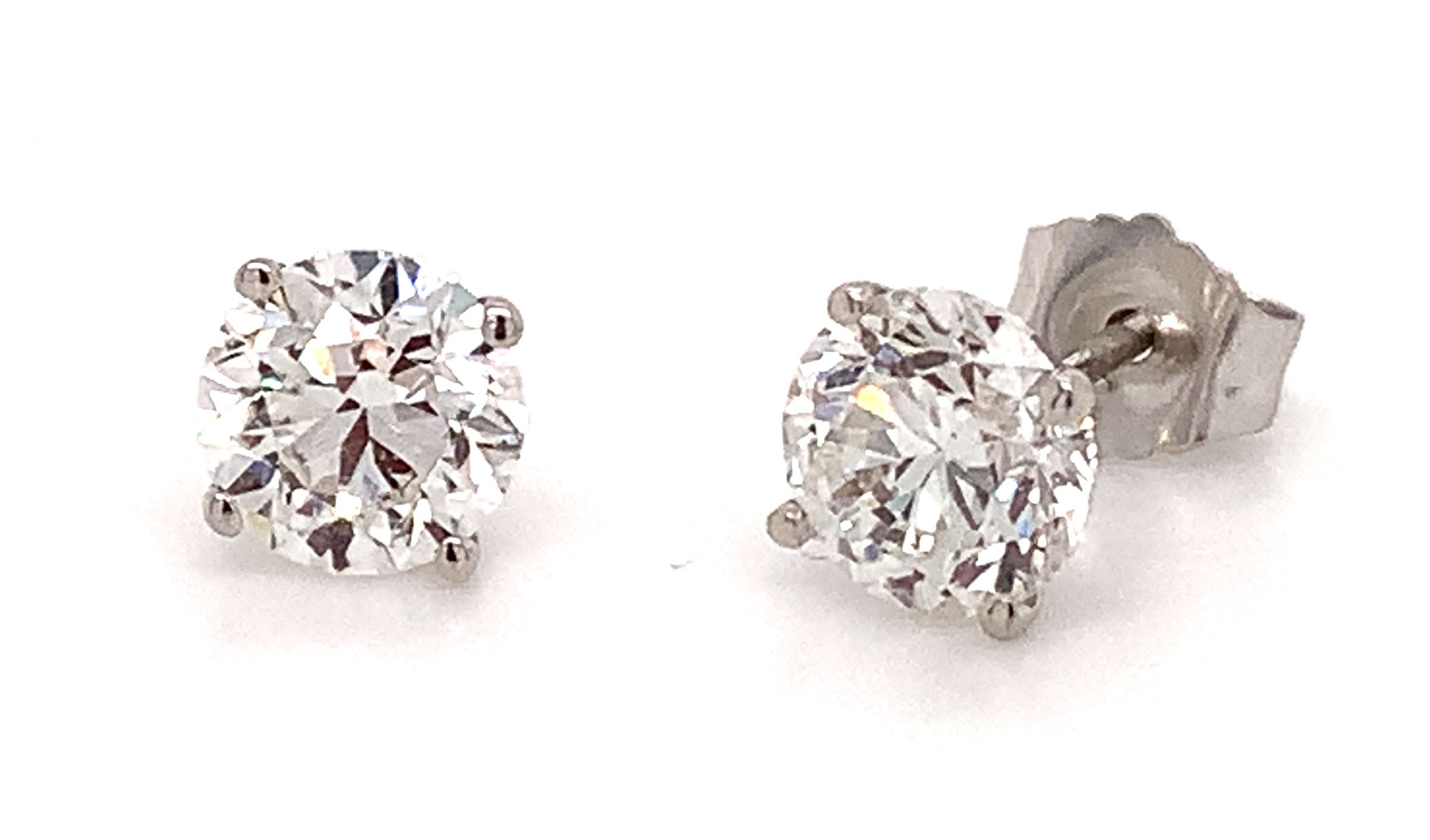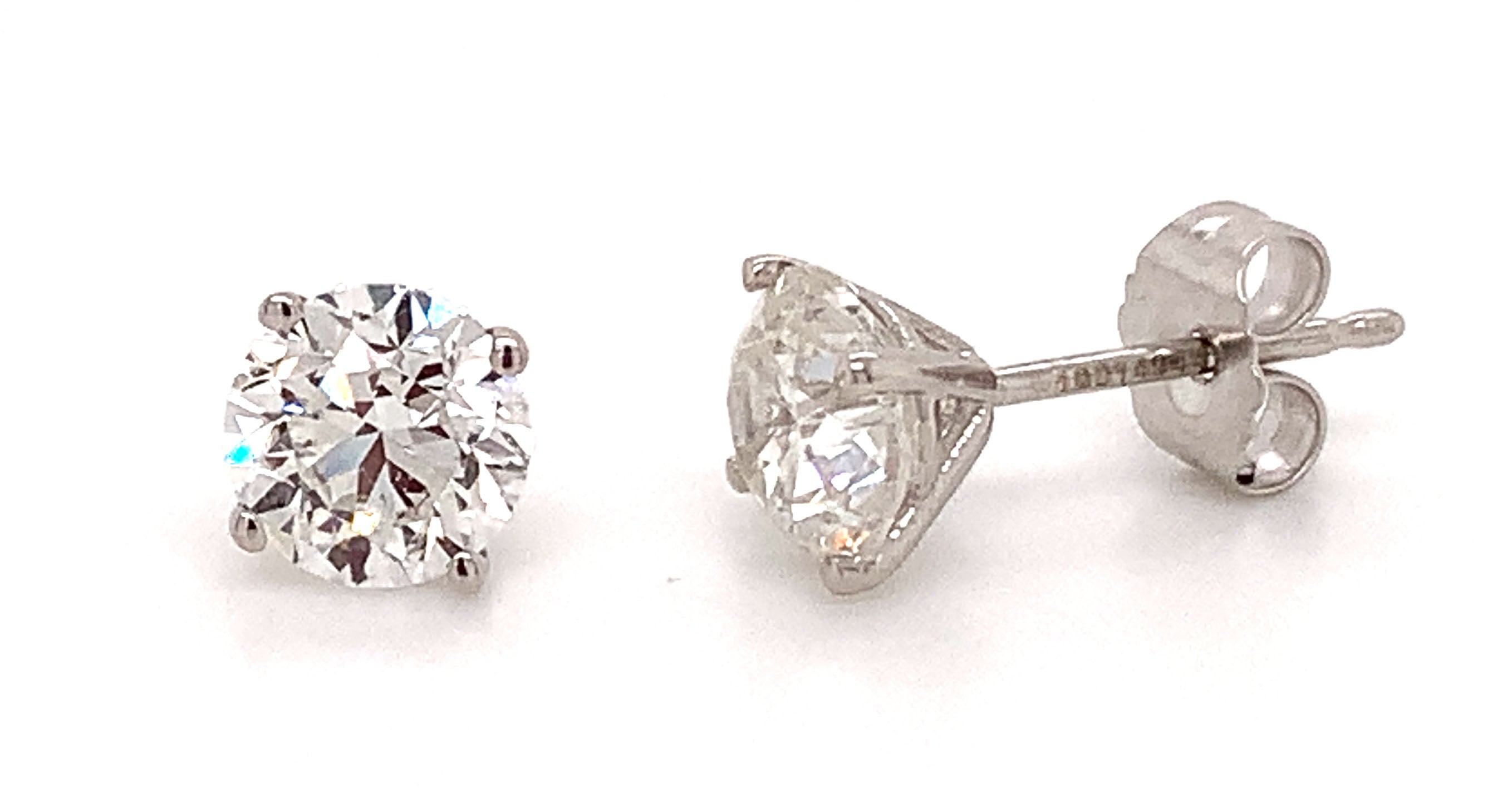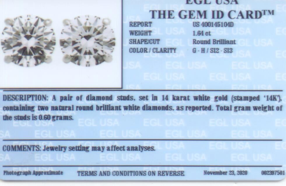 Perfect match, our 1.64-carat white gold stud earrings are timeless and sure to please for everyday wear. These beautiful stud earrings totaling 1.64ct t.w. of high-quality round brilliant diamonds EGL US certified G - H color SI2 - SI3 clarity.