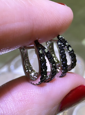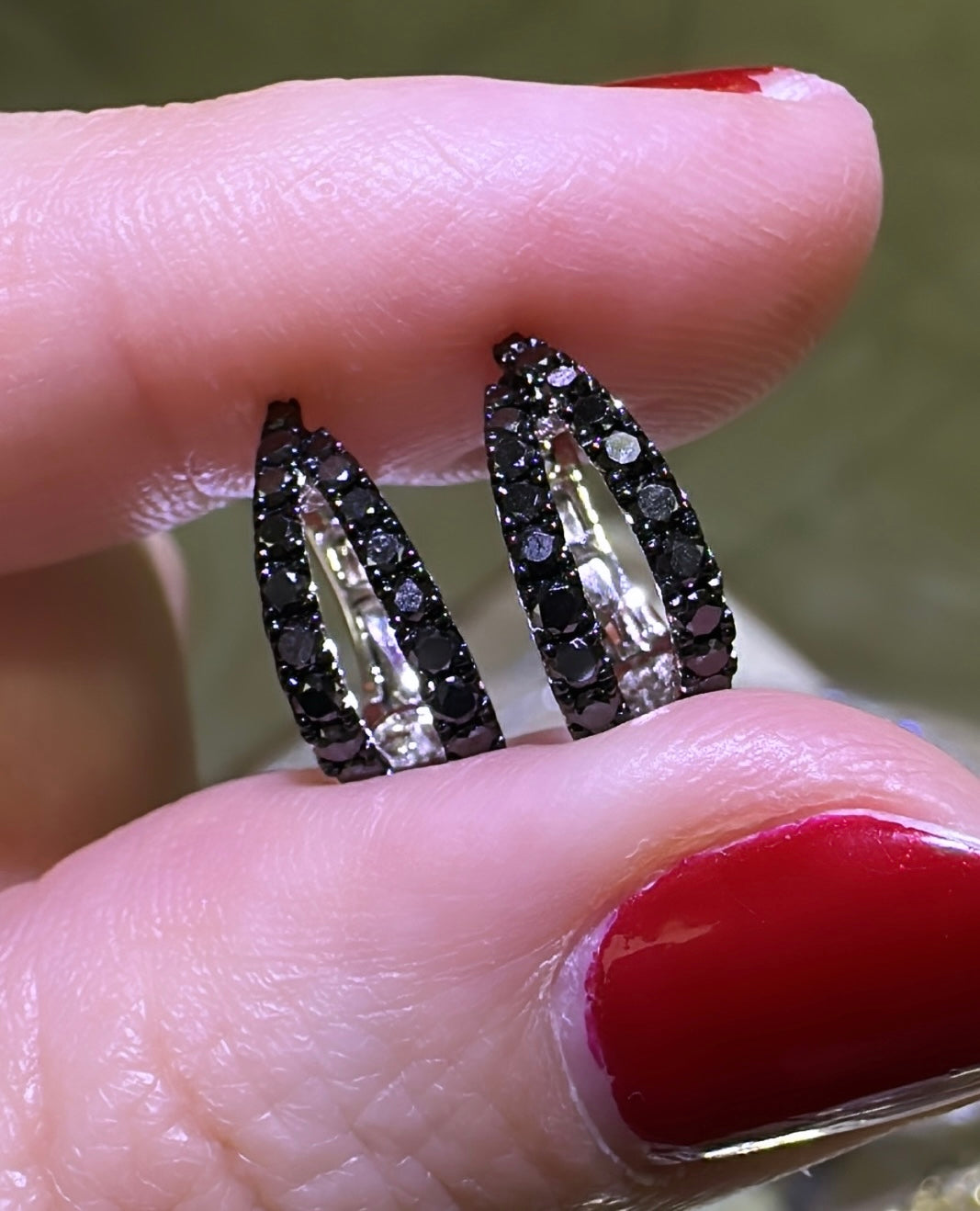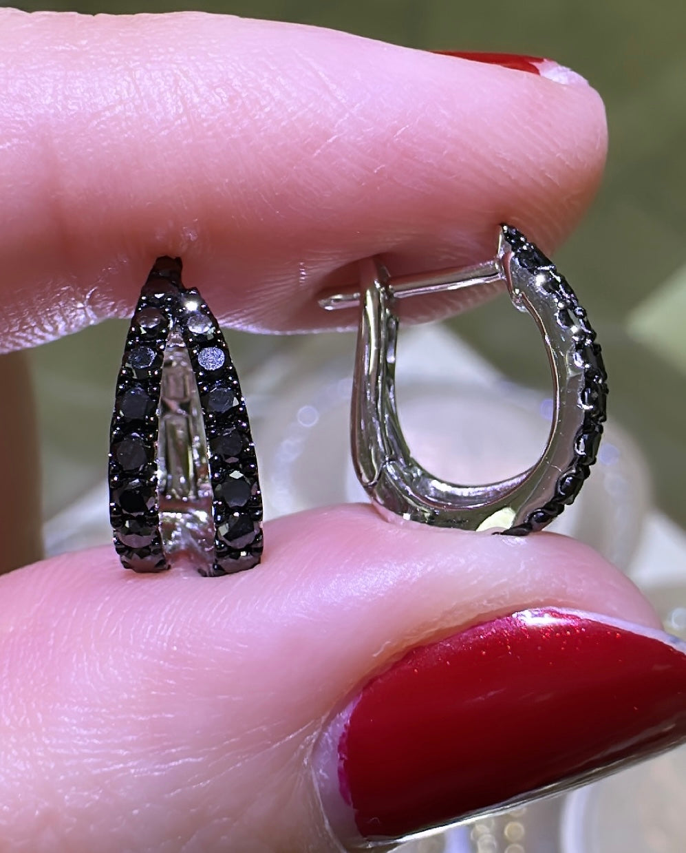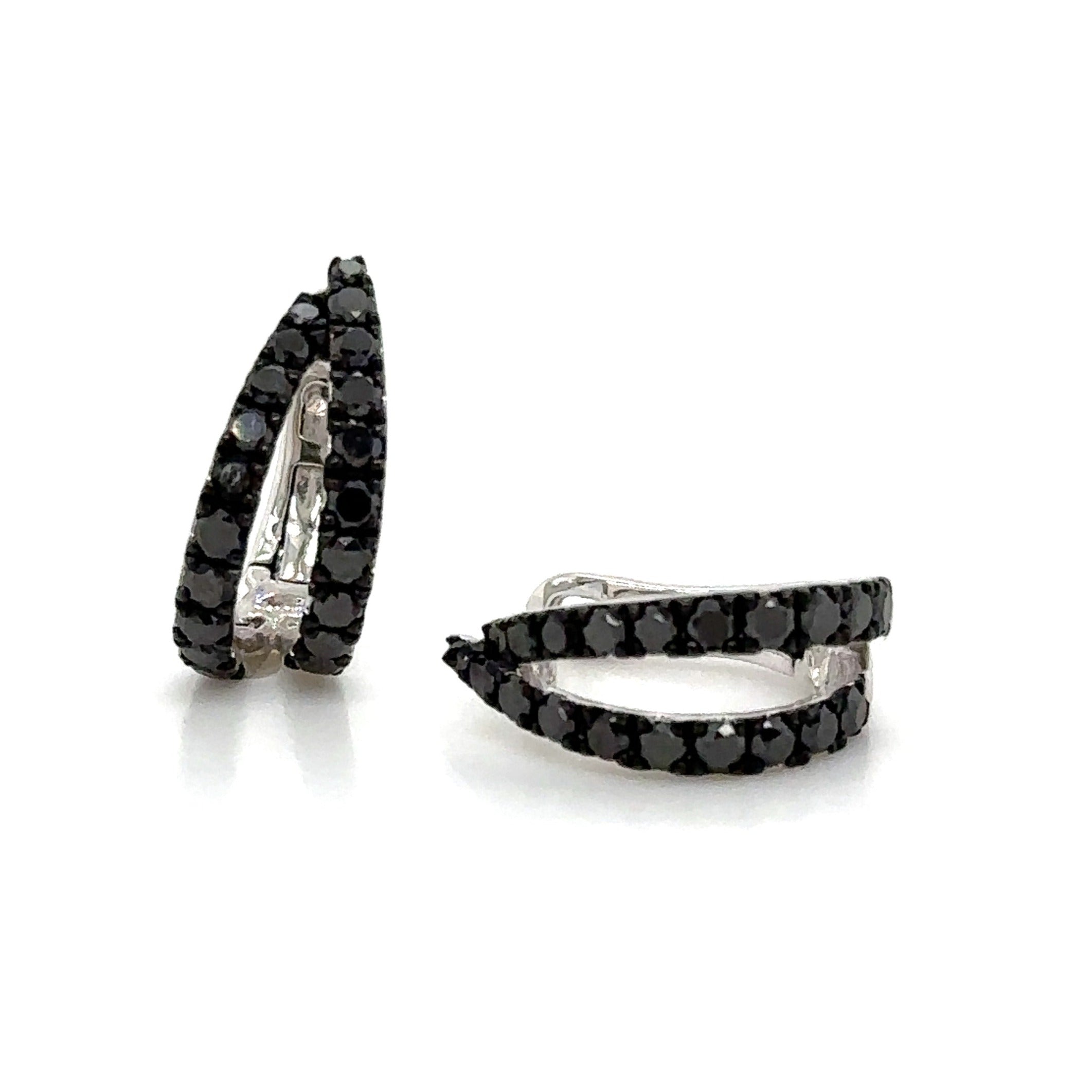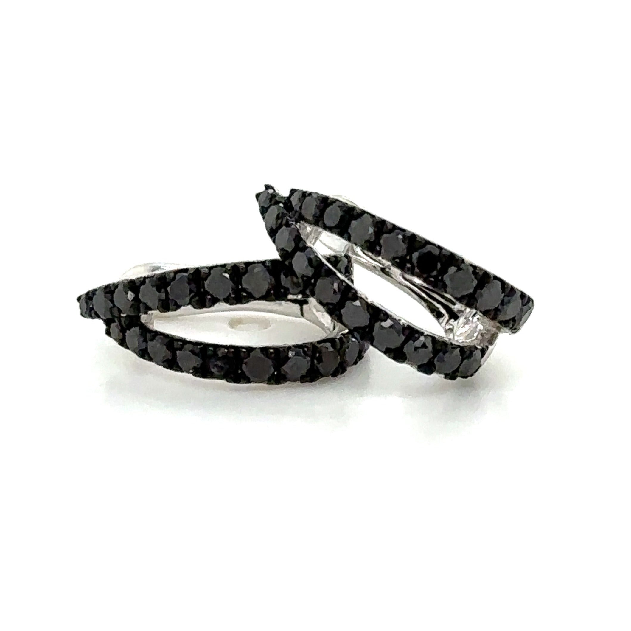A staple in every girl’s jewelry wardrobe, these subtle black diamond huggies are perfect for everyday wear. One whole push back backing double huggie look.