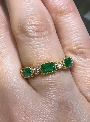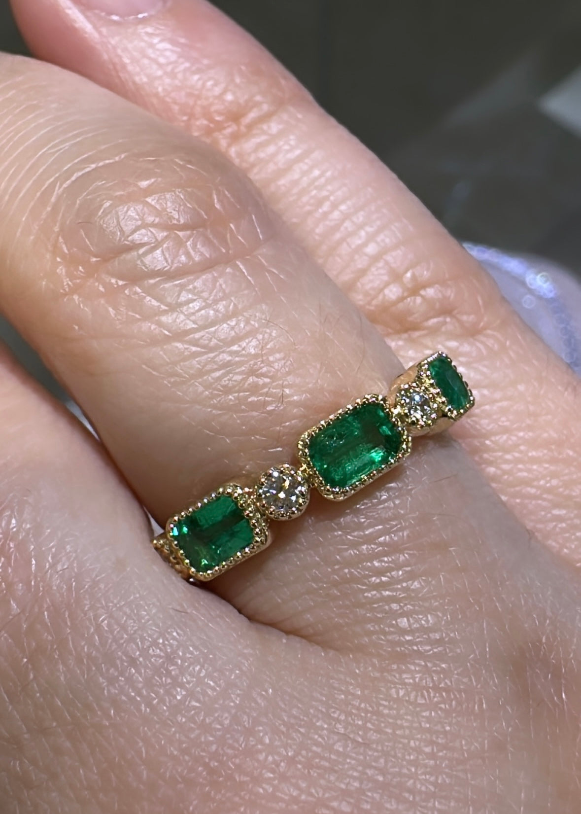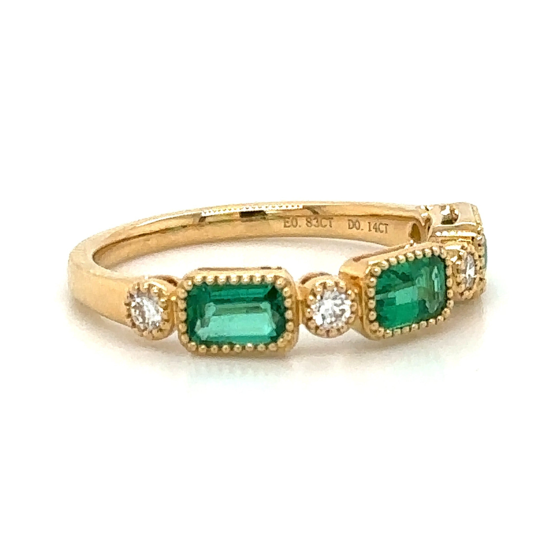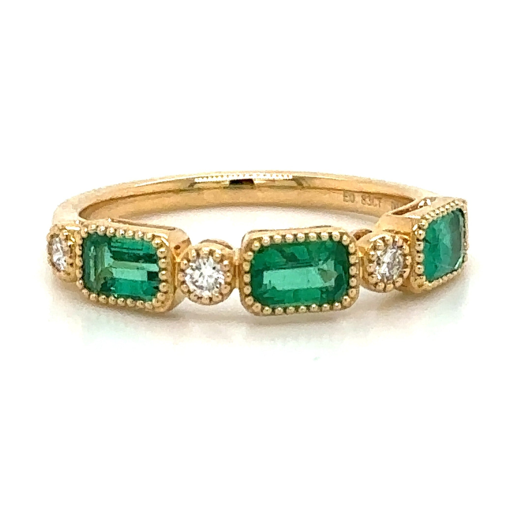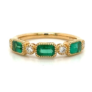 This emerald and diamond celebration stackable ring will give you something to celebrate! Fabulous emerald and diamond accents shimmer and sparkle against the yellow gold setting, all combined into one timeless piece. Show off your own unique style with this glorious piece!