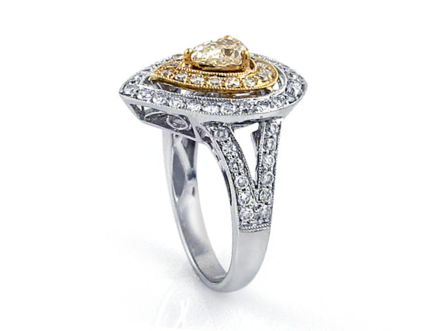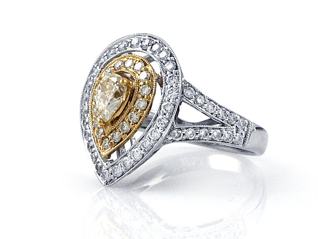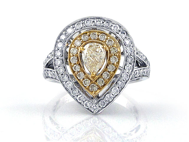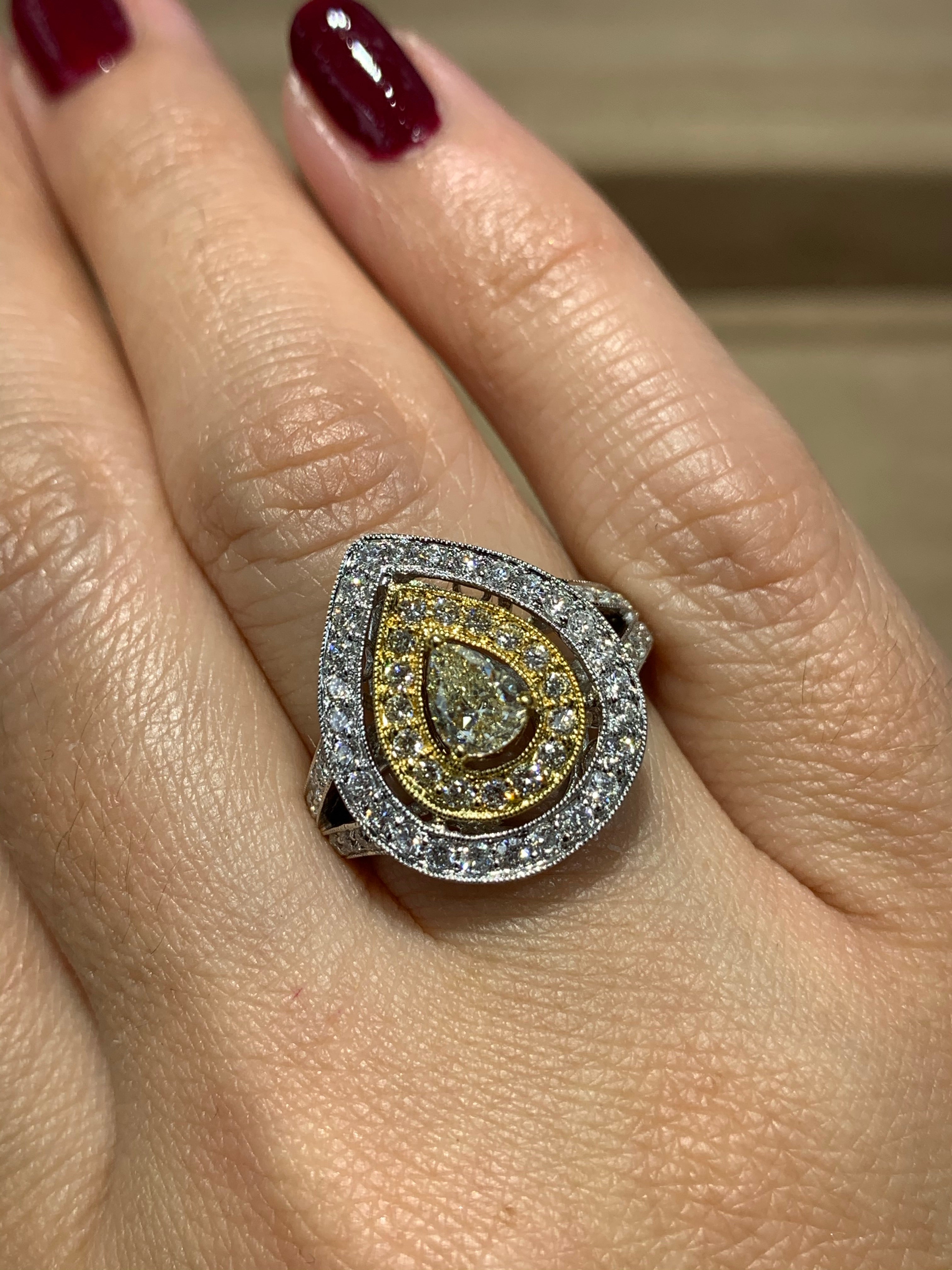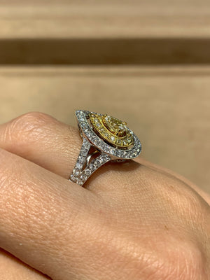 Yellow diamond pear shape fashion ring splint diamond shoulders and double diamond halo makes this ring so unique and it will sure to become your fave in your jewelry collection.