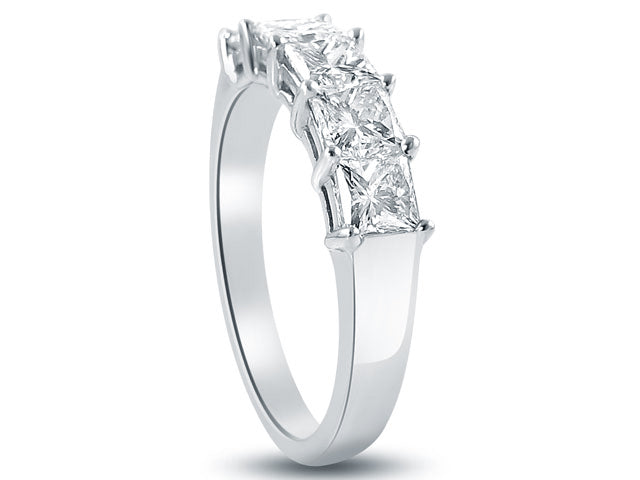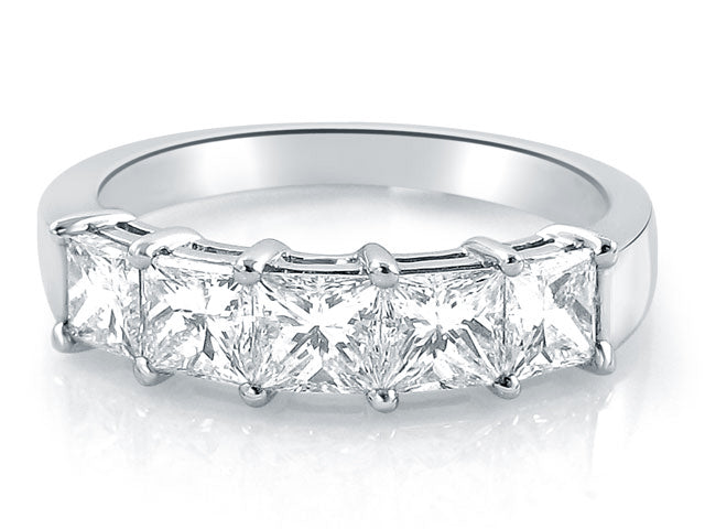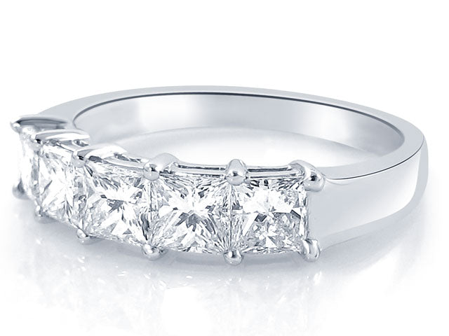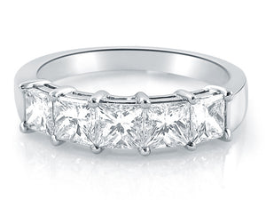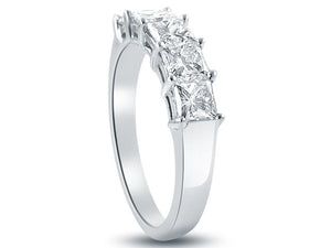 Our five stone princess cut diamond wedding ring is something that we thought we could only dream about. Each stone is a gorgeous princess cut and the ring weighs in at a total of 1.55 carats. The rings is 4.8mm wide and makes for a bold sized wedding ring. Metal: 18kt White Gold Diamond Weight: 1.15ct t.w. Diamond Shape: Princess Cut Band Width: 4.8mm Band Thickness: 3.1mm Setting: Prong Set