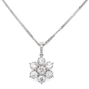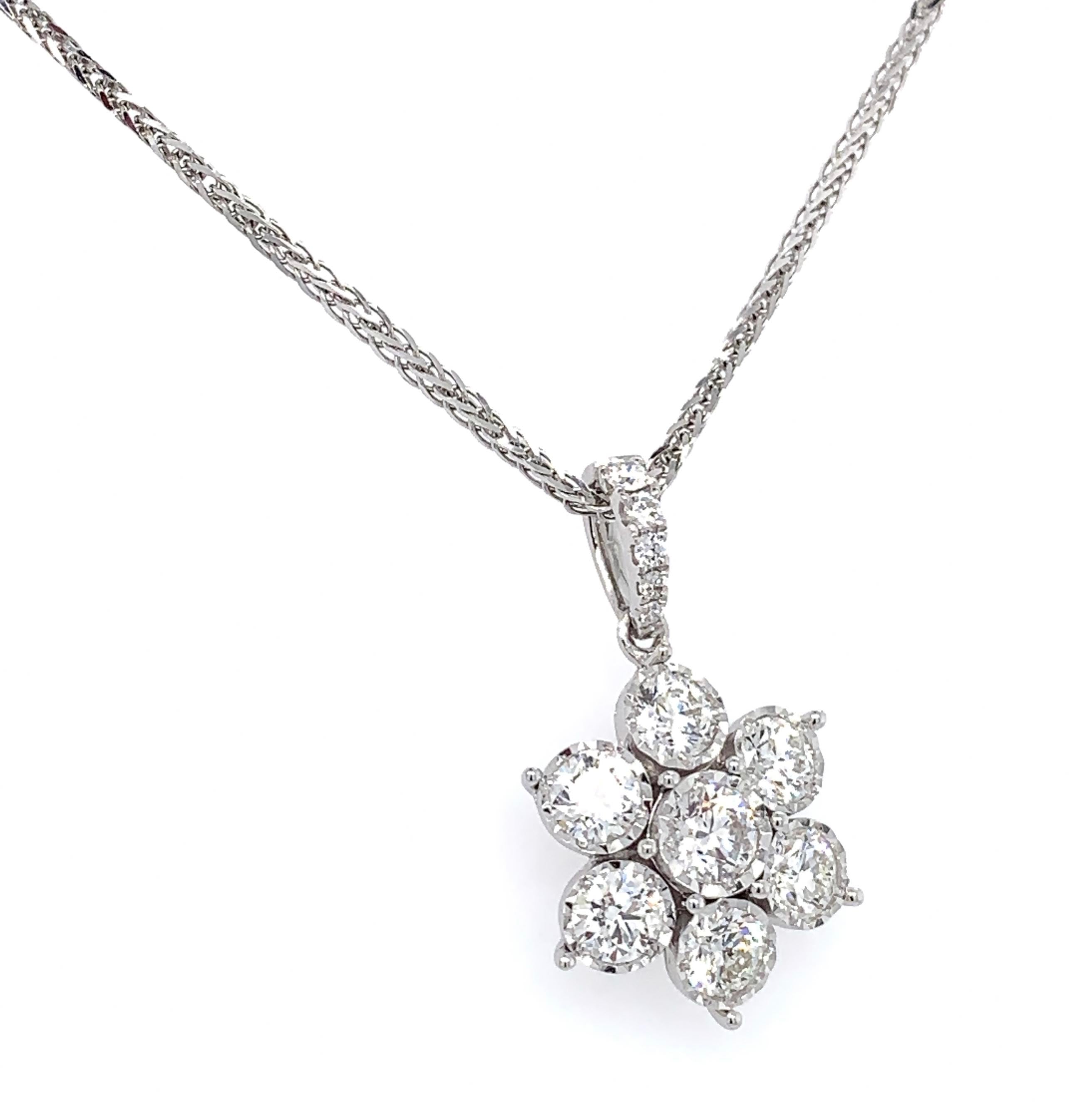 Flower motif diamond gold pendant featuring round shape center diamond, surrounded by additional six round diamonds forming a flower.