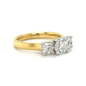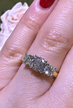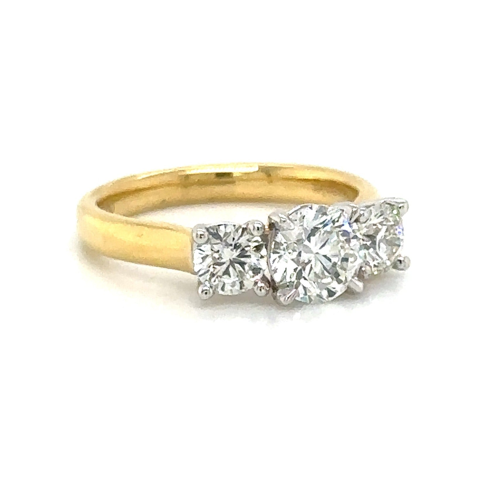 Elevate your love with this stunning GIA certified 1.49 carat round cut diamond three stone engagement ring. Perfectly crafted to symbolize your past, present, and future, this ring sparkles with passion and devotion. Let the beauty of this ring express your unwavering commitment to your love story.