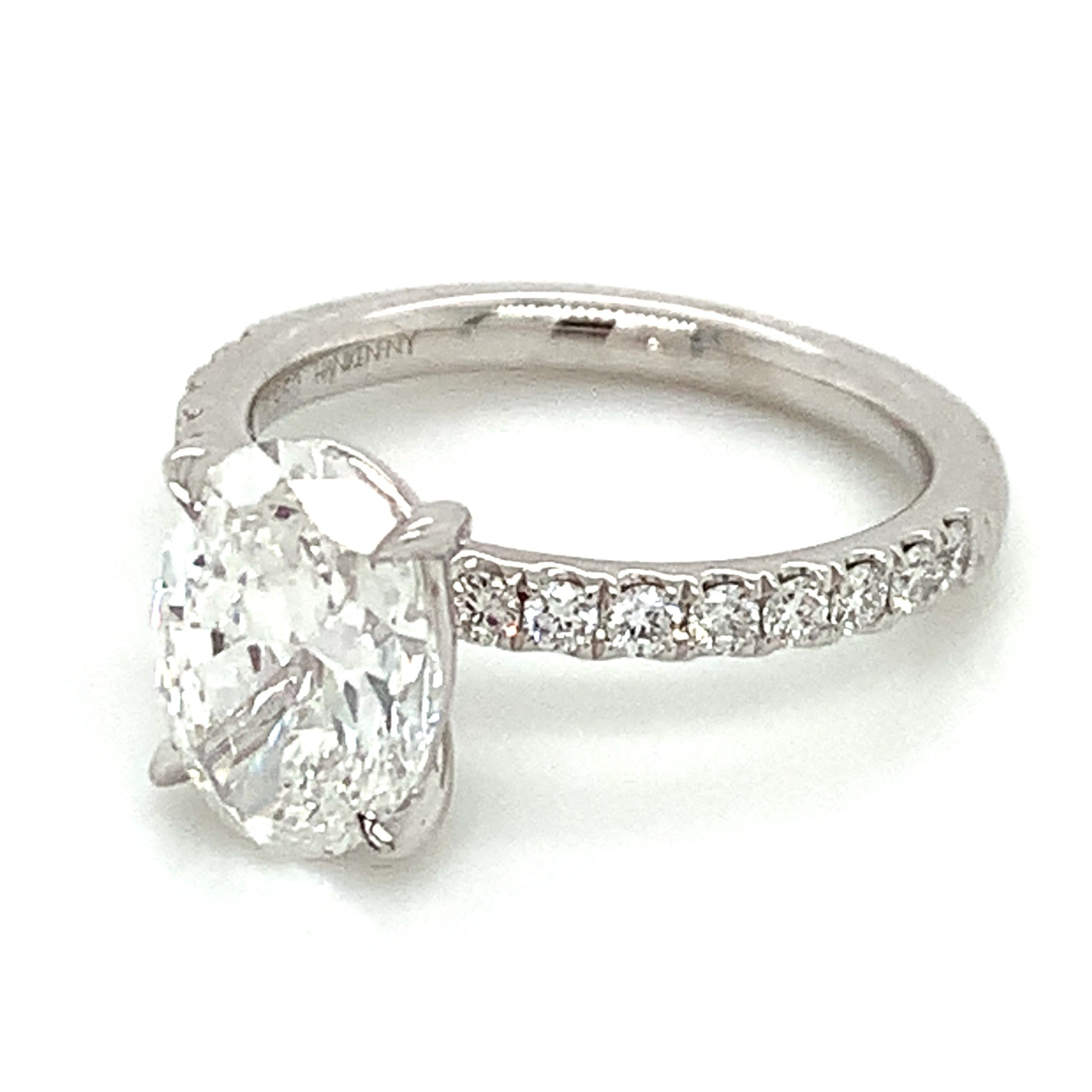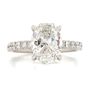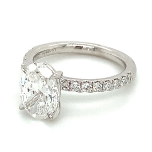 Oval diamond engagement ring handcrafted by our couture team. When it comes to oval diamond as a center stone we are often inspired by the red carpet looks. Needless to say our customers are too. Metal: Platinum Center Diamond: 1.82ct Oval Brilliant Cut Diamond Details: E color, VVS1 clarity, GIA certified Side Diamonds: 0.29ct tw 16 Round Cut Diamonds