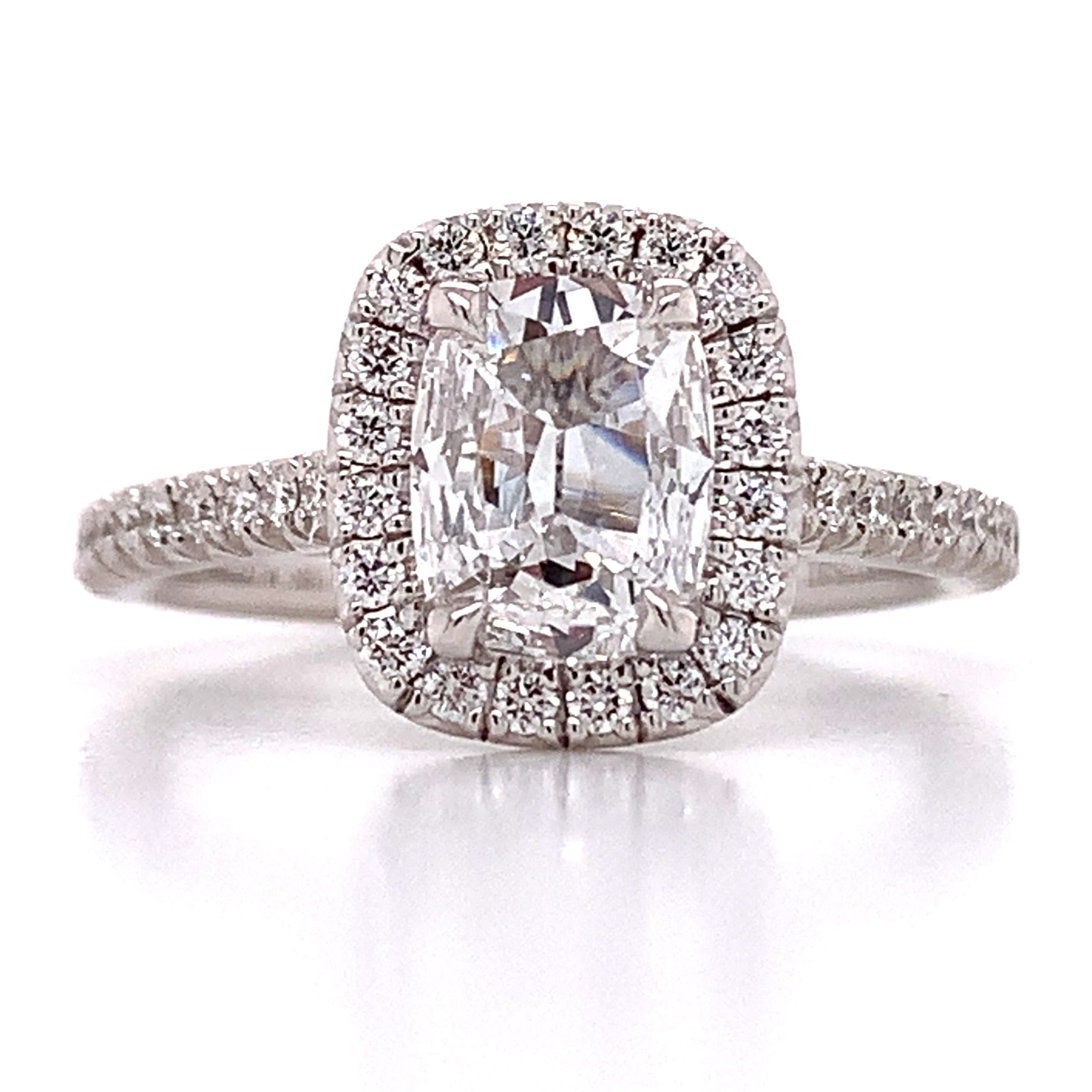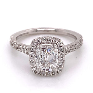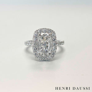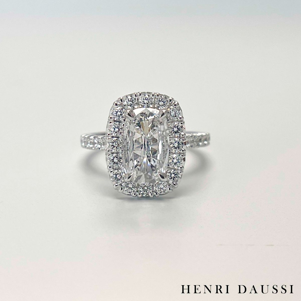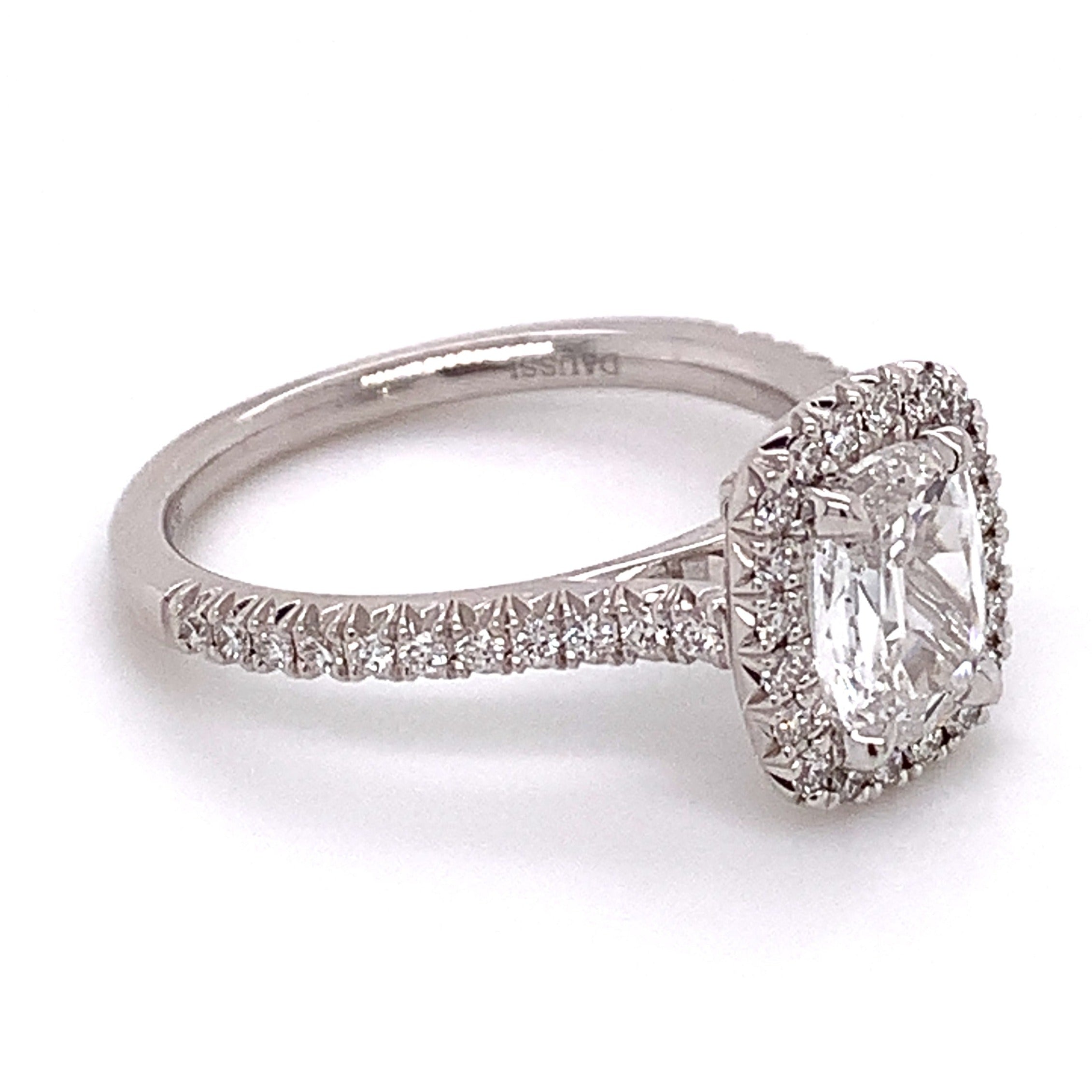 Presenting the epitome of luxury and timeless style, this GIA Certified Henri Daussi engagement ring will be the envy of all. Boasting a signature cushion cut center diamond, framed by a delicate pave halo, and totaling approximately 1.23carats, this ring is sure to dazzle for generations to come.