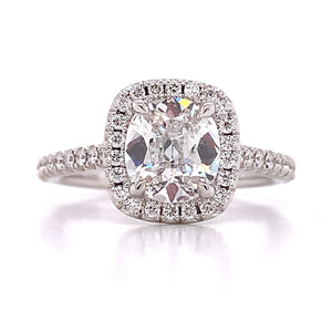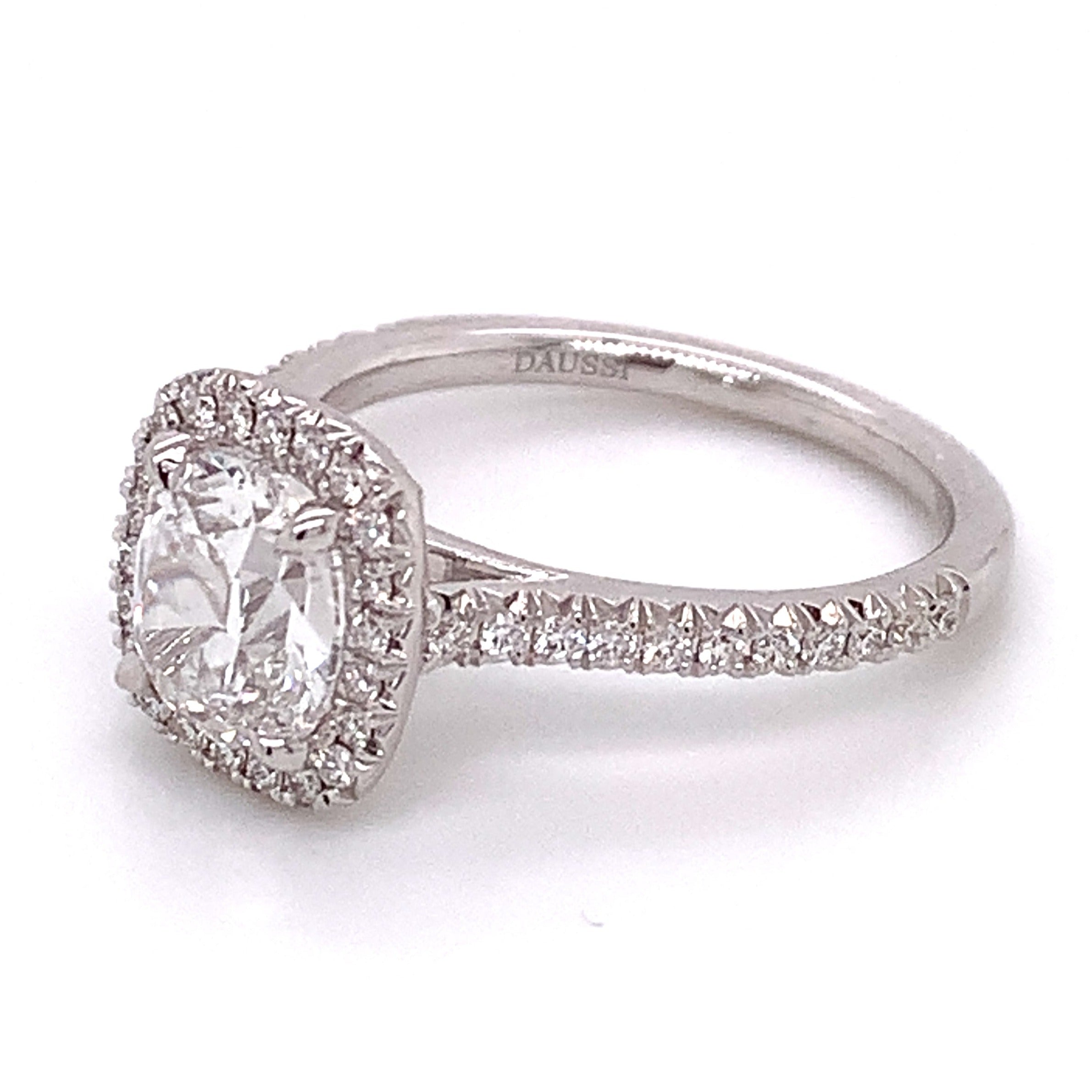 Henri Daussi diamond engagement ring featuring a pave halo and totaling approximately 1.81 carats. This ring comes with GIA certificate, signature cushion cut in the center.