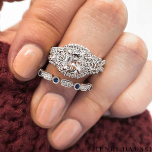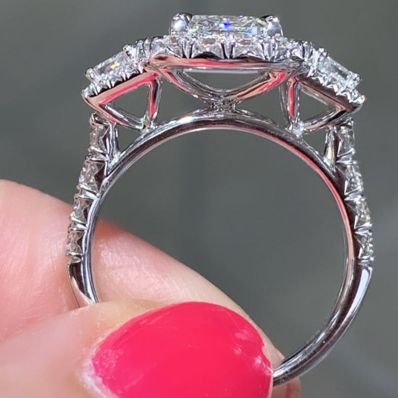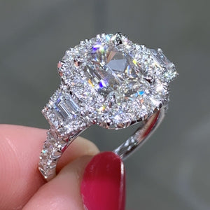 You will adore our cushion cut three stone fancy cushion center 1.55ct diamond, side 2 Trapezoid Diamonds 0.35ct tw ring because of its fantastic sparkle and shine! Even more, the sparkle is added by pave set round diamonds around each 44 round 1.02ct tw diamonds with total 2.92ct t.w. of sparkle we guarantee you'll never take this one off!