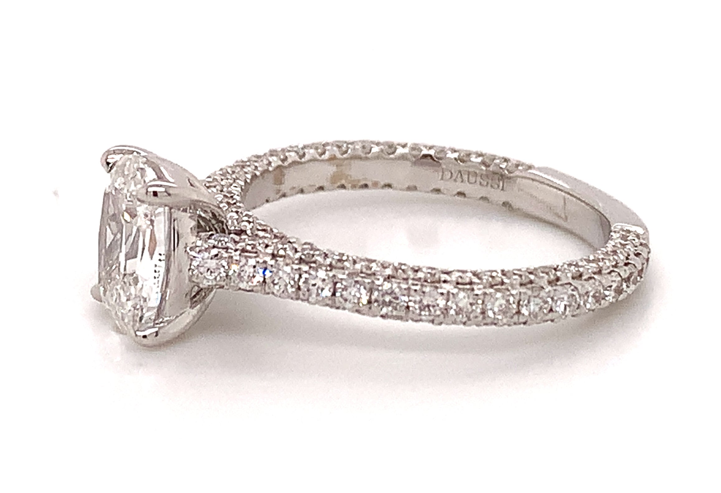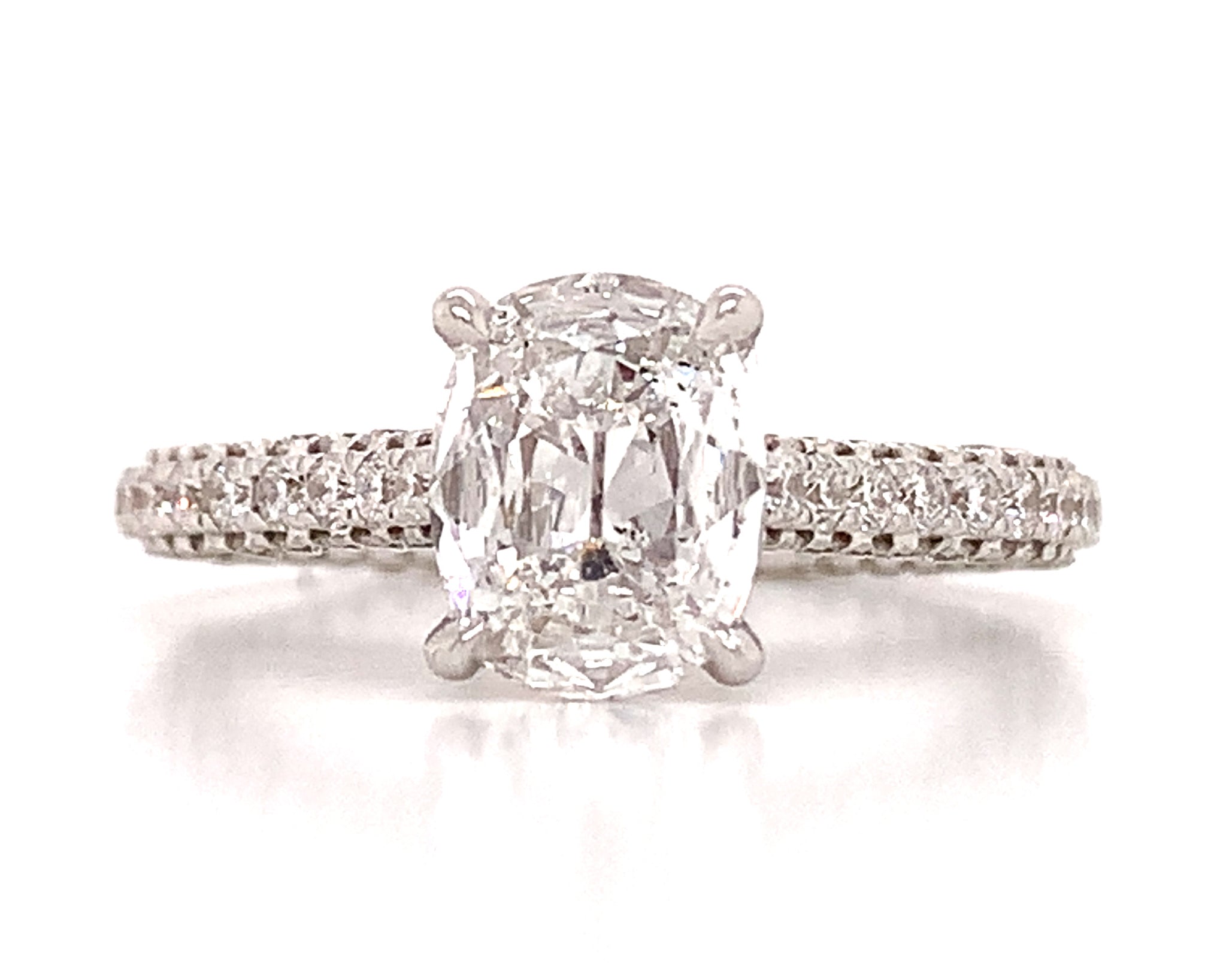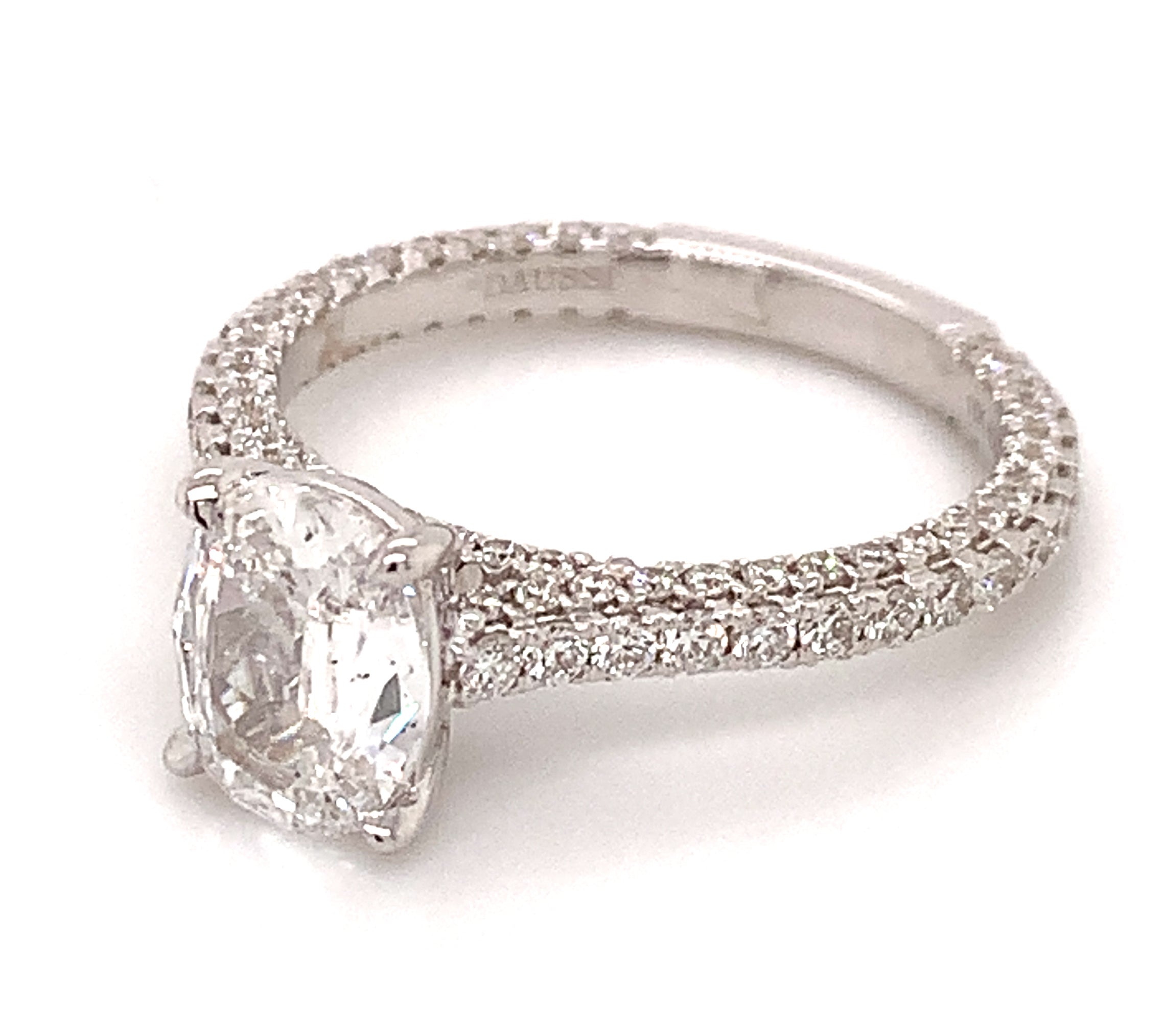 Metal: 18K White Gold Center Diamond: 1.13ct Cushion Cut Diamond Details: D color, SI1 Clarity, GIA Certified Side Diamonds: 0.92cts Round Cut Diamonds