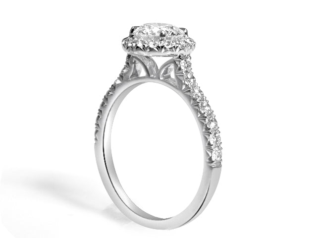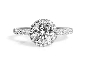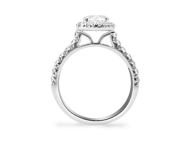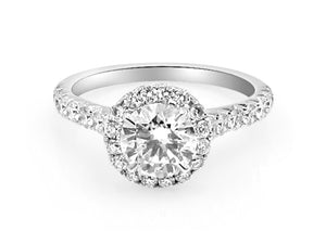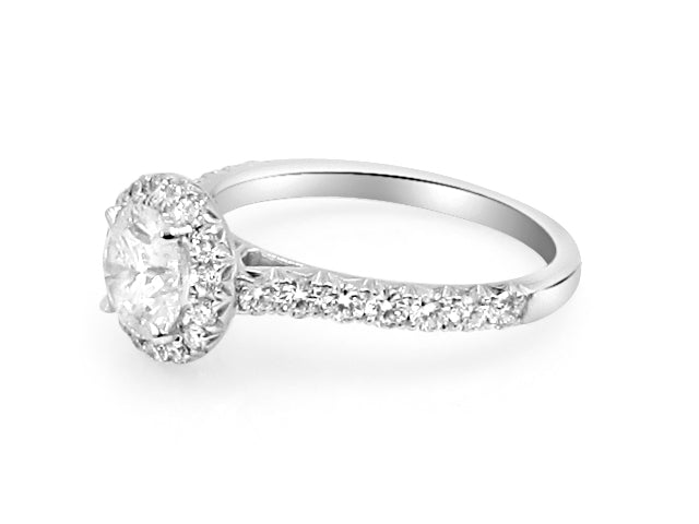 Henri Daussi engagement, anniversary round halo diamond shank ring featuring a round-cut diamond. Diamond halo around accentuates round cut GIA certified center diamond. Metal: 18K White Gold Center Diamond: 0.80ct Round Brilliant Cut Side Diamonds: 0.95ct tw Round Brilliant Cuts Center Diamond Quality: G - Color, SI2-Clarity Setting: Pave Finish: High Polish