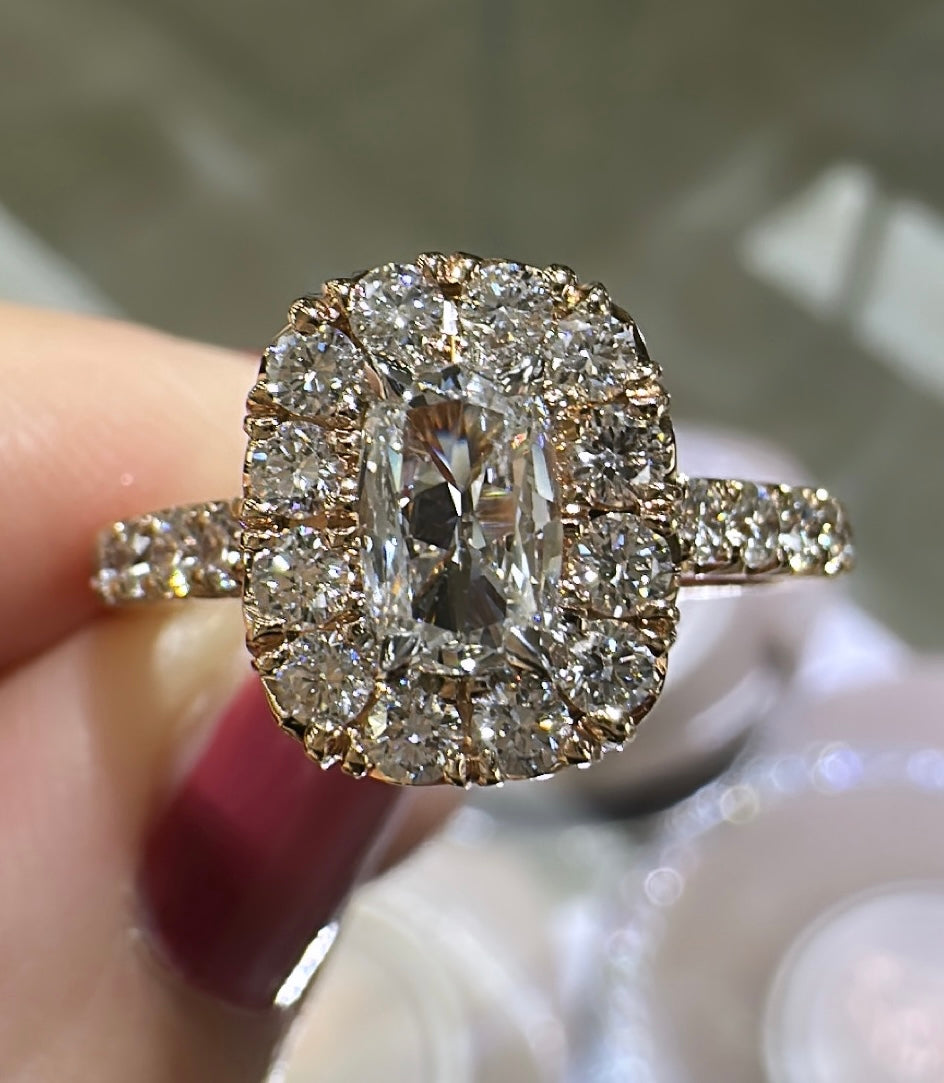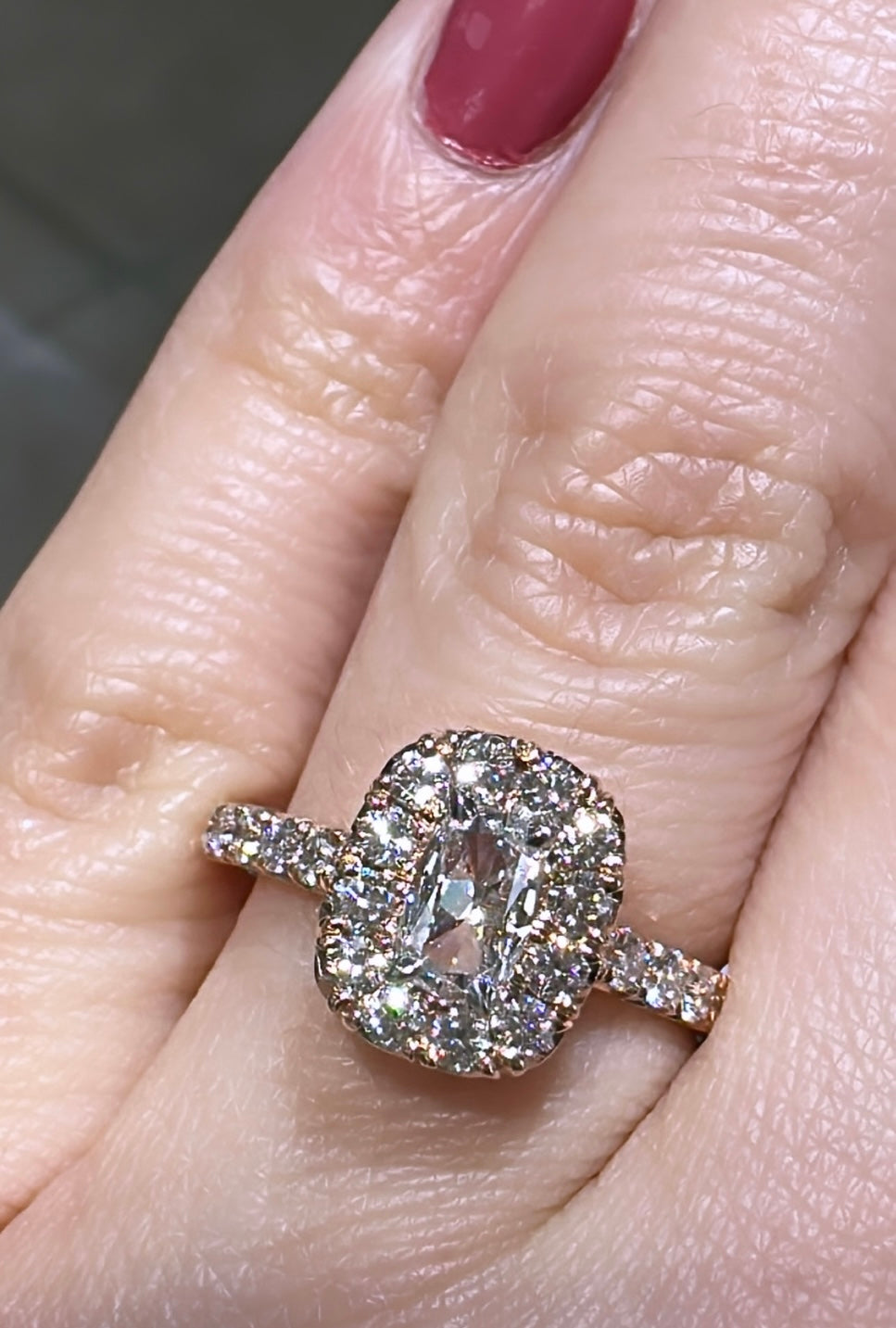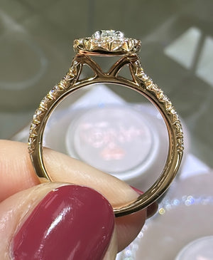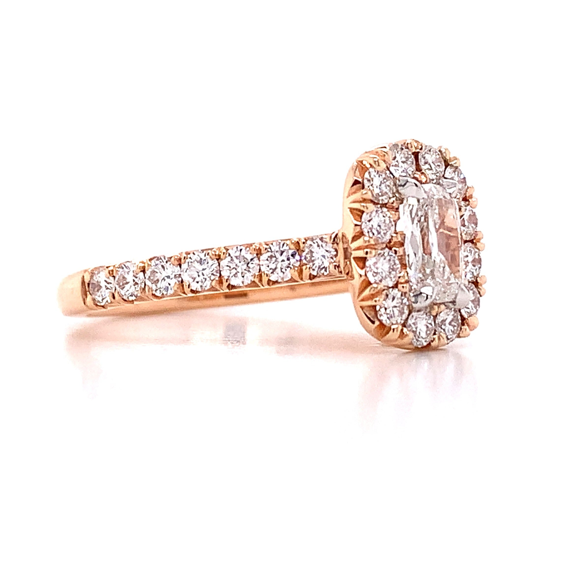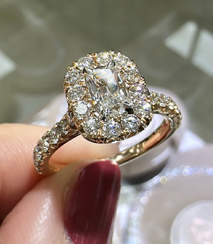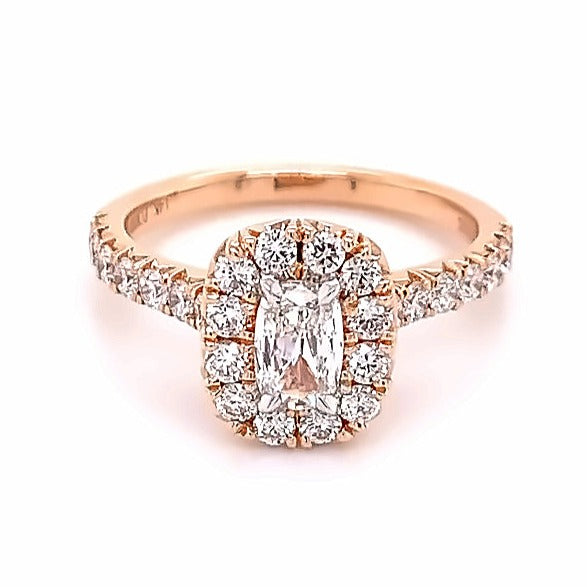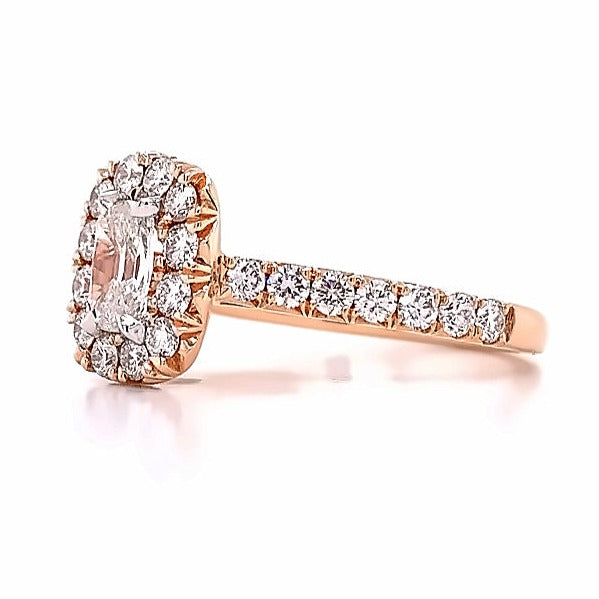 Henri Daussi diamond engagement ring featuring a pave halo and totaling approximately 1.13 carats. This ring comes with Henri Daussi certified, signature cushion cut in the center. Metal: 14K Rose Gold Cushion Center: 0.40ct Halo, Side: 26 Round 0.73ct tw Color: E Clarity:SI2