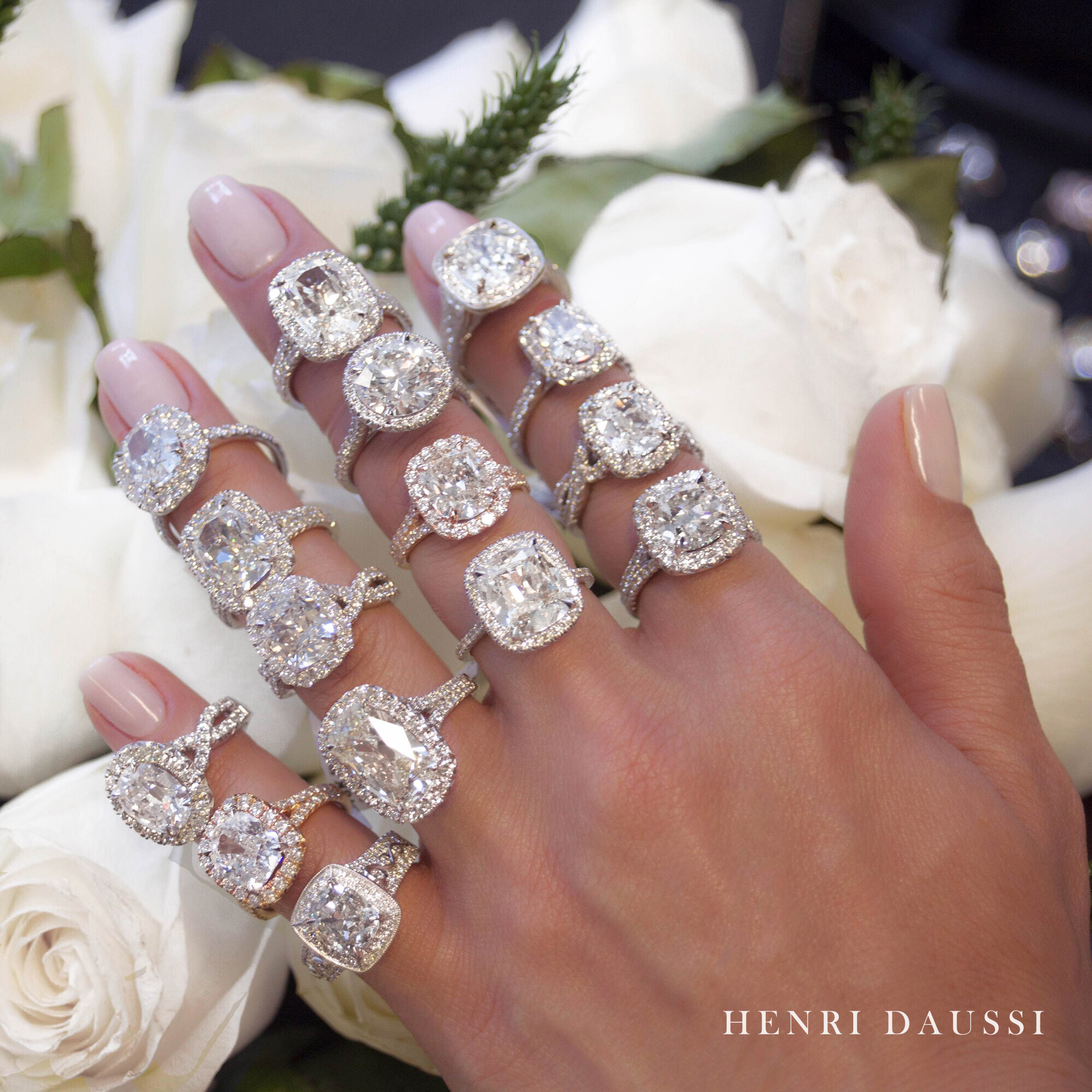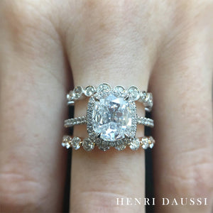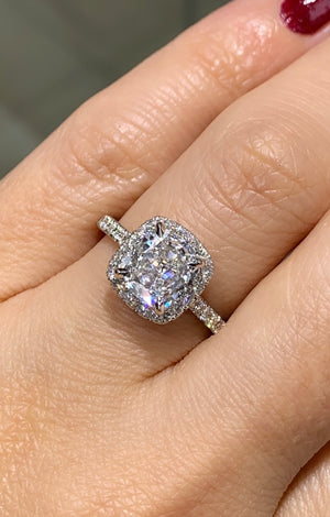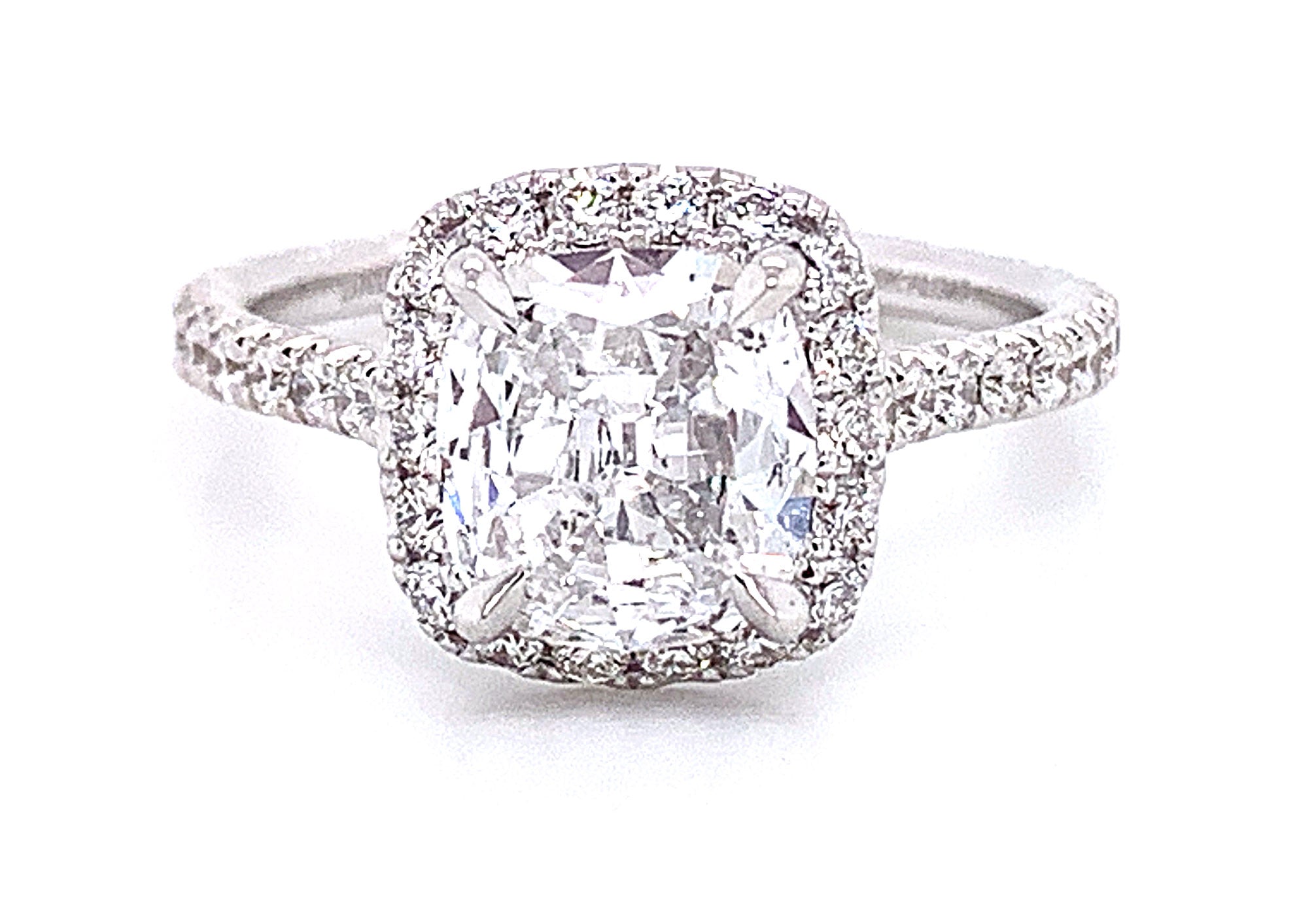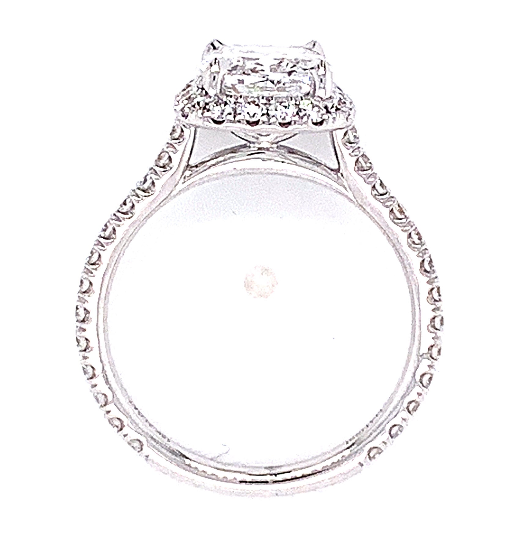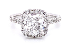 Henri Daussi Diamond Engagement Ring Metal: 18KT White Gold Diamond: 1.57cts Cushion Cut Color & Quality: D - SI2 Pave: 44 Round brilliant cut 0.61 cts diamonds Certified: GIA