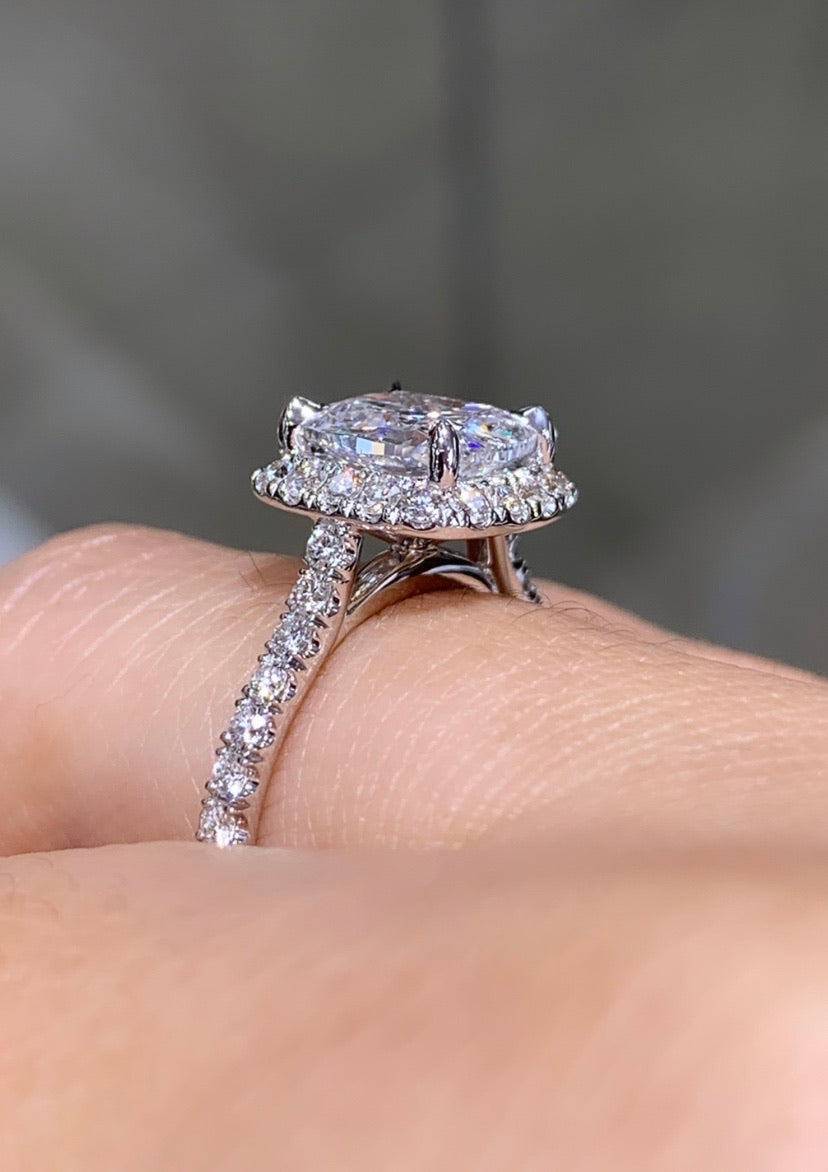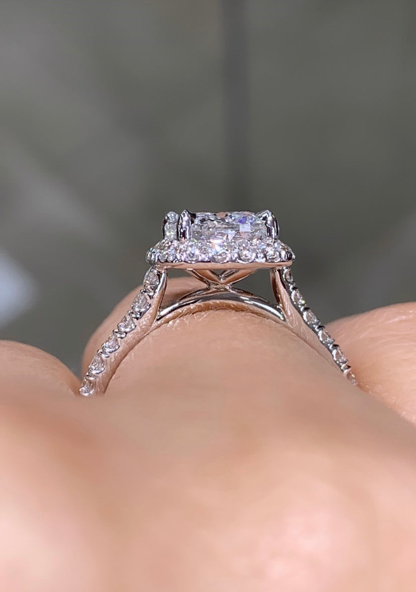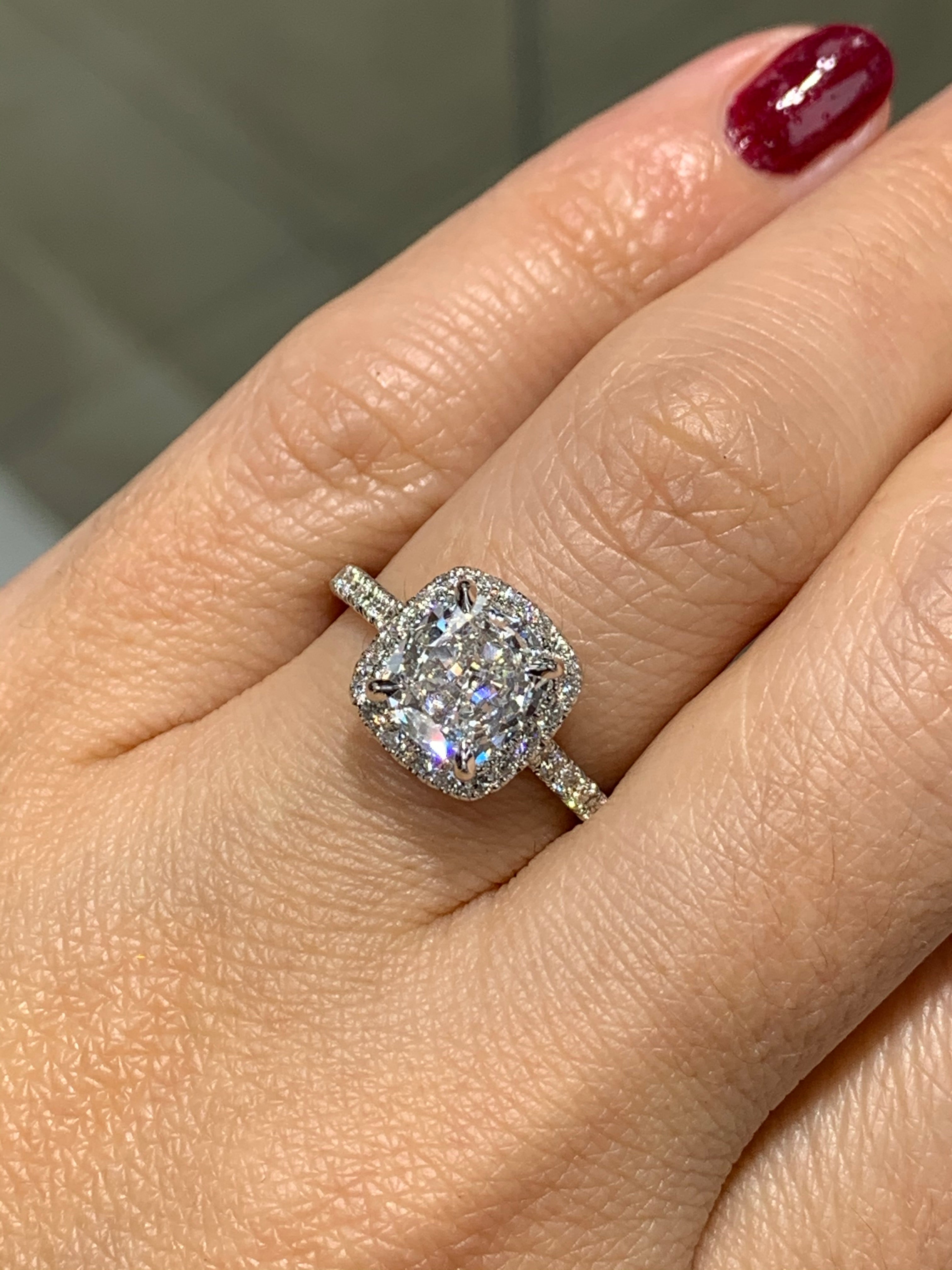 Henri Daussi Diamond Engagement Ring Metal: 18KT White Gold Diamond: 1.57cts Cushion Cut Color & Quality: D - SI2 Pave: 44 Round brilliant cut 0.61 cts diamonds Certified: GIA