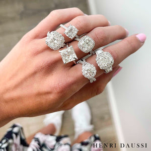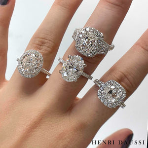 Say "I love you" with this stunning Henri Daussi engagement ring. Its 3.17ct cushion cut center stone and 0.49ct of trapezoid-cut side diamonds sparkle with pure emotion, making it the perfect symbol of a lifetime of love. Dare to be unforgettable!