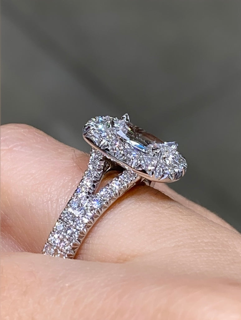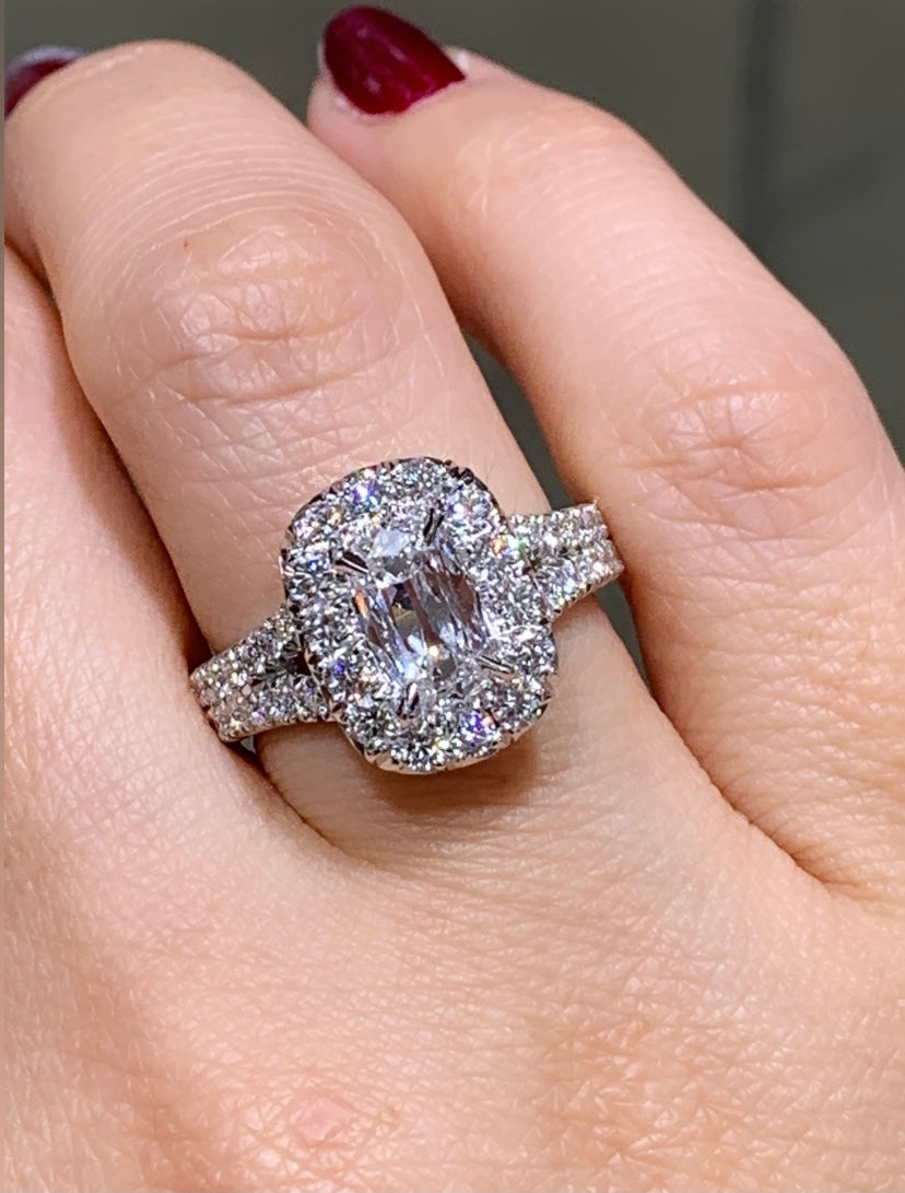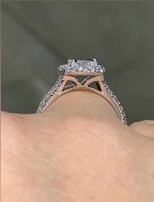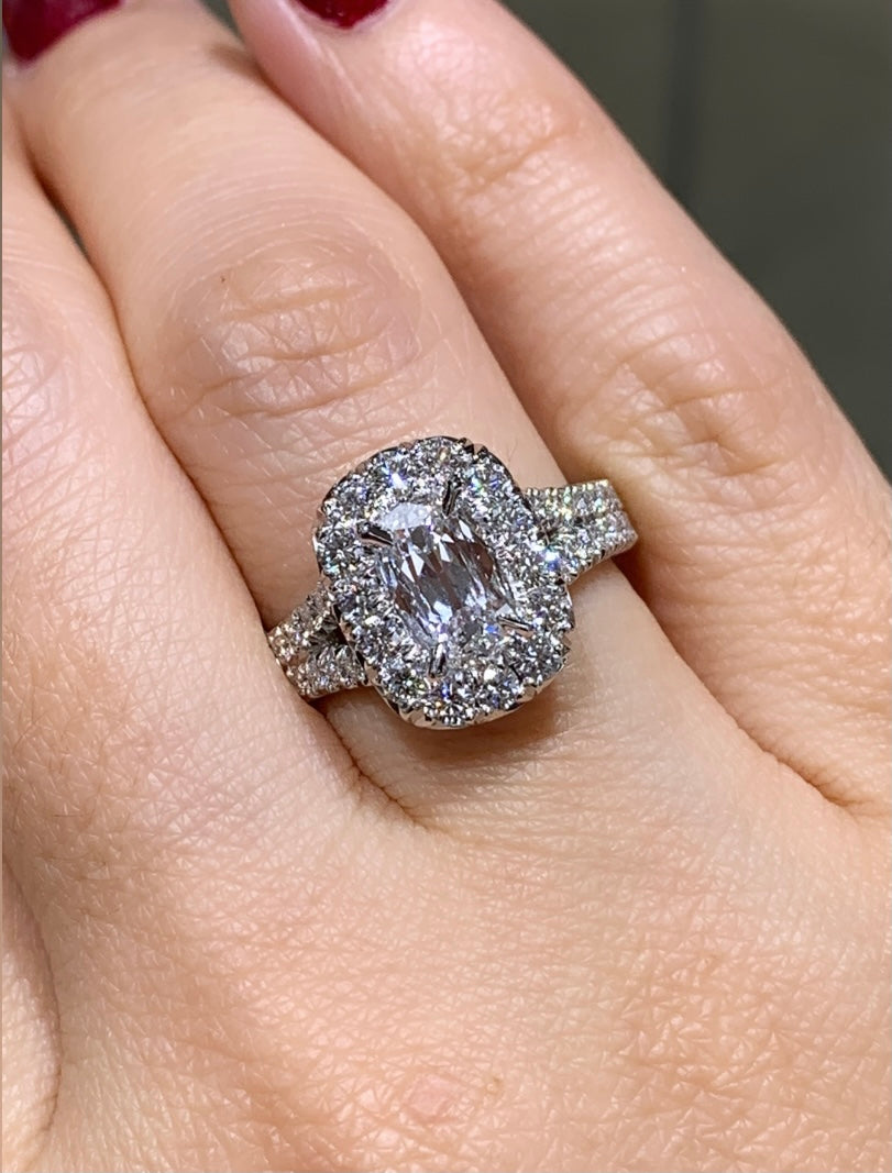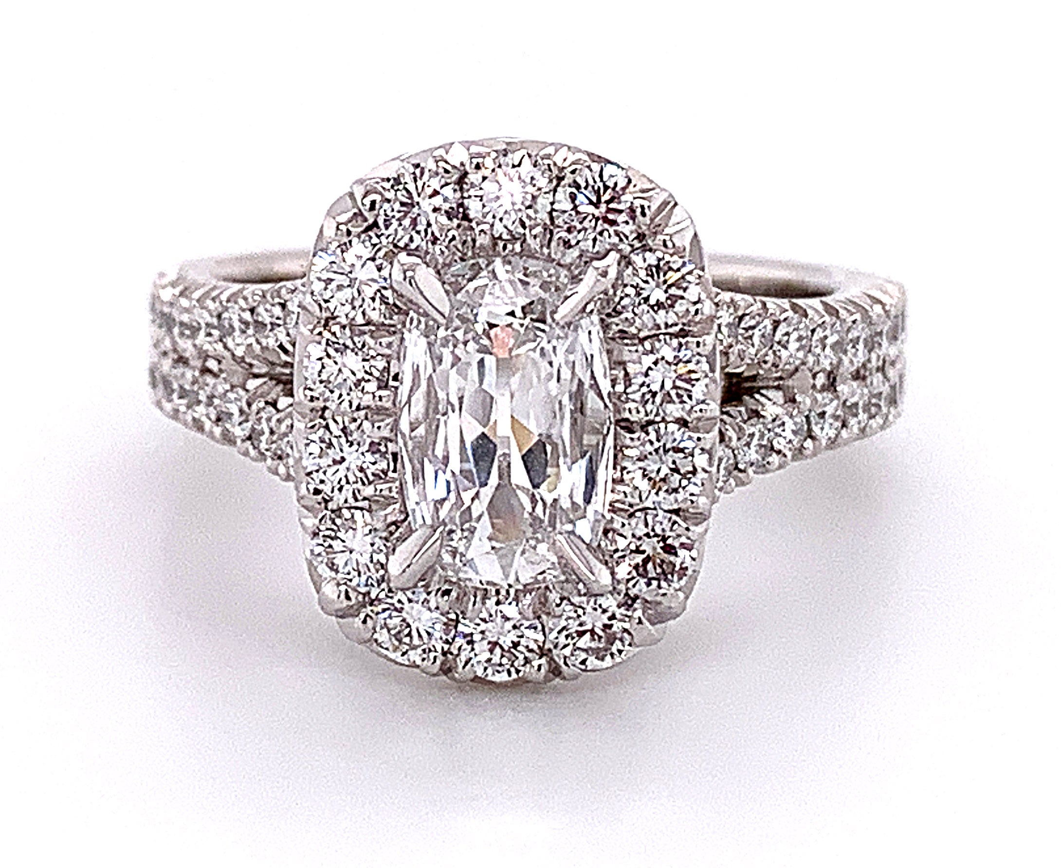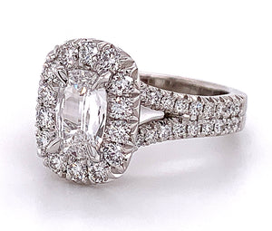 This particular ring is signed by Henri Daussi GIA certified center cushion cut diamond. Metal: 18kt White Gold Center Diamond: Cushion Side Diamonds: Round brilliant Center Diamond Quality: D-color, VVS2-clarity Center Diamond Weight: 0.82ct Center Diamond Report: Henri Daussi Side Diamonds Weight: 50 Round Brilliant Cut 0.94ctw Setting: Pave Finish: High Polish