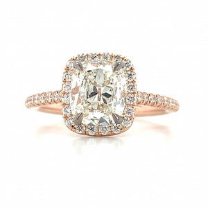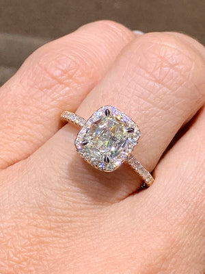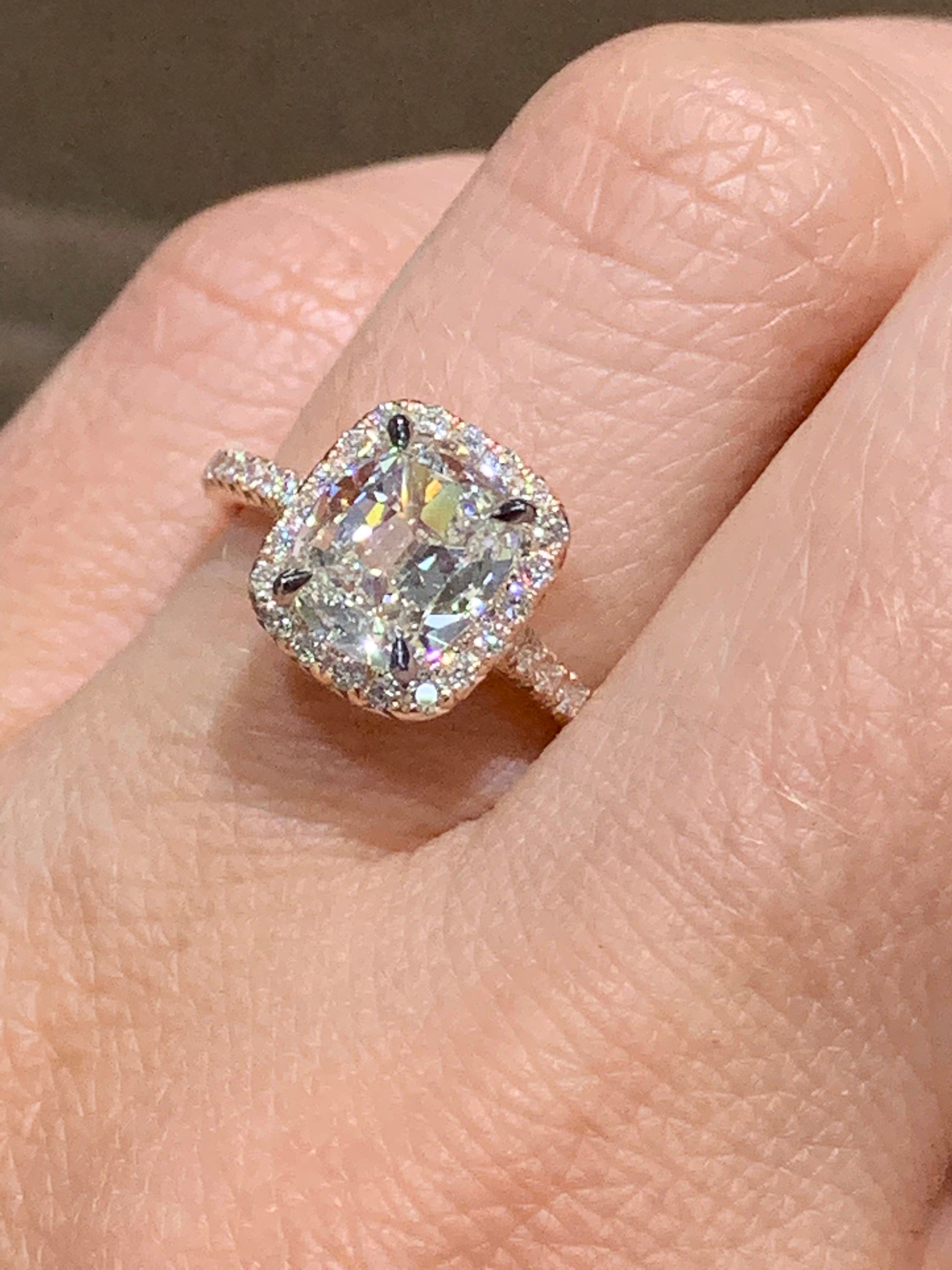 THIS HENRI DAUSSI ENGAGEMENT, ANNIVERSARY RING. DIAMOND HALO ARROUND ACCENTUATES CUSHION CENTER DIAMOND. DIAMONDS ON THE SINGLE SHANK ADDS ELEGANCE AND CONTINUITY. HENRI DAUSSI CERTIFIED CUSHION CENTER DIAMOND .