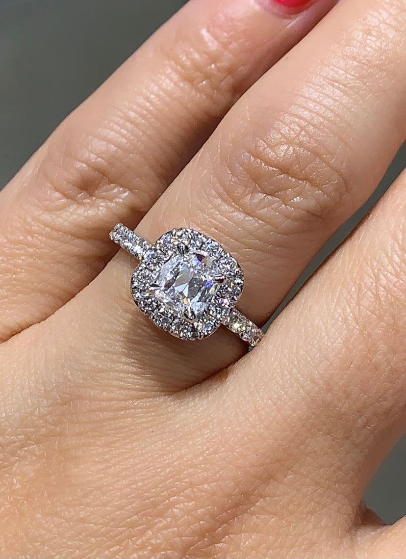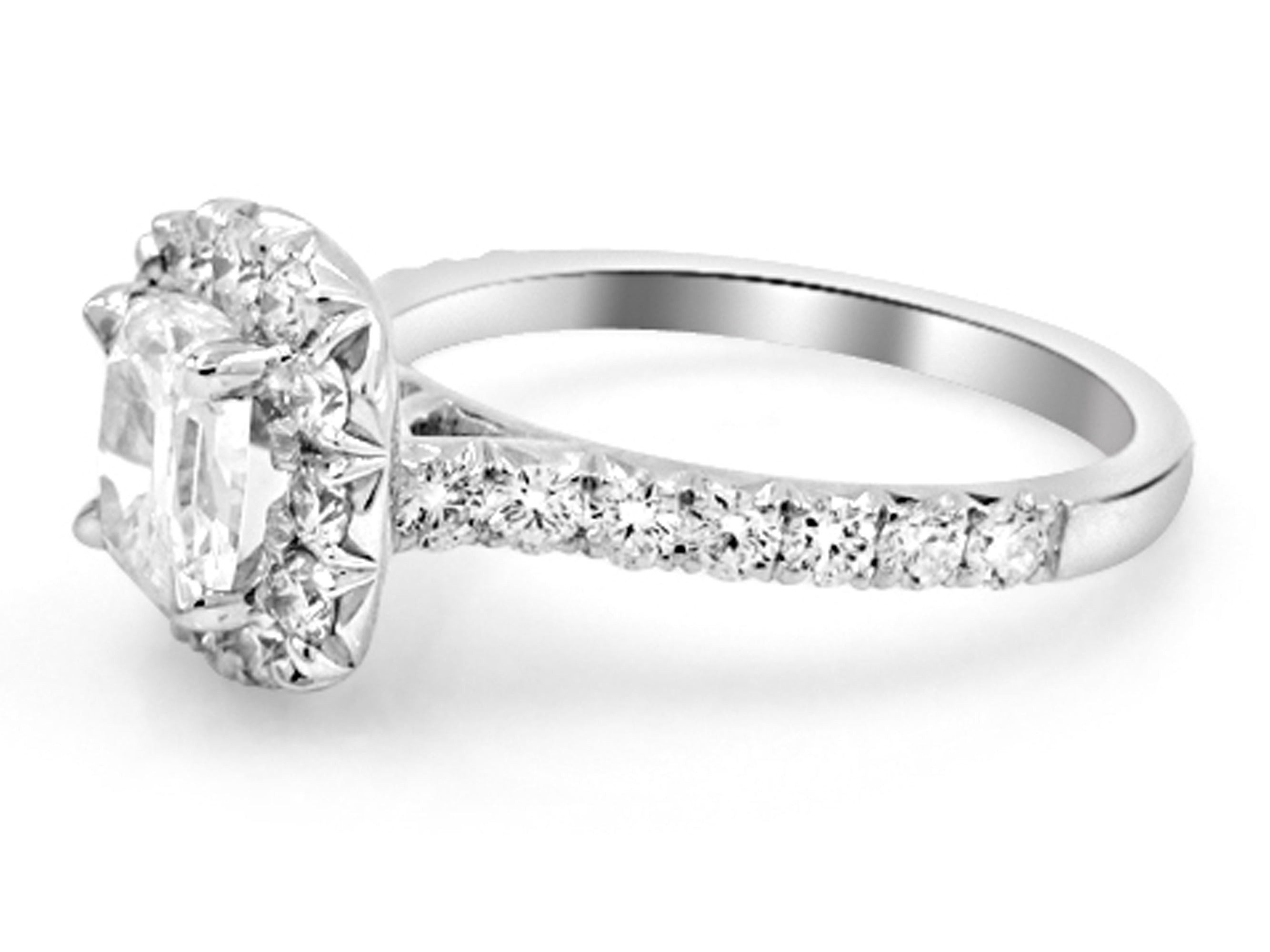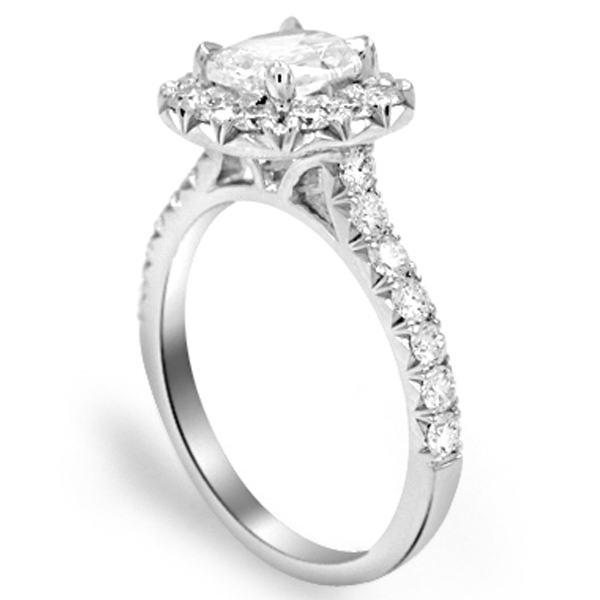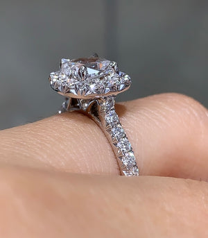 Henri Daussi diamond engagement ring featuring a pave halo and totaling approximately 1.67 carats. This ring comes with GIA certificate, signature cushion cut in the center. Metal: 18K White Gold Cushion Center: 0.90 ct Halo, Side: 0.77 ct Color: D Clarity: VS2 Certified: GIA