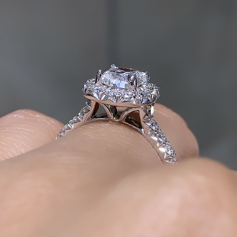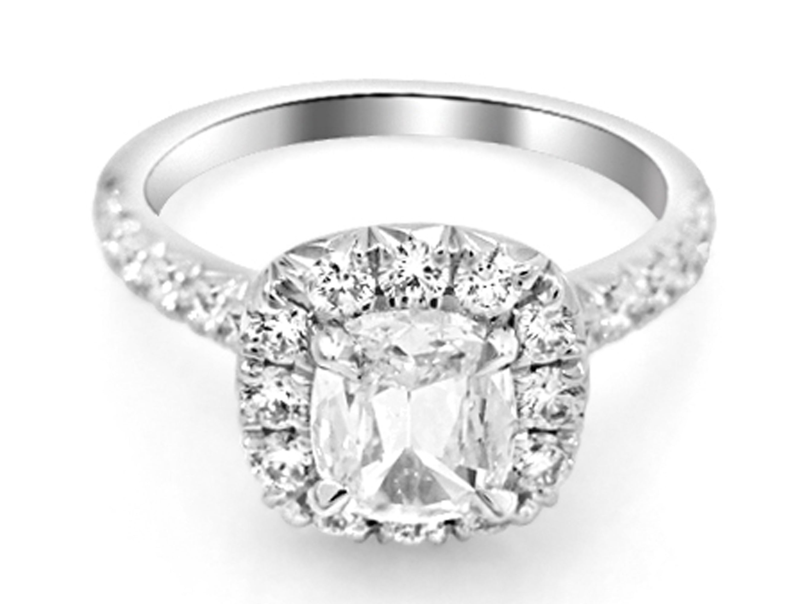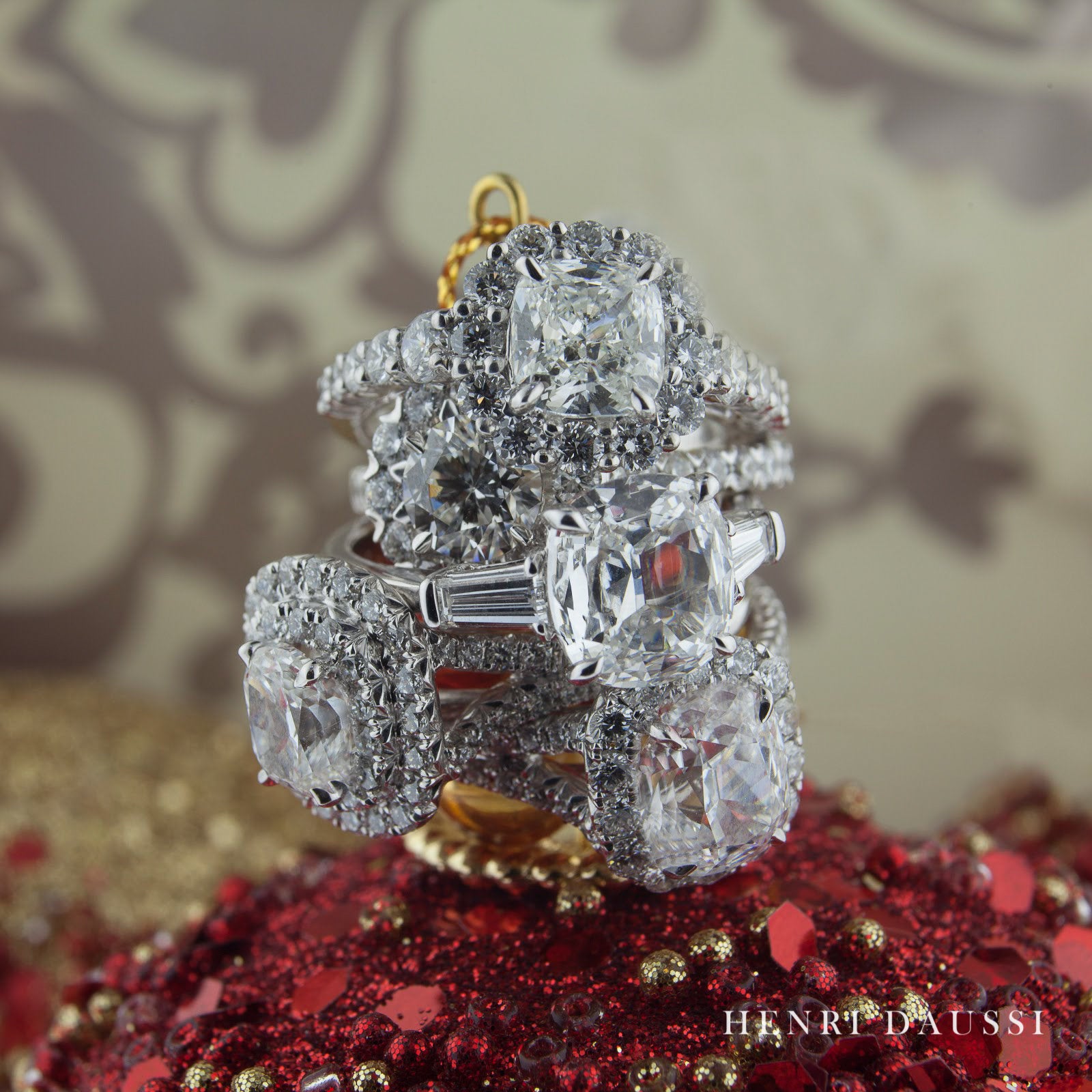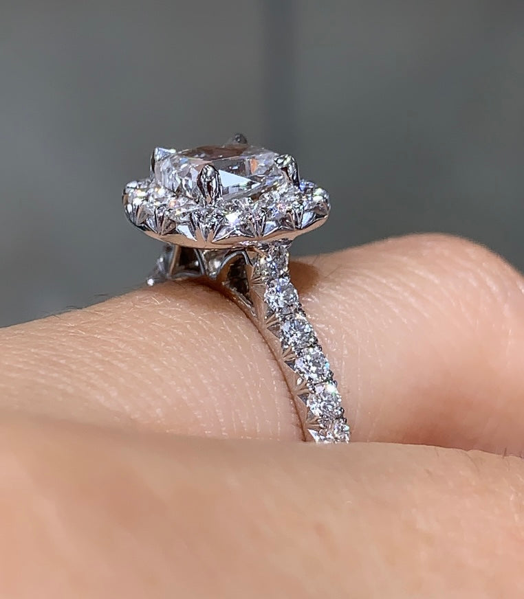 Henri Daussi diamond engagement ring featuring a pave halo and totaling approximately 1.67 carats. This ring comes with GIA certificate, signature cushion cut in the center. Metal: 18K White Gold Cushion Center: 0.90 ct Halo, Side: 0.77 ct Color: D Clarity: VS2 Certified: GIA