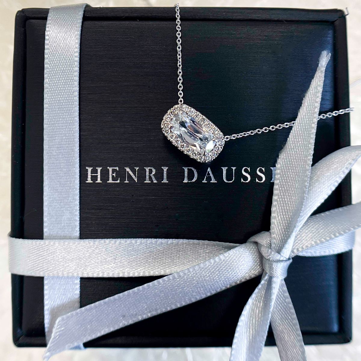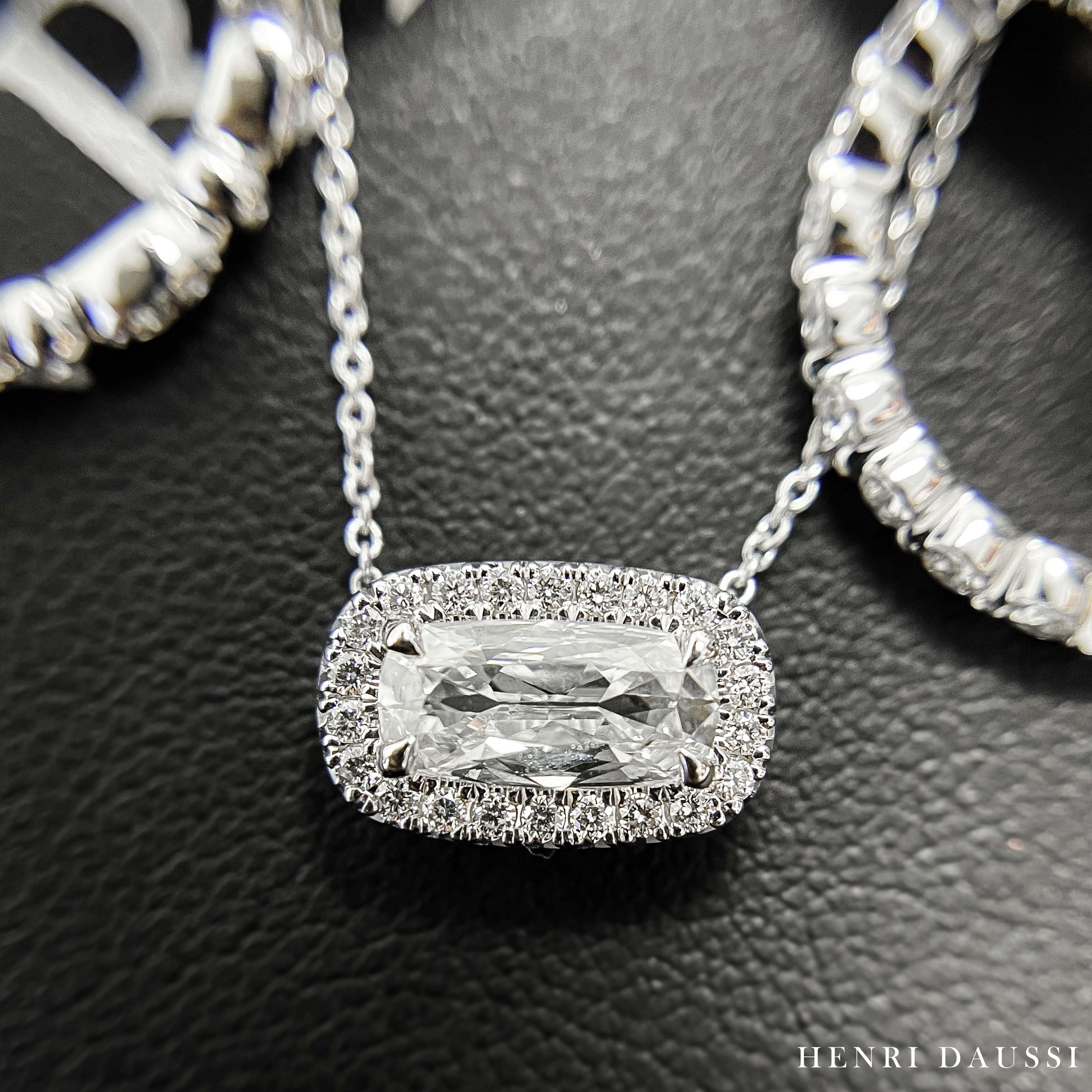 Make a luxurious statement with this Henri Daussi Designer Signed 0.82ct t.w. diamond cushion brilliant cut halo east-west set solitaire pendant necklace. This exquisite piece features an exquisitely cut 0.70ct center diamond, accompanied by a halo of smaller diamonds to create a truly stunning look. Delight in the beauty of luxury and unsurpassed craftsmanship with this gorgeous necklace.