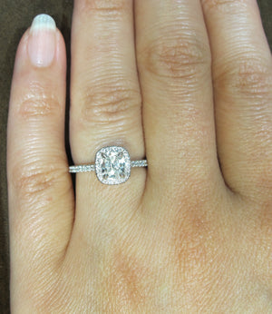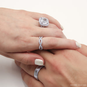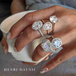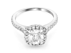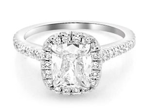 Make a timeless style statement with this Henri Daussi cushion halo engagement anniversary ring. Crafted with a classic and sophisticated design, the ring features a round-cut center stone encompassed by a halo of smaller diamonds, all carefully set with designer precision. An elegant and enduring symbol of lasting love and commitment.