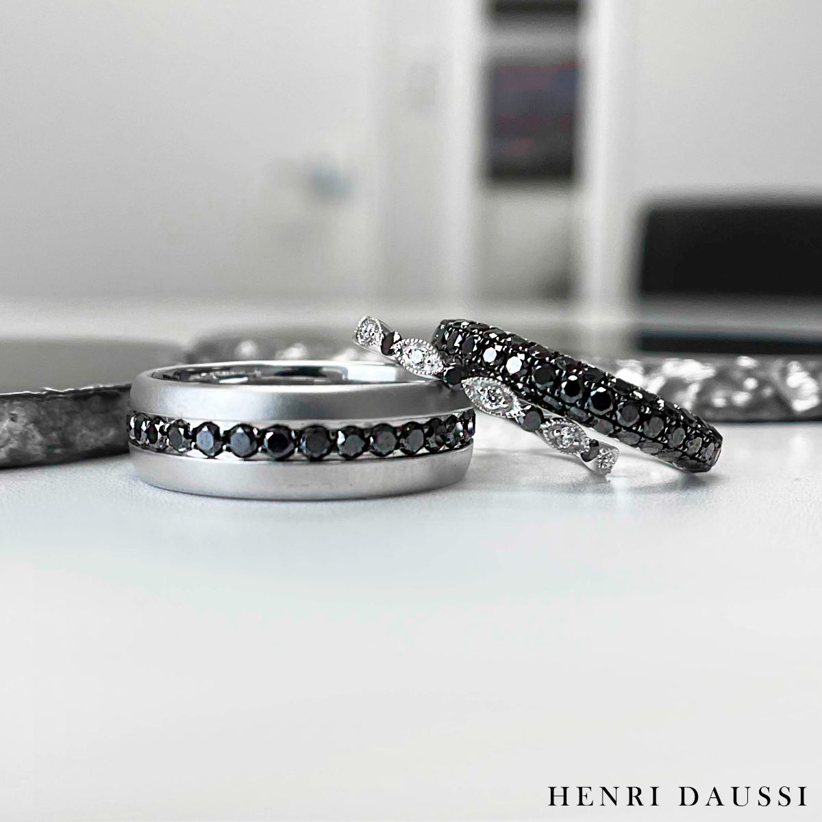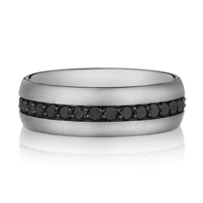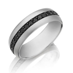 This Henri Daussi white gold men’s band features a matte finish with a single centerline around black diamonds.