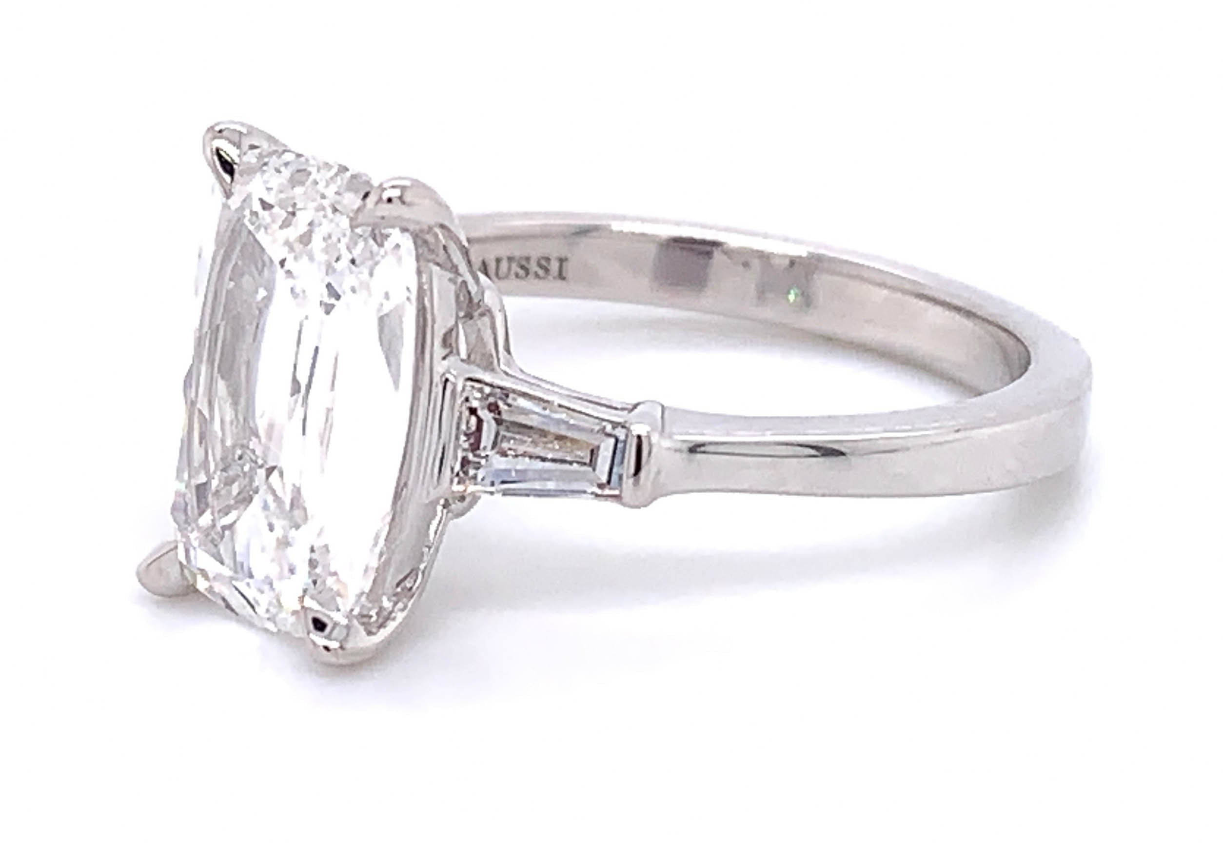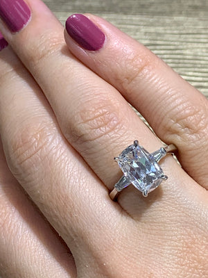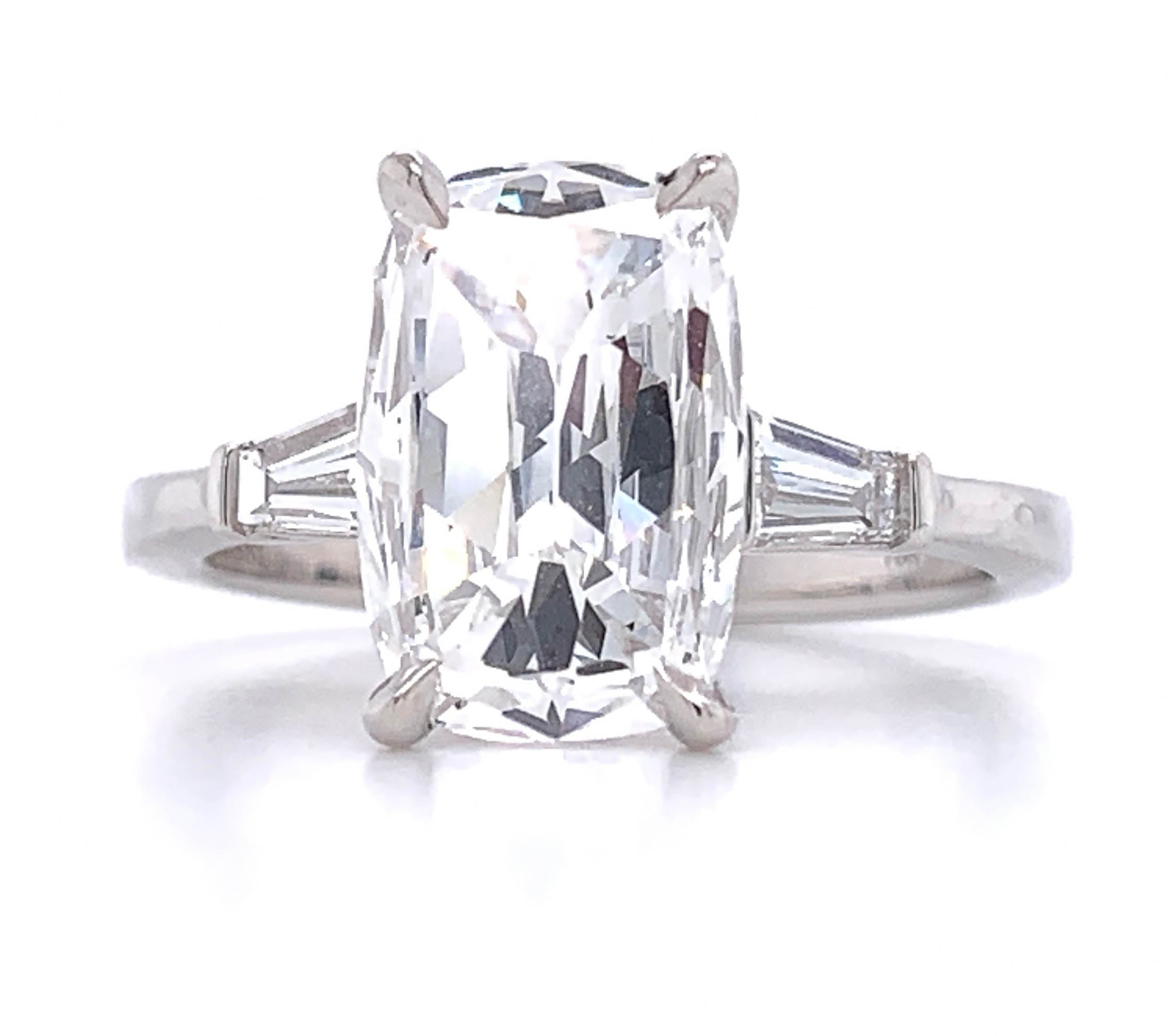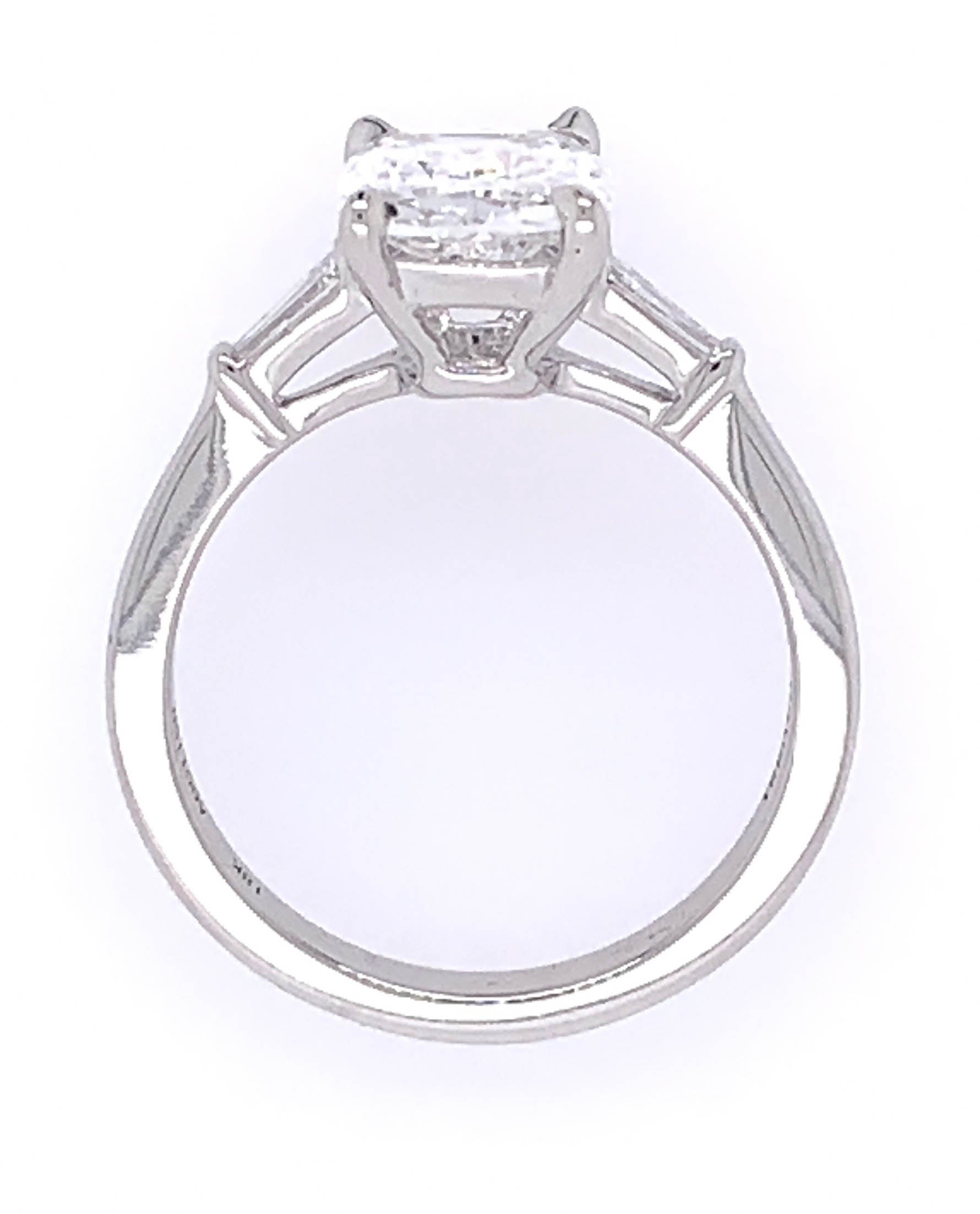 The classic design has been around for years and never goes out of style. Absolutely best seller! 18KT White gold three stone diamond engagement ring in a four-prong style setting. Center Cushion diamond is of 2.10 carat and is GIA certified D color VVS1 clarity, two trapeze cut side diamonds are of 0.30carats total Metal: 18KT White Gold Center Diamond Shape: Cushion Center Diamond Carat Weight: 2.10ct Center Diamond Color: D Center Diamond Clarity: VVS1 Center Diamond Certificate: GIA Side Diamonds Shape: 2 Trapeze Side Diamonds Weight: 0.30ct t.w.