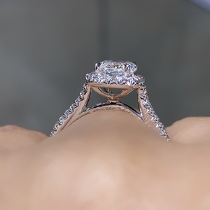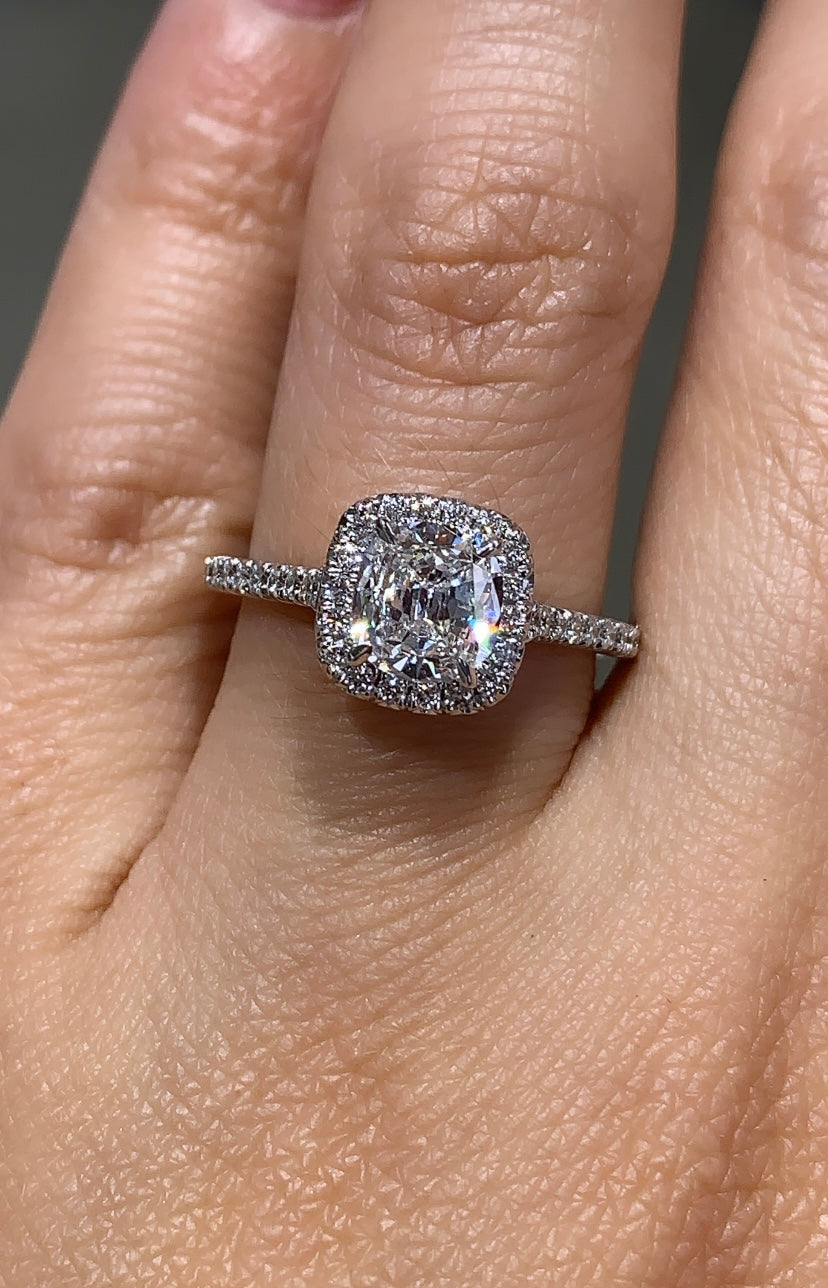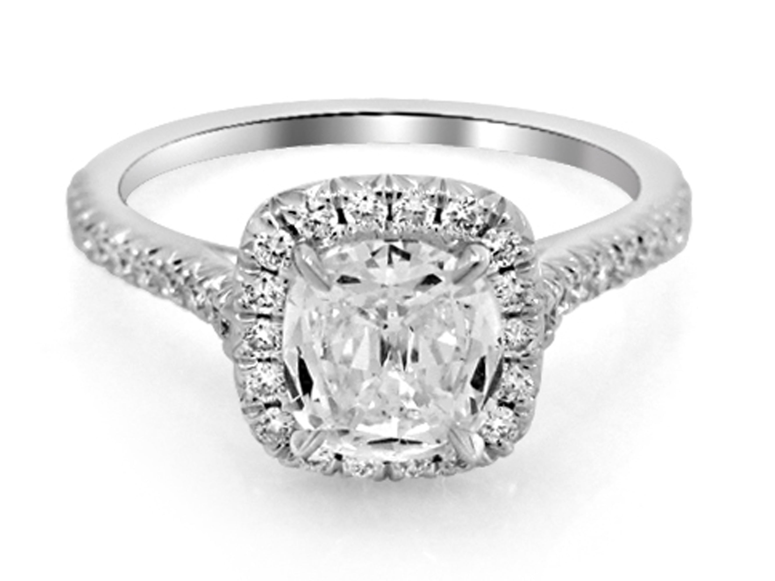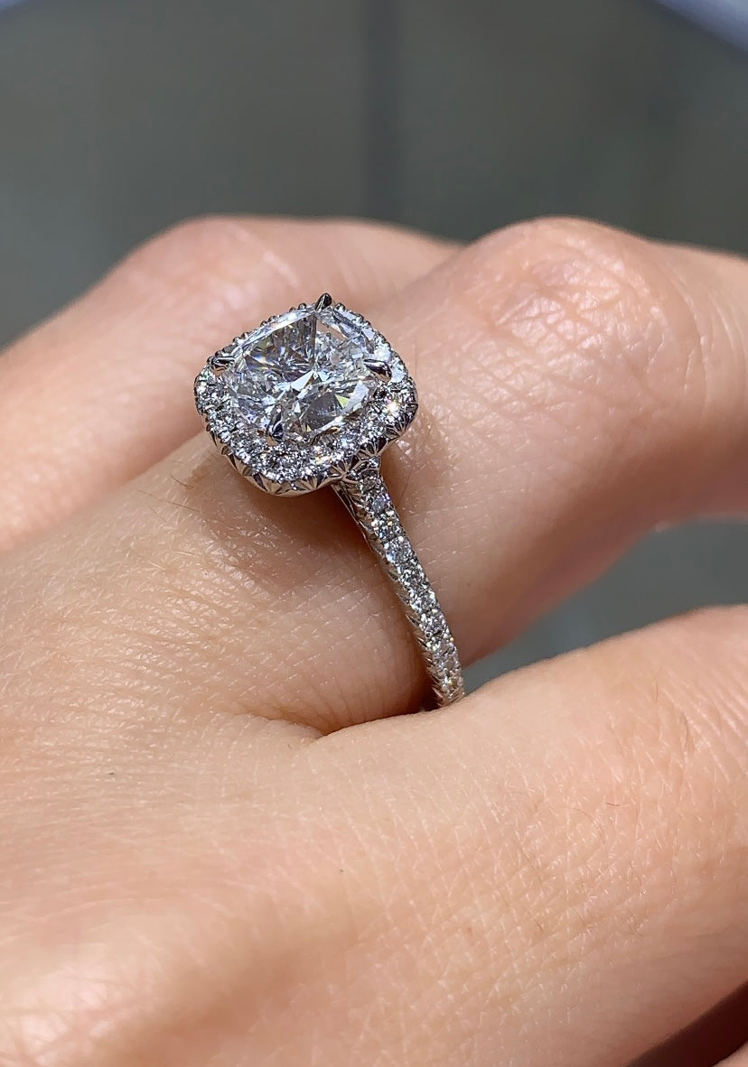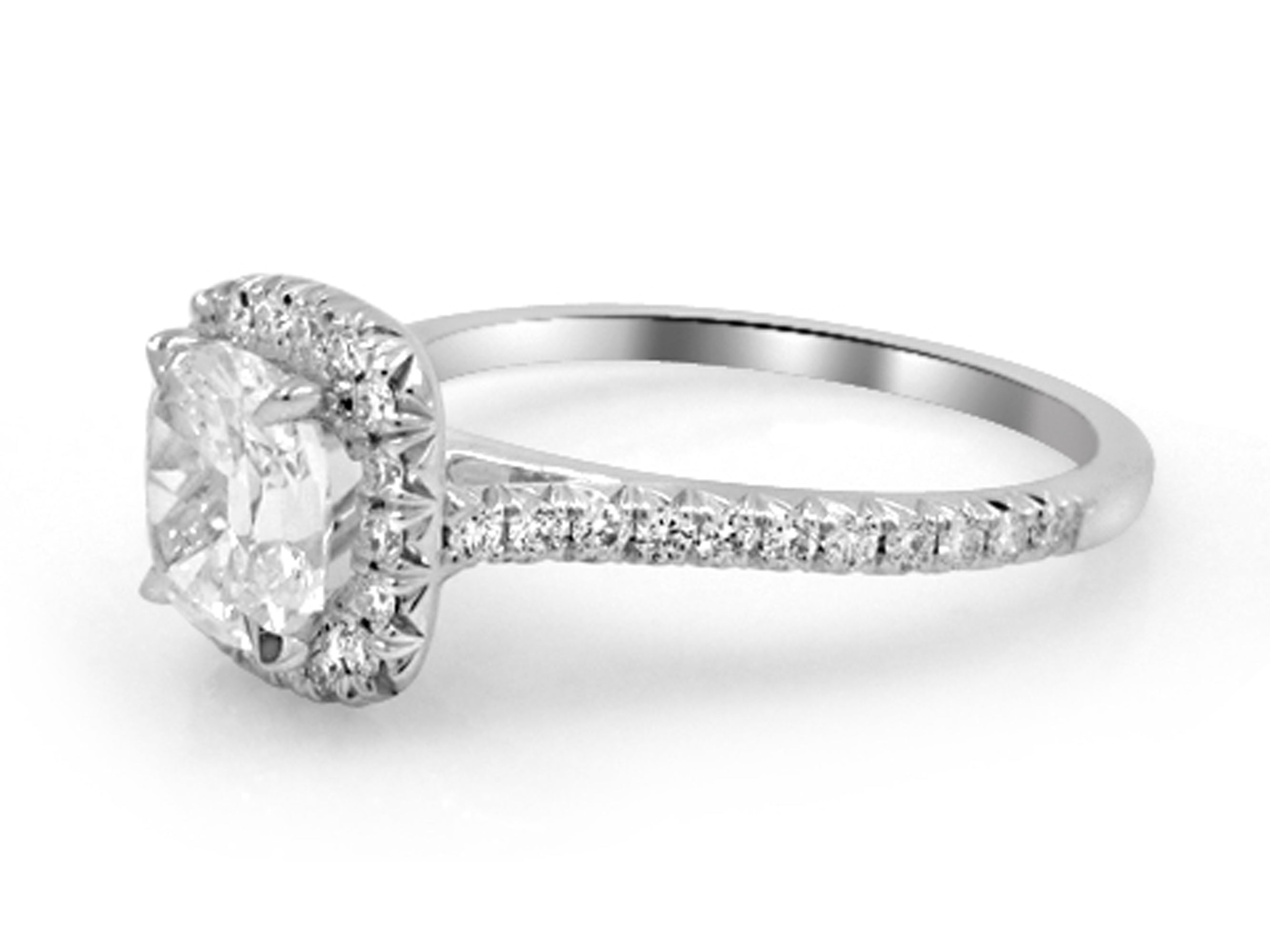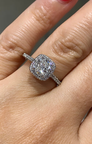 Henri Daussi Diamond Engagement Ring Metal: 18K White Gold Diamond: 1.06carat Cushion Cut Diamond Details: G color - VS1 clarity Pave: Round white 0.31ct tw diamonds Certified: GIA