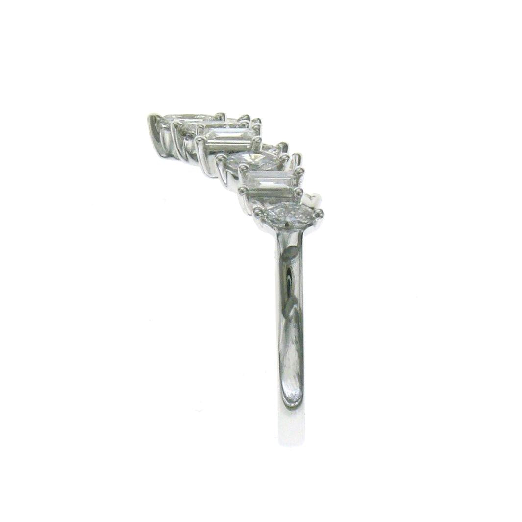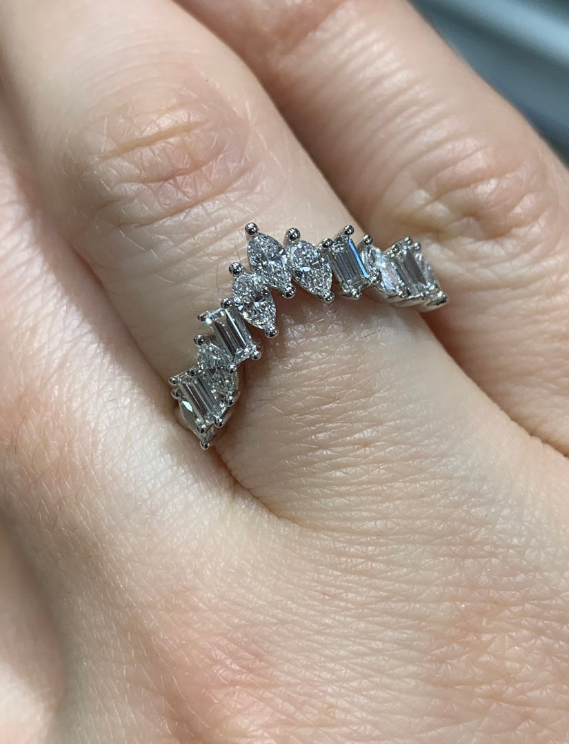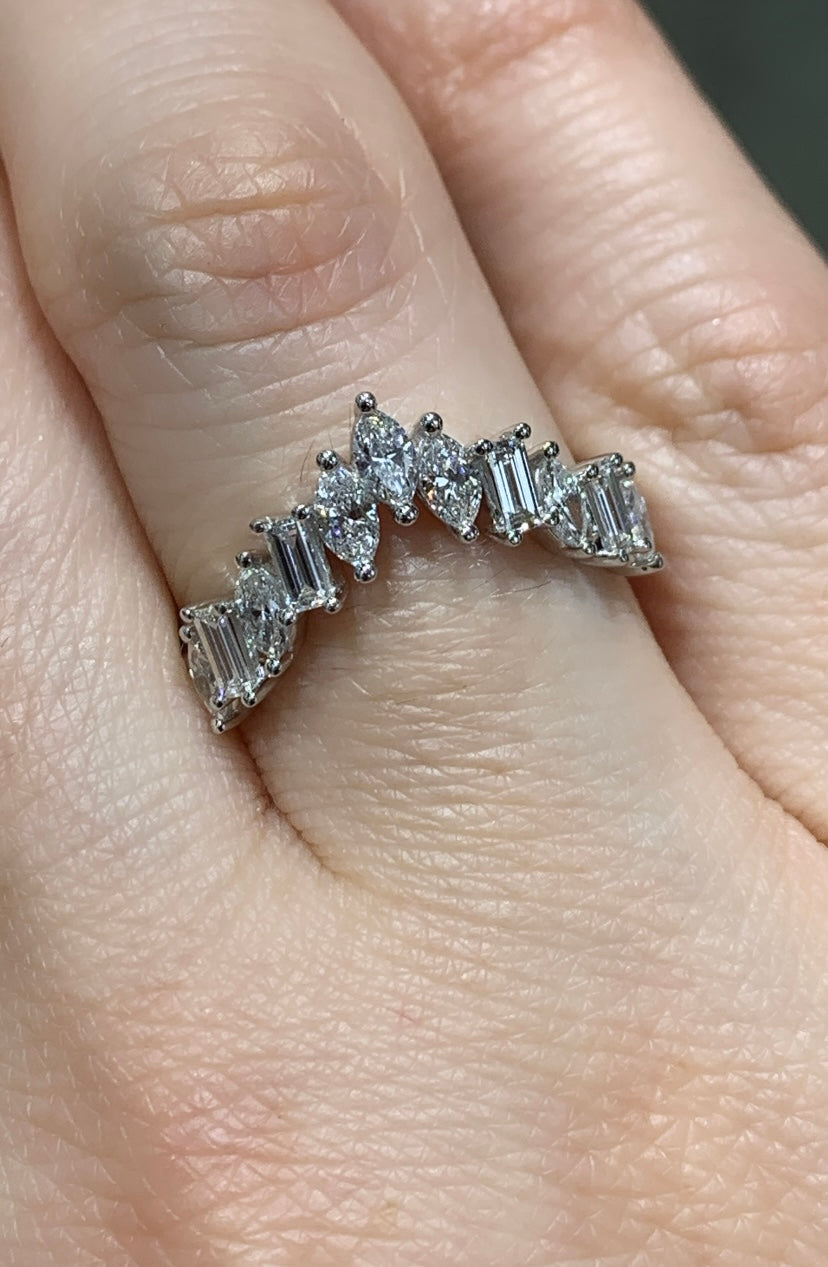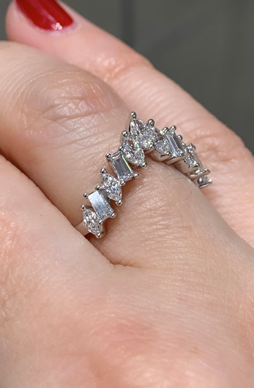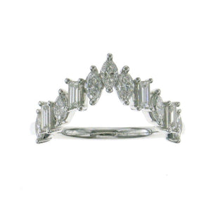 Make a bold statement with this 1.40ct tw Ladies Curved Diamond V-Shape Crown Ring. Its elegantly curved design and sparkling diamonds create a regal look that captures attention and elevates any outfit.