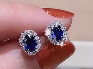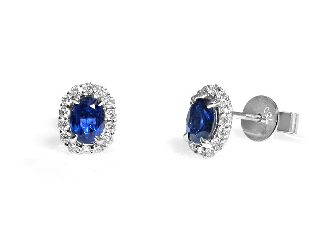 Oval shape blue sapphires and diamond stud earrings are a thing of beauty made in 18K white gold and set with 28 round diamonds these earrings are dainty and elegant. Stud earrings are a must-have for every women's jewelry collection, so we think that you should snag a set for yourself, as well as a pair for a love one in your life. They make for a wonderful gift giving option. Metal: 18KT White Gold Diamond Weight:(28) 0.27ctw Center Stones (2): Sapphires Sapphires Weight: 1.02ct t.w Earring Length: 9.5mm Backing: Push Backs