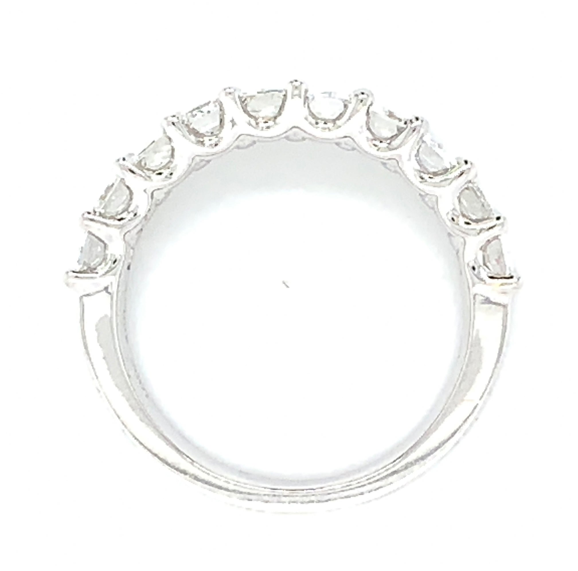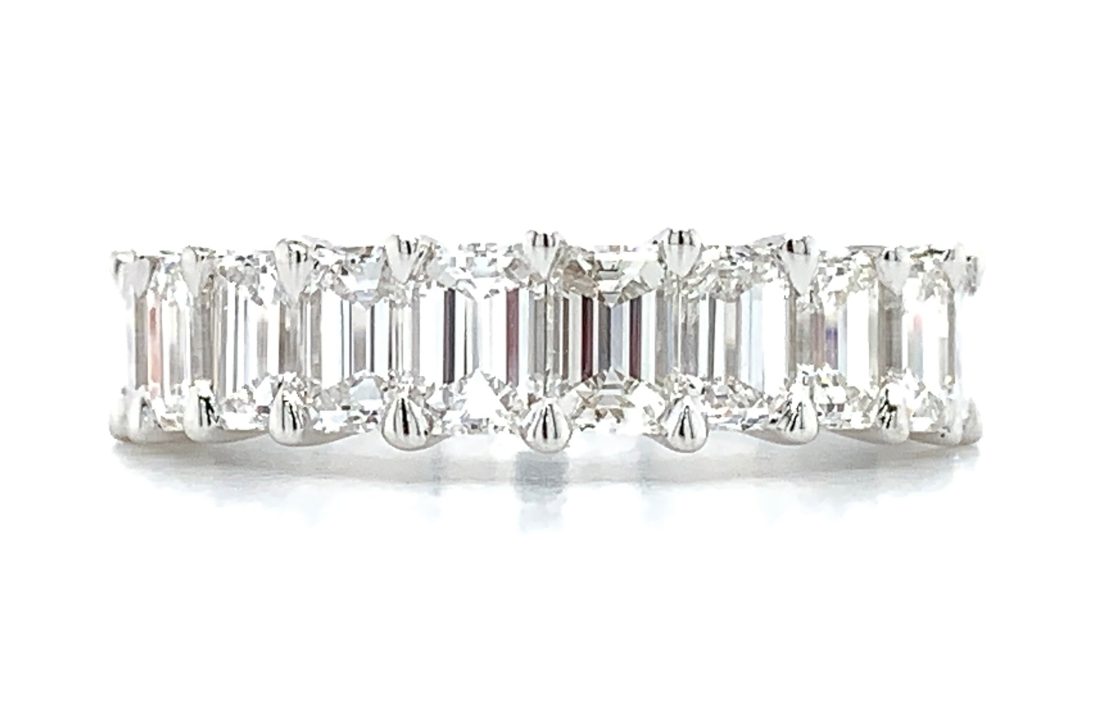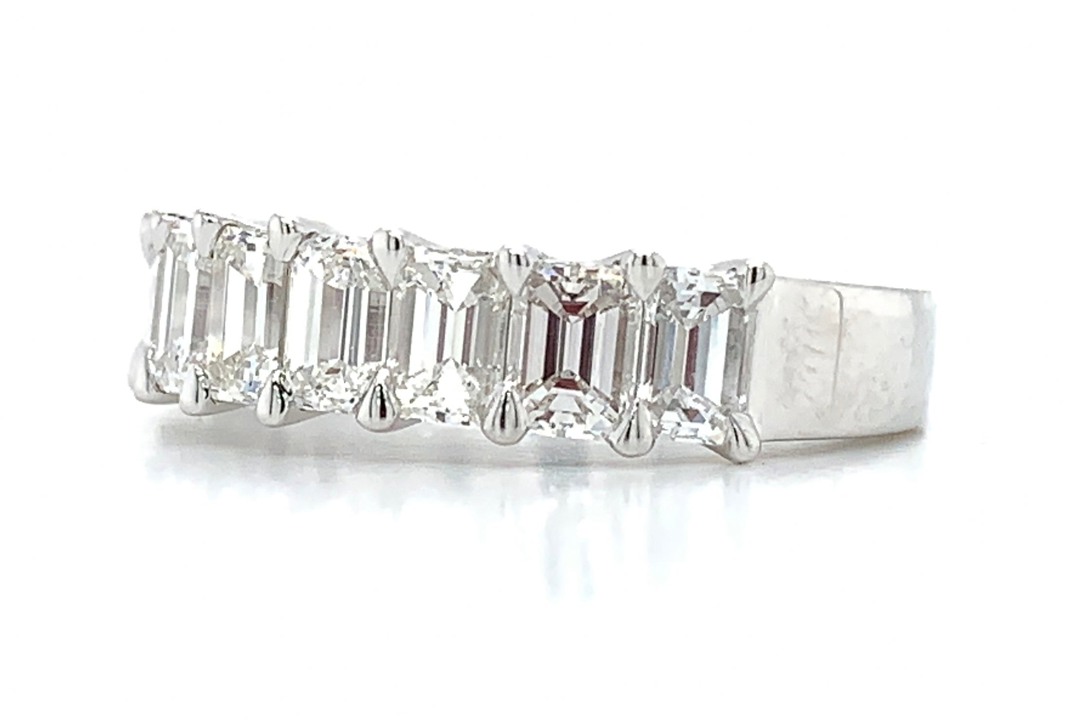 This diamond ring showcases perfectly matched emerald-cut diamonds set in gold. Metal: 18Kt White Gold Diamonds: 10 Emerald Cut Diamonds 2.48cts Ring Width: 5 mm
