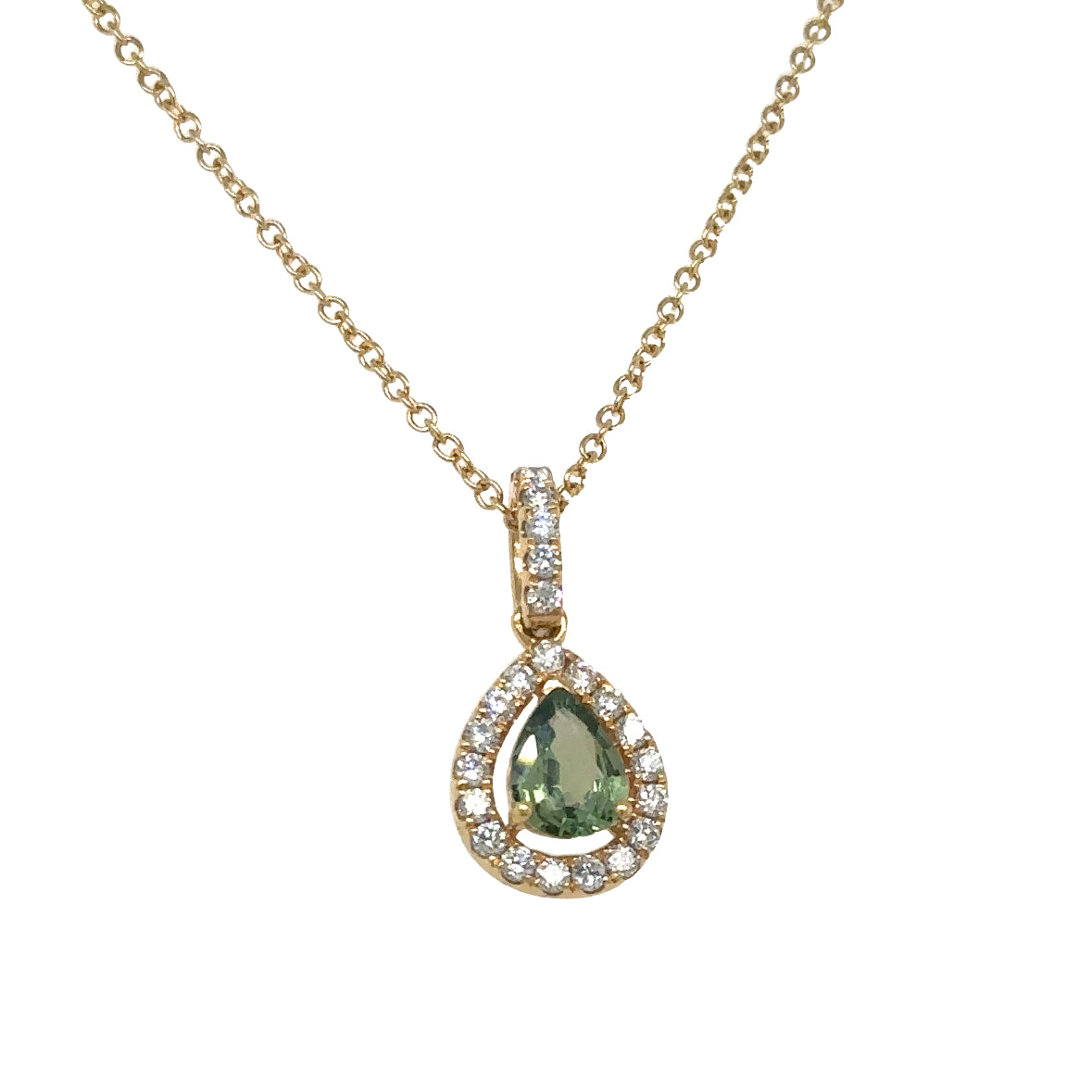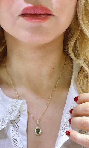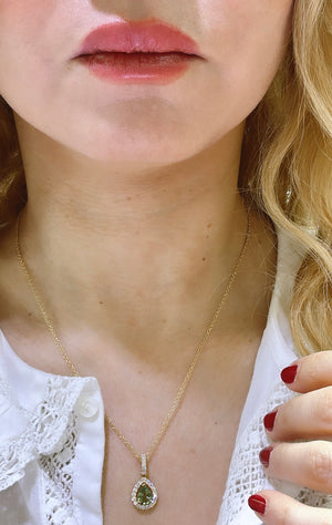This elegant pendant necklace features dazzling diamonds and stunning green sapphire, making it a must-have accessory for any special occasion. Let its sparkle and unique color add a touch of glamour and sophistication to any outfit. Put on this necklace and prepare to turn heads and steal hearts!
