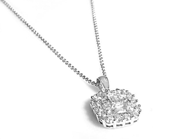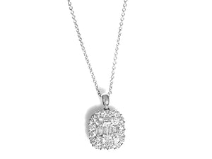Add a touch of sophistication by putting on this diamond pendant day or night. Encrusted with genuine diamonds that are round and a baguette in shape. The pendant is placed on a 16-inch chain