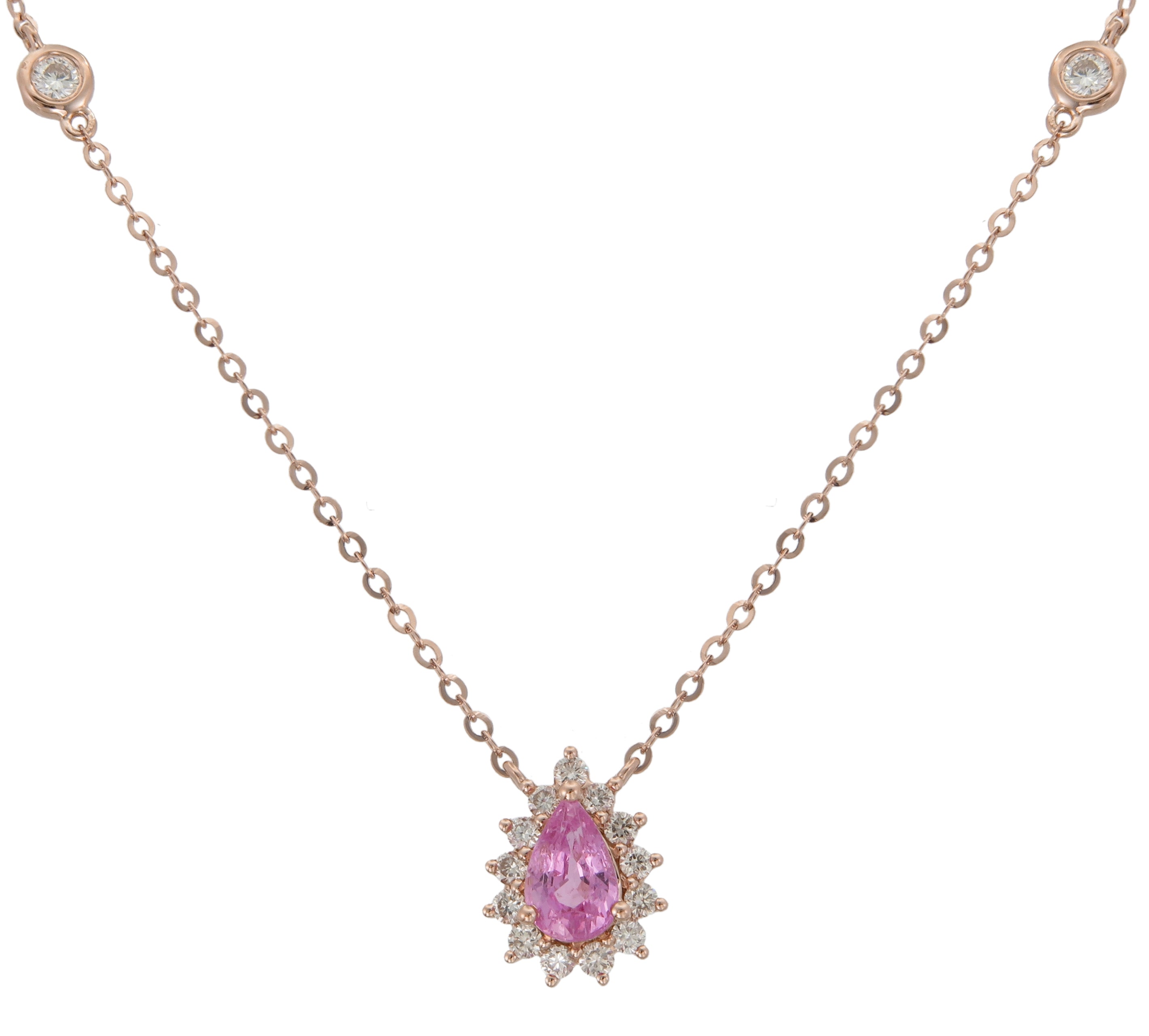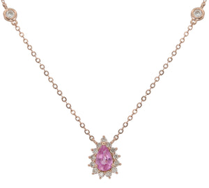 This Pink Sapphire and diamond pear shape pendant will be a great gift for your loved one. 15 diamonds and 1 pear shape pink sapphire form a beautiful piece of jewelry.
