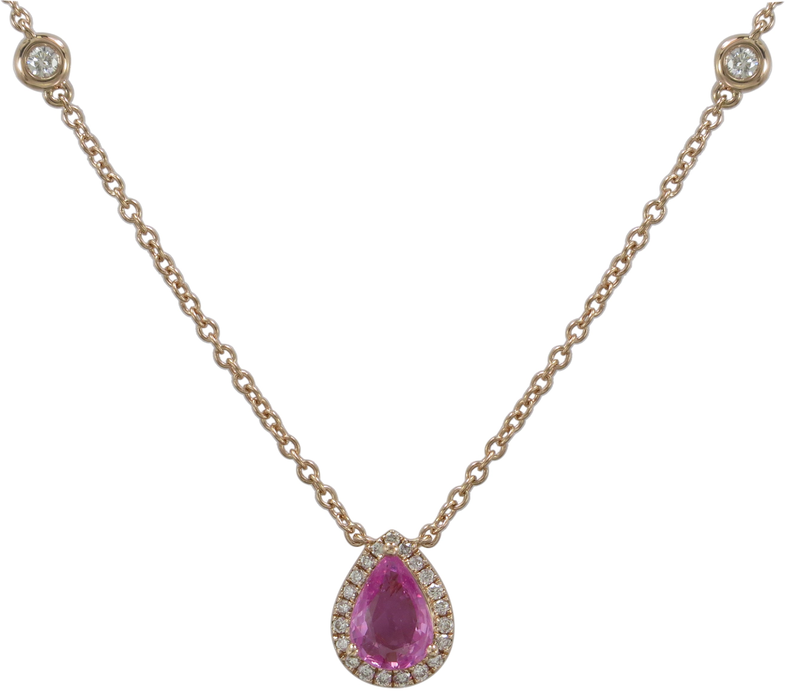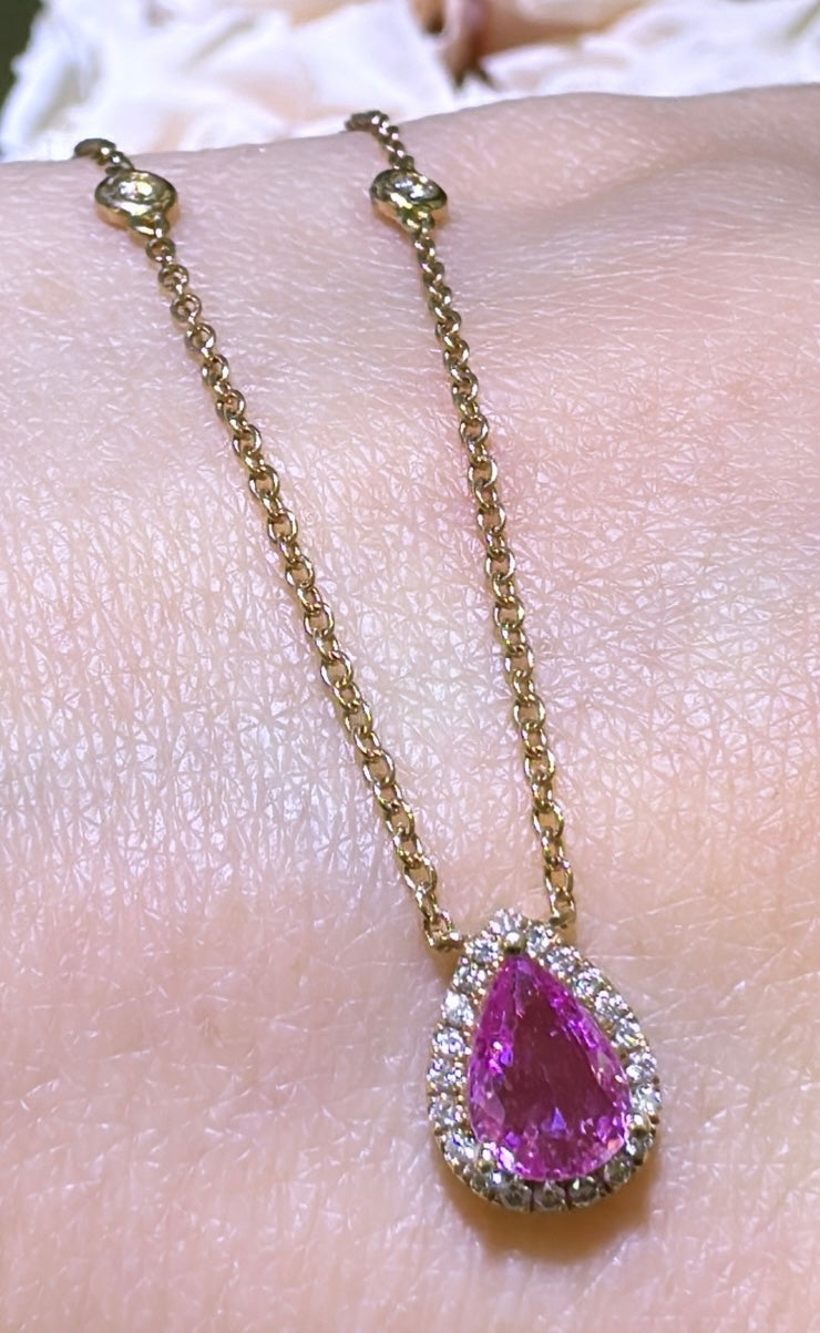 This Pink Sapphire and diamond pear shape pendant will be a great gift for your loved one. 25 diamonds and 1 pear shape pink sapphire form a beautiful piece of jewelry.