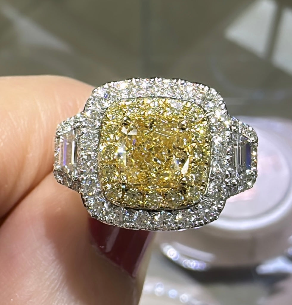 Experience the beauty of this 2.41ct tw Ladies Fancy Yellow Center Trapezoid Side Diamond Ring! Featuring a stunning center diamond with two trapezoid side diamonds, this ring radiates luxurious charm. Let its sparkle and luster be the perfect complement to your exquisite style!