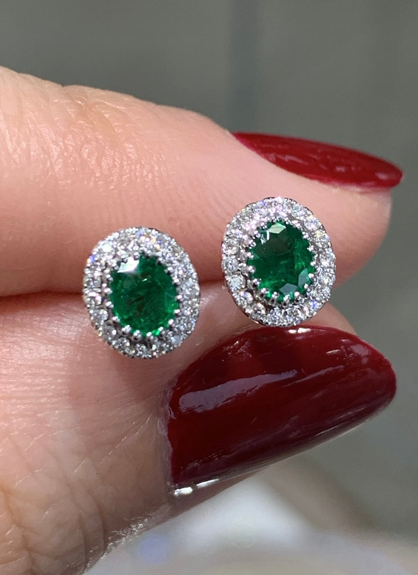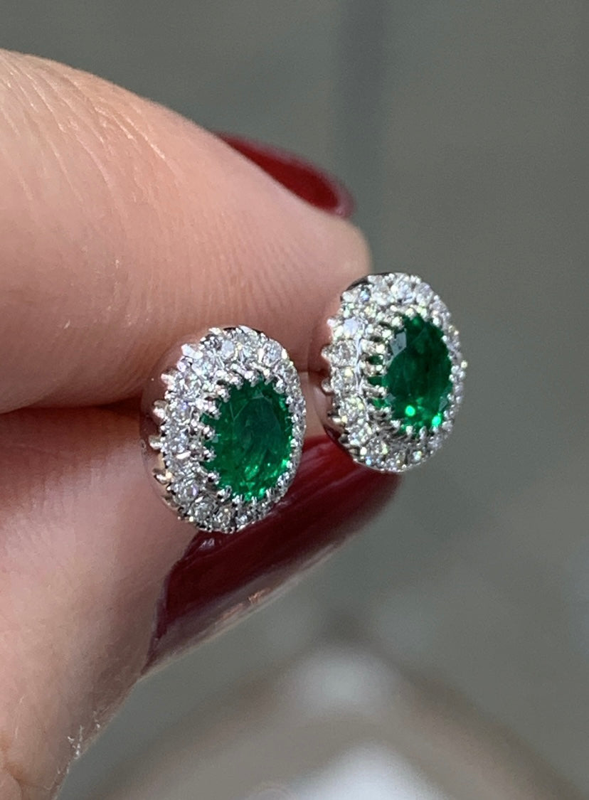 Vivid green oval-cut emerald and diamond stud earrings are very elegant. The color is so lovely and bubbly.