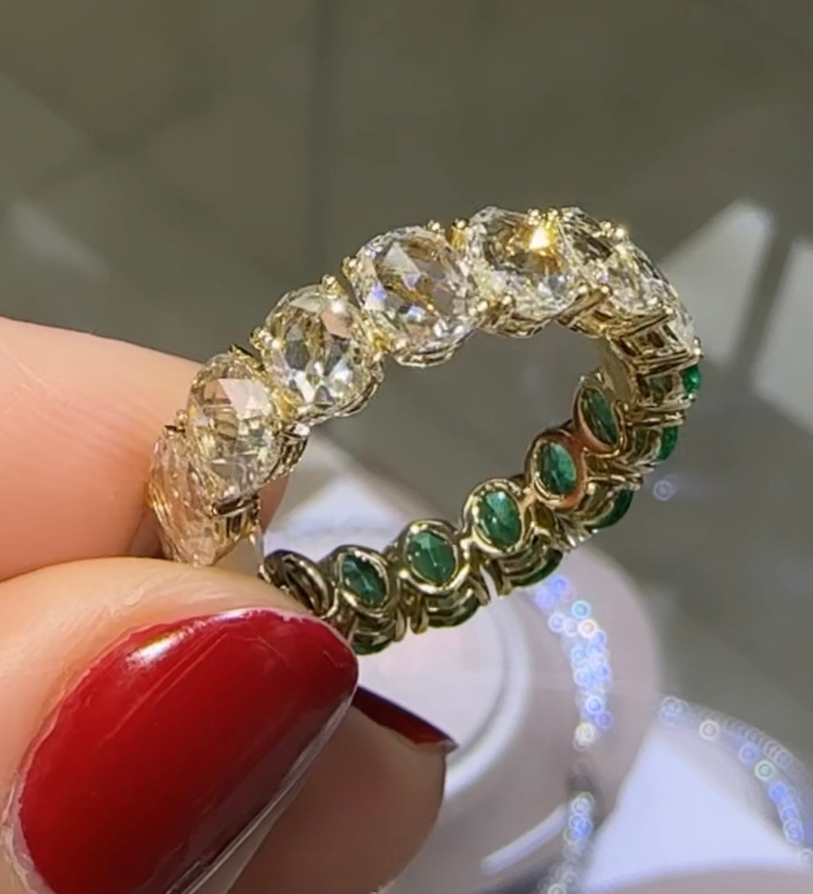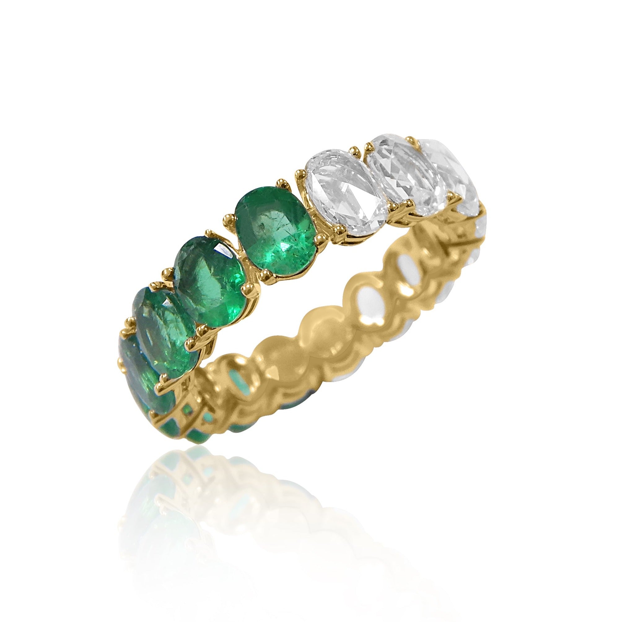 Rose-cut diamonds oval shape and has gorgeous facets. For extra sparkle, it has been made with 2.48ctw oval cut emerald.