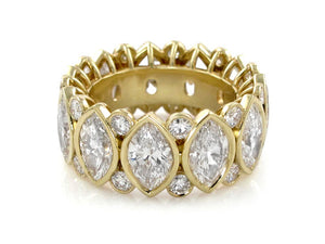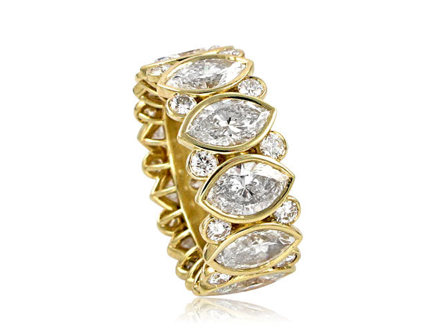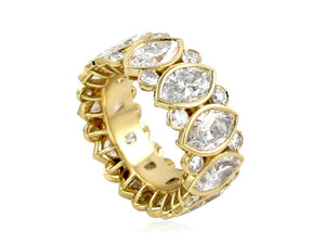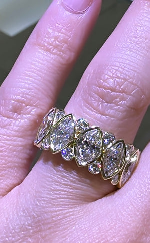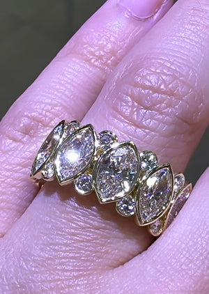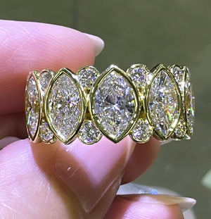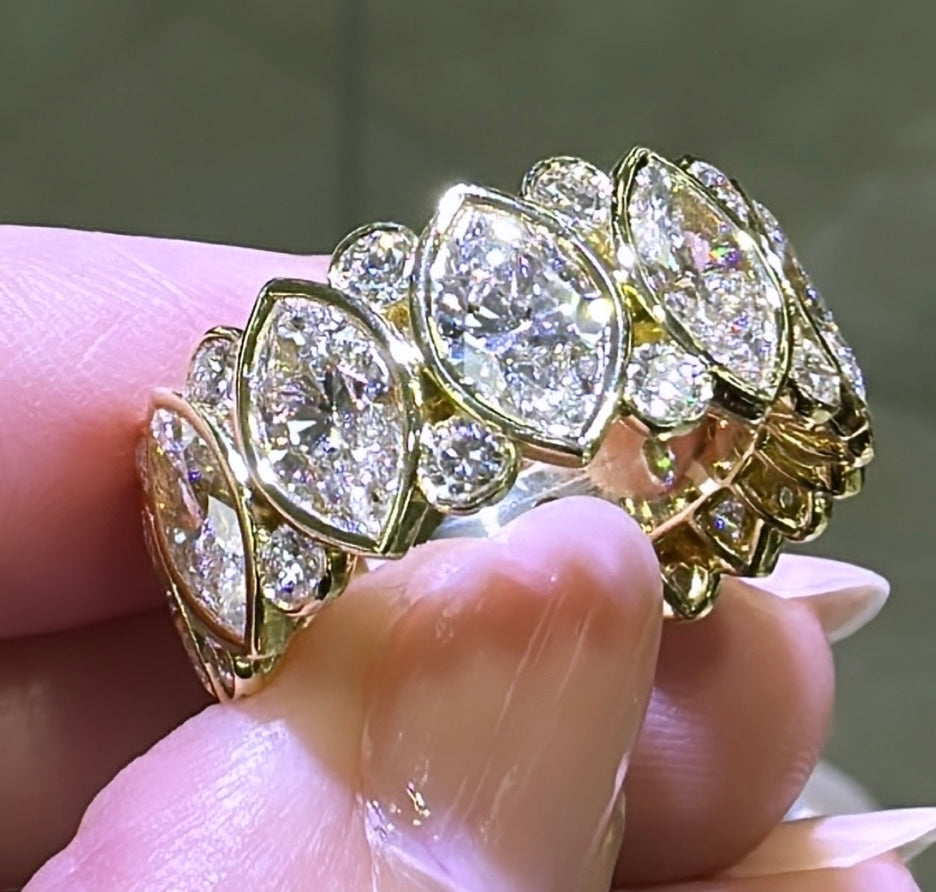 Calling all glamouristas! This is one jewelry design that you are going to want to see. Our couture Marquise diamond heirloom anniversary ring is one fierce design. It has been inlaid with a total of 11 Marquise Cut Diamonds and 22 Round Cut Diamonds of 8.98cts total carats. Polished to perfection it gleams beautifully in any light. Stunning ring that will make you feel so luxurious. When you want to make a big statement this is the ring for it. Metal: 18KT Yellow Gold Diamonds: 11 Marquise Cut Diamonds 7.85cts, 22 Round Cuts 1.13cts Quality: G color, SI clarity Ring Width: 10mm