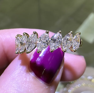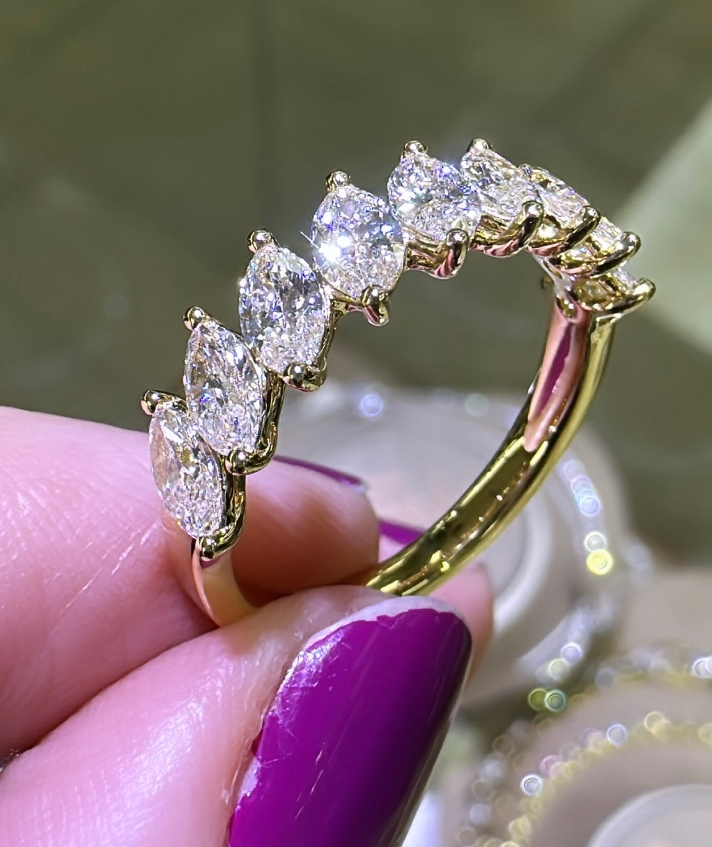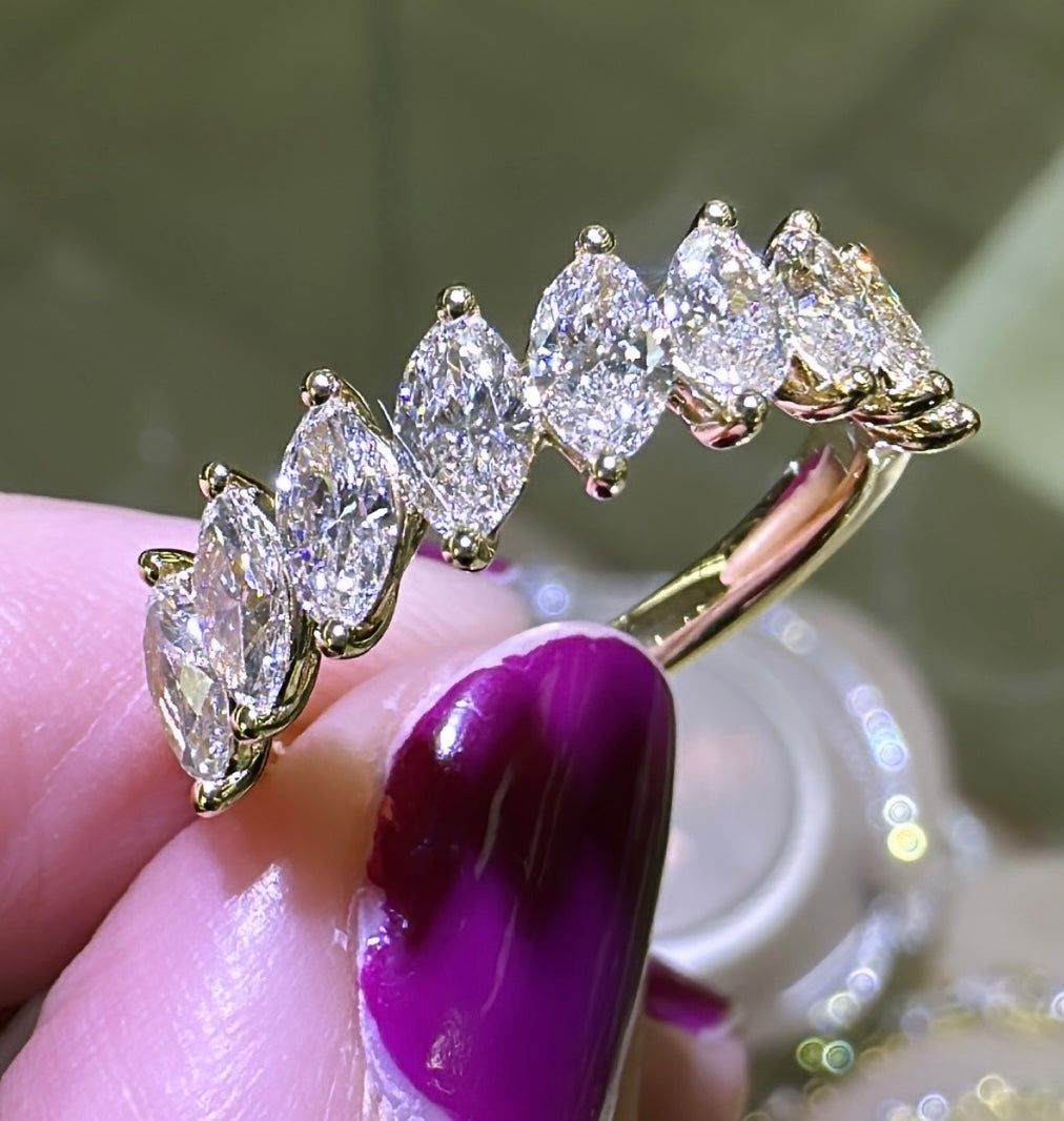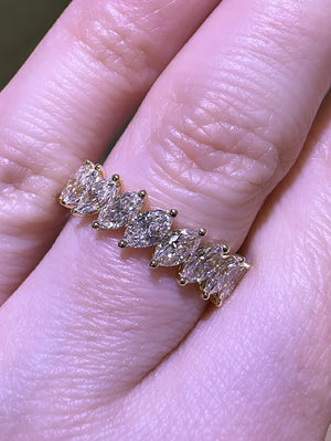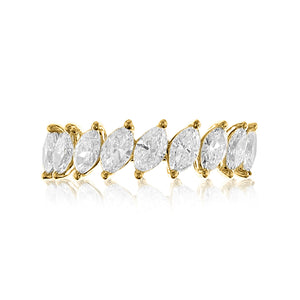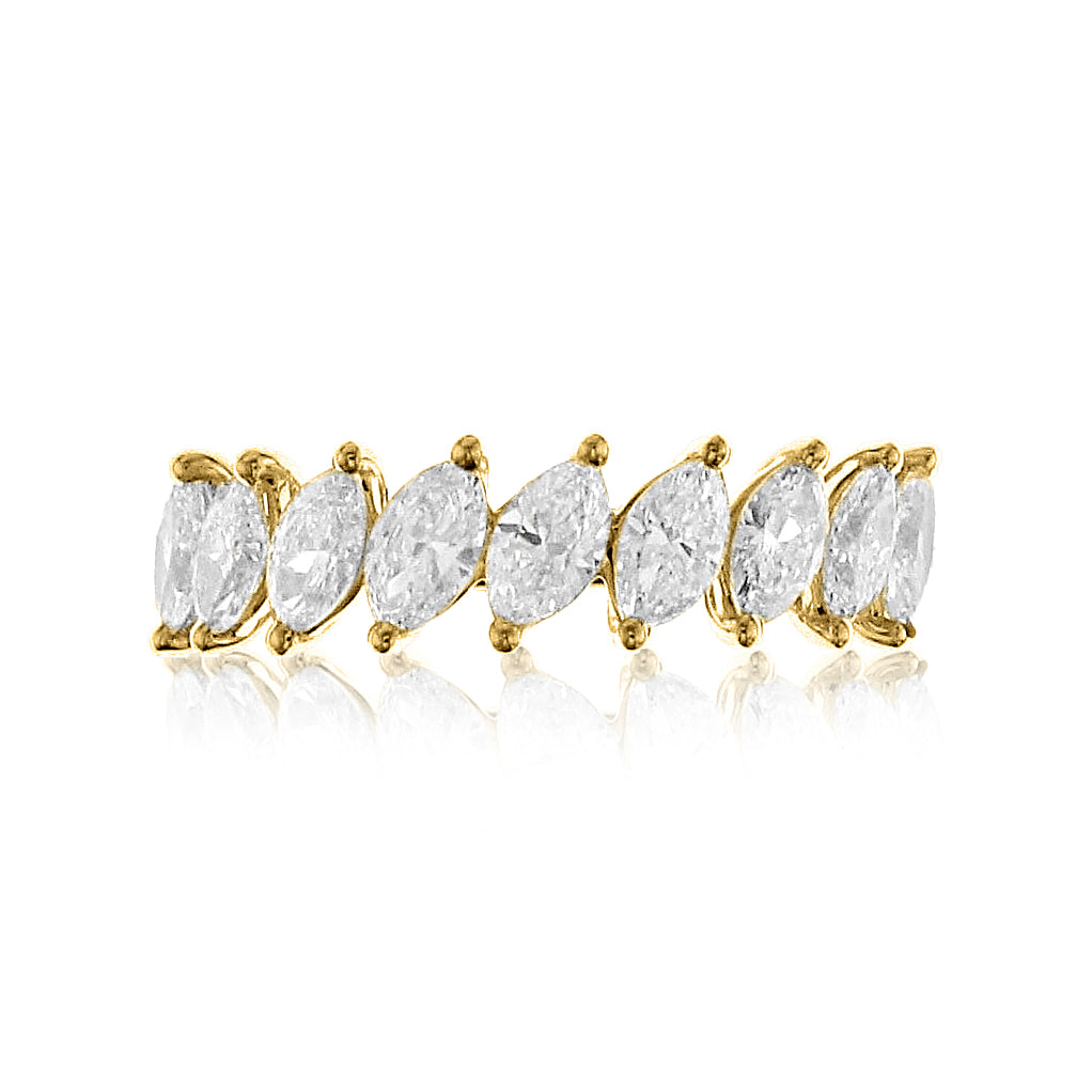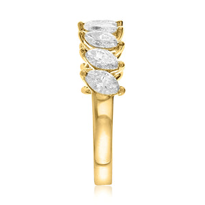 Ladies diamond eternity ring made with 18K yellow gold and is prong set with 9 marquise diamonds. Total carat weight 1.51ct t.w.