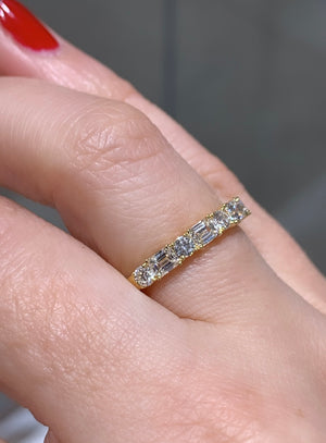 Stunningly crafted, this mixed-shape round & emerald-cut east-west set diamond ring offers a unique and beautiful sparkle. Combining the classic Round and Emerald-Cut styles, this 1.12ctw diamond ring is sure to turn heads and dazzle. Make a statement with this stunningly crafted ring!
