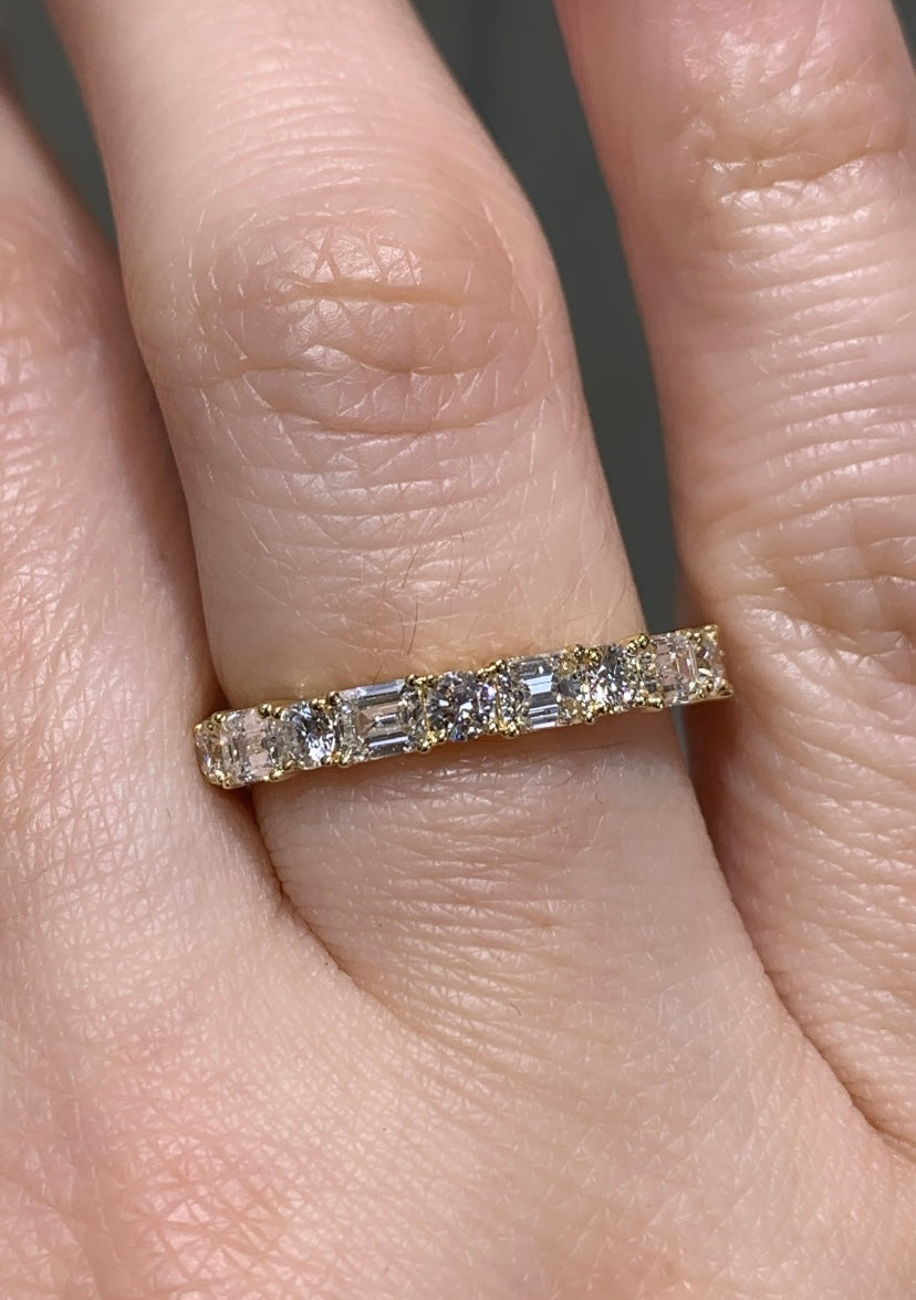 Diamond Weight: 6 Round Brilliant Cuts 0.38ct tw, 5 Emerald-cut diamonds 0.74ct tw W: 3mm