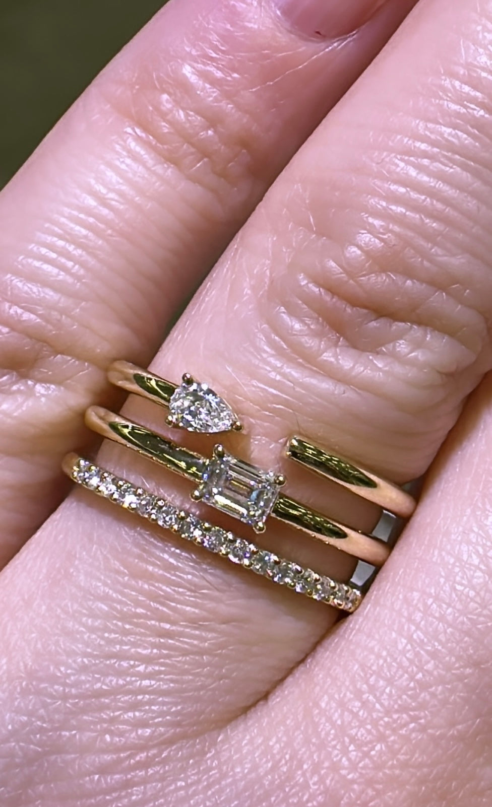 This stunning Mixed-shape Three Row 0.32ct tw Right-hand Diamond Ring is designed to make a statement. Featuring emerald-cut, pear-shape, and round diamonds, this ring will sparkle and shine to capture the love that has brought you together. Make a lasting impression with this unique ring - a testament to your unique style.