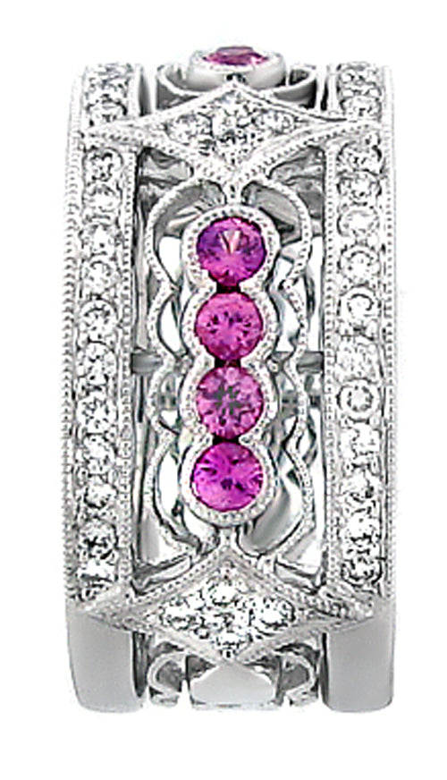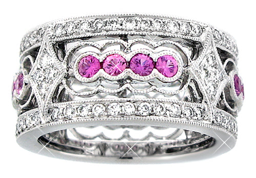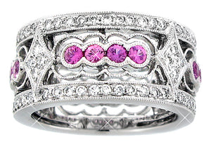 This beautiful Pink Sapphire And Diamond Fligre Ring is a timeless classic. With a stunning pink sapphire stones and dazzling diamond accents, it's a captivating addition to any jewelry collection. Make an unforgettable statement with this exquisite ring!