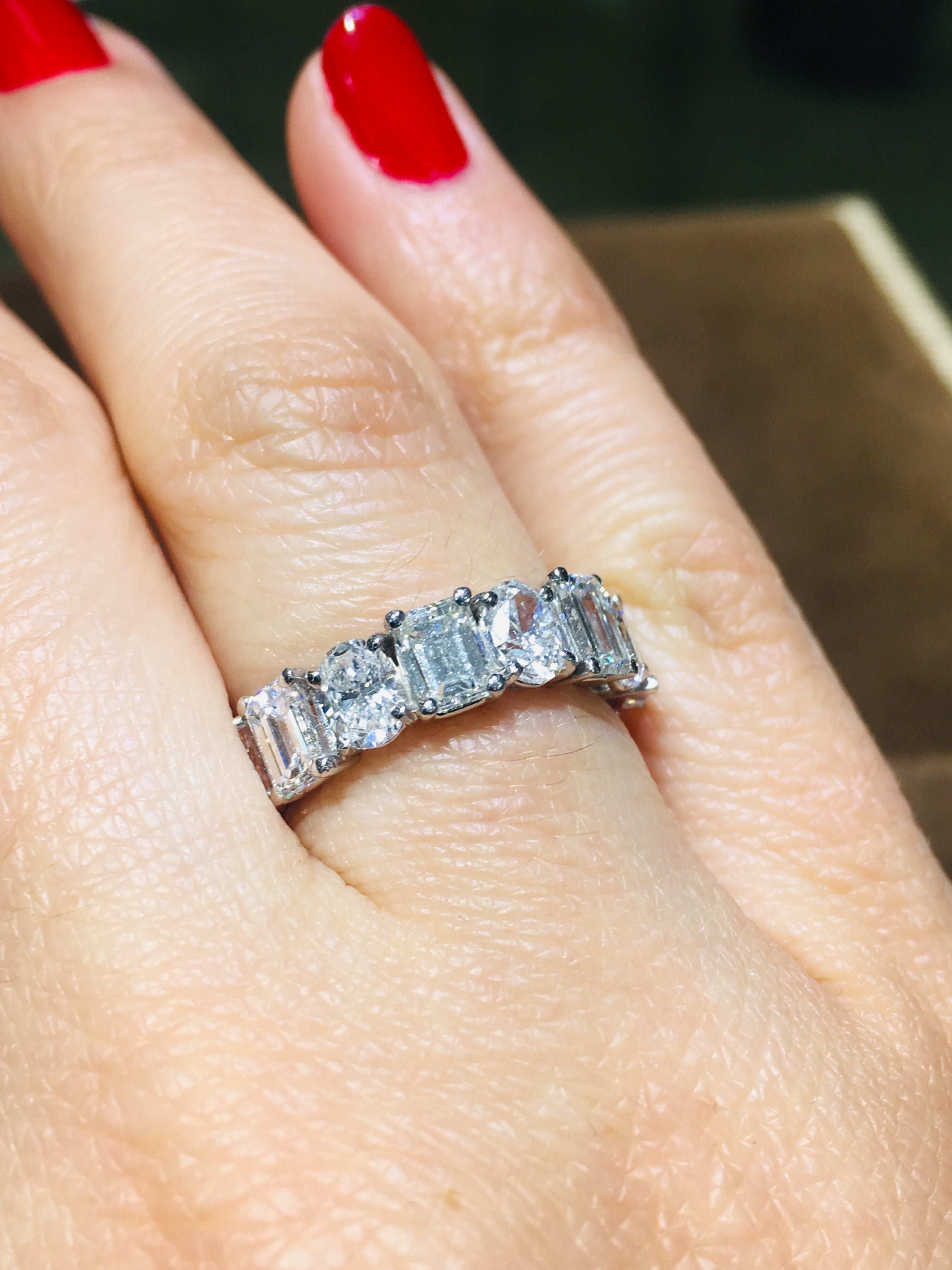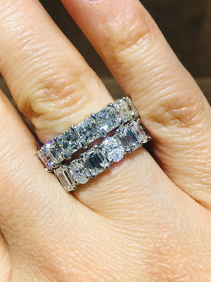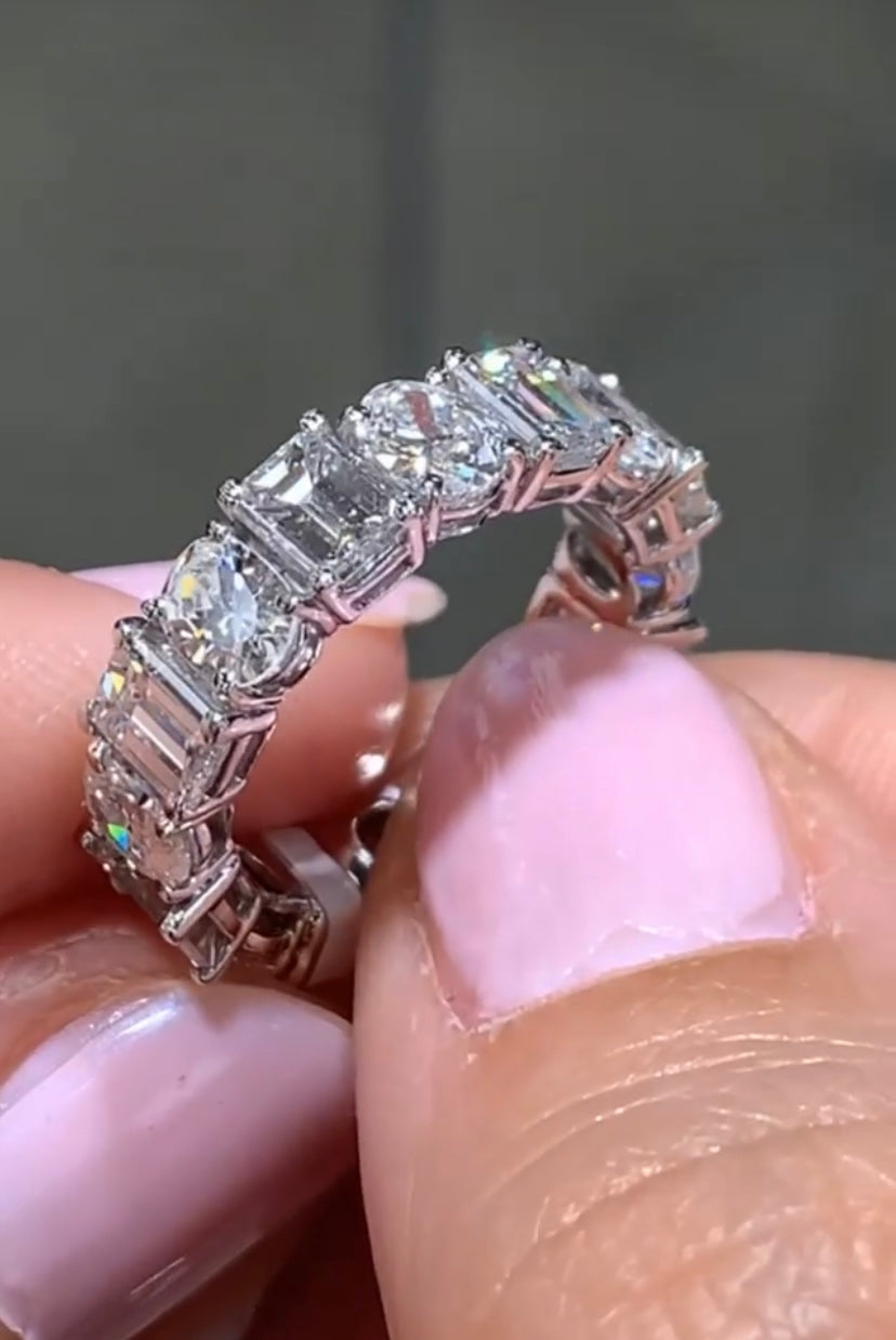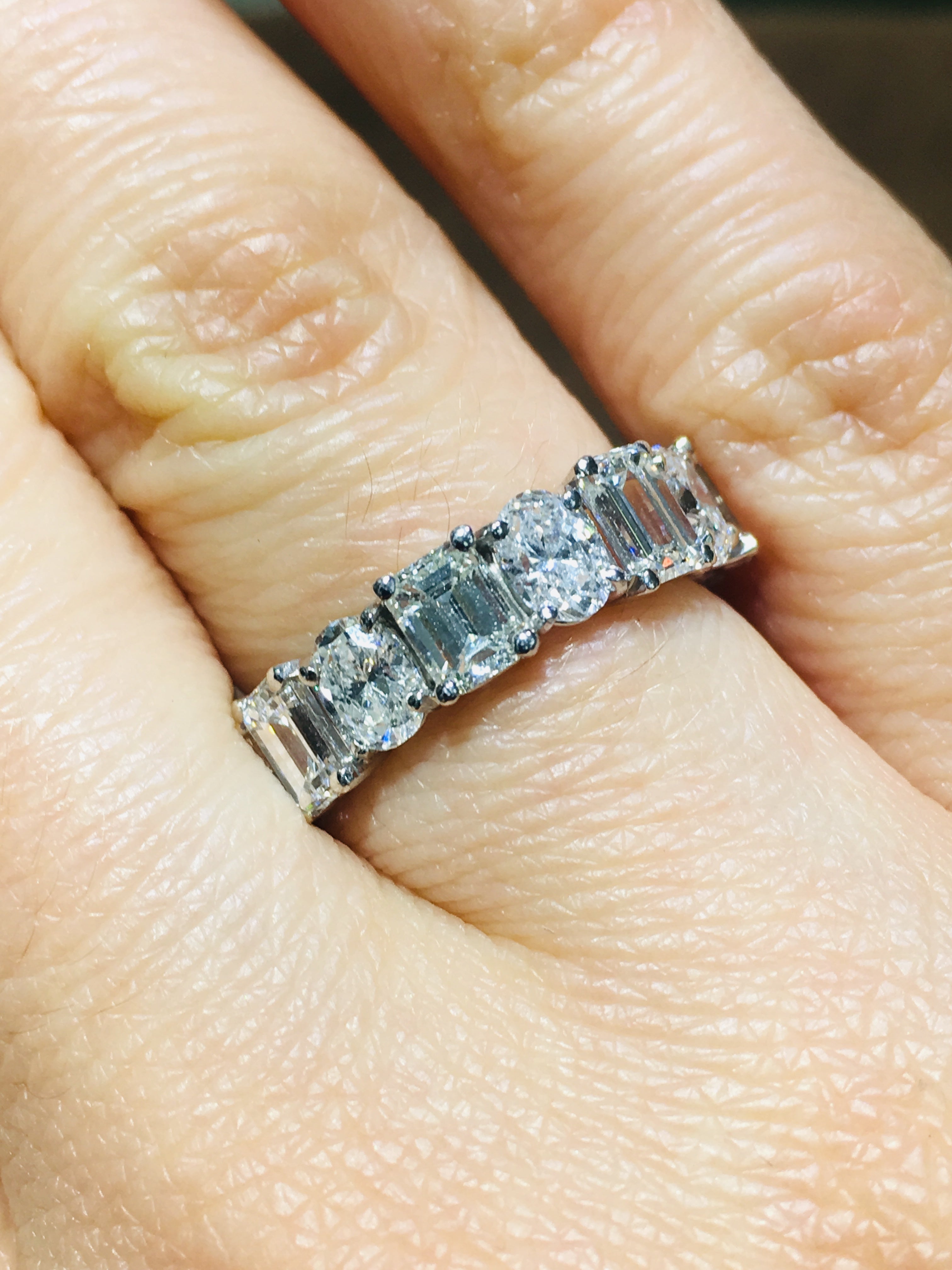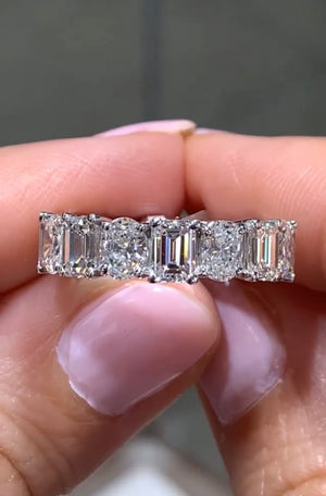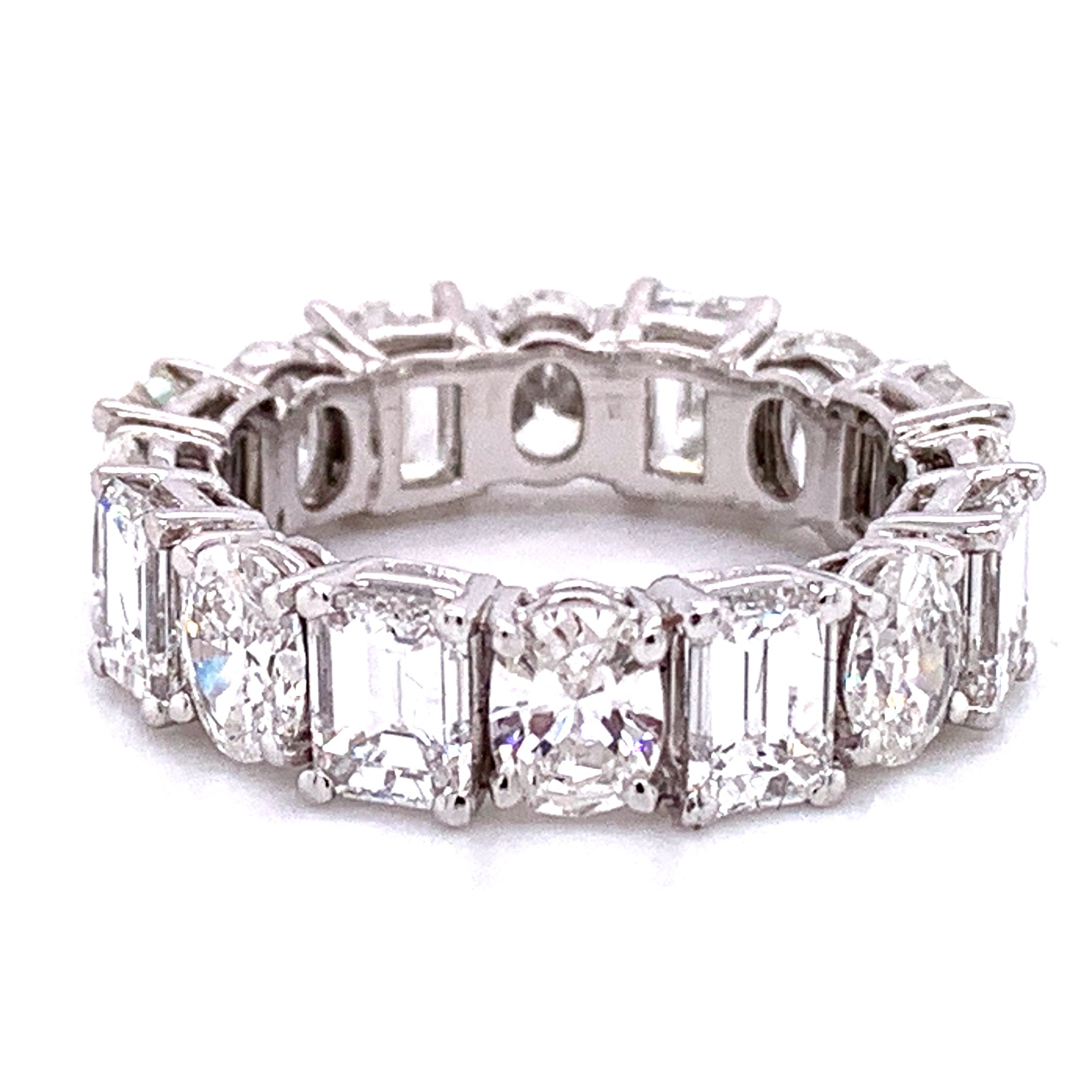 A stunning display of everlasting beauty, our platinum oval and emerald cut alternating diamond eternity band is crafted in a mesmerizing setting. Revel in the breathtaking brilliance of these diamonds - the perfect way to honor all of life's most special moments.