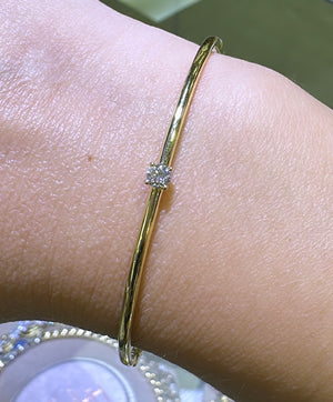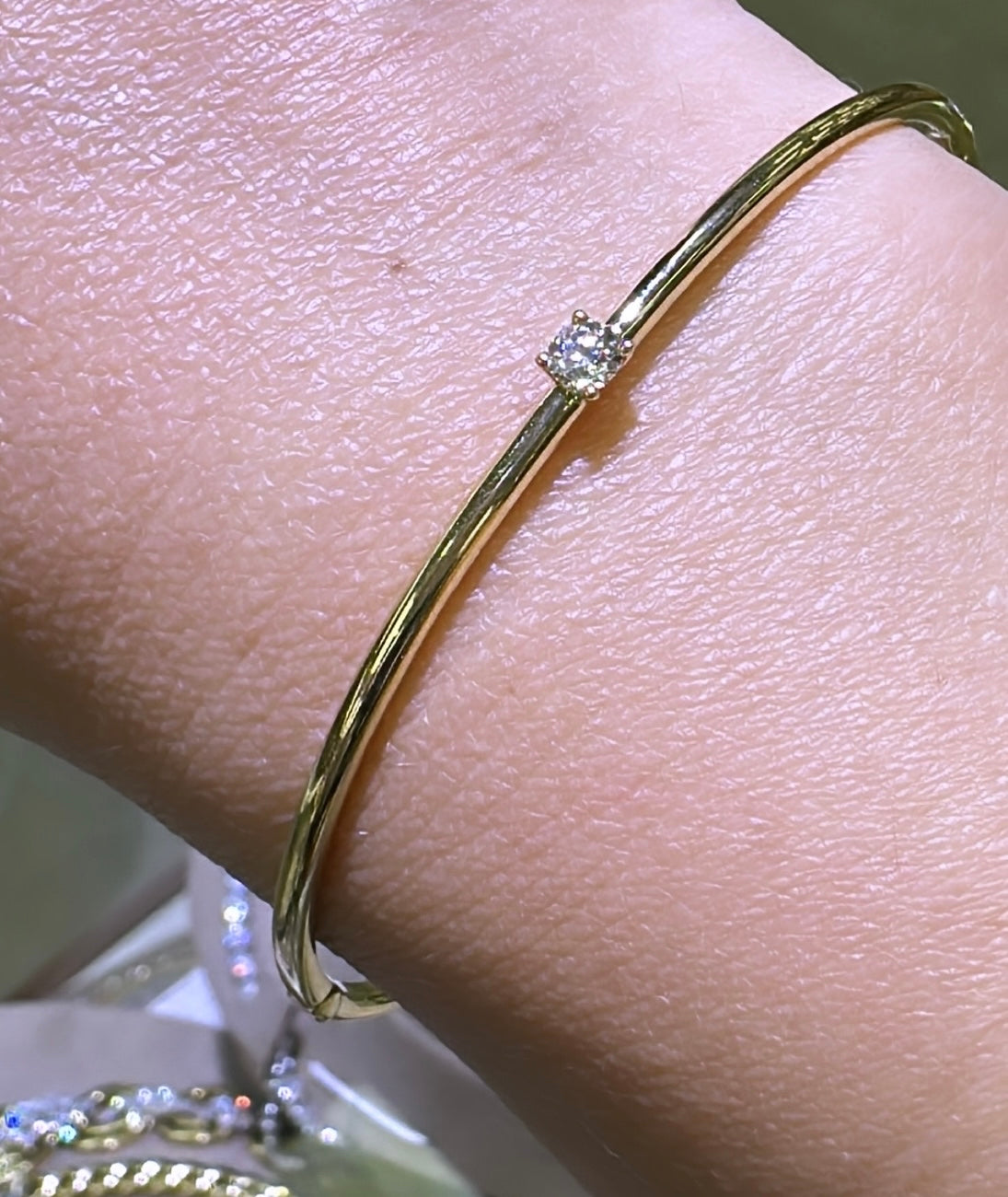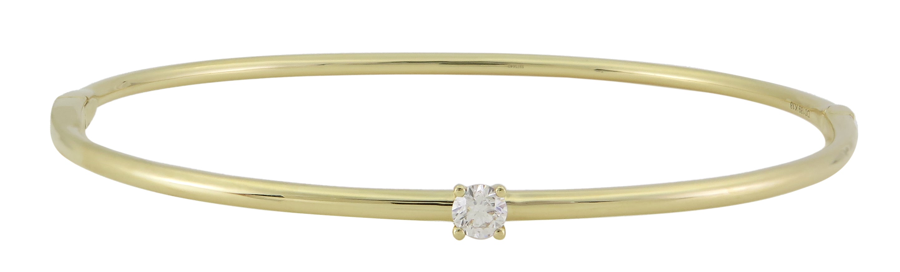 Make a statement with this beautiful prong set solitaire round brilliant-cut diamond bangle bracelet. Crafted with meticulous attention to detail, the diamond sparkles in the light and is sure to make heads turn. Its sophisticated design will add a touch of glamour and luxury to your ensemble. Experience the power of diamond brilliance!