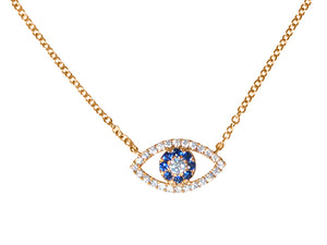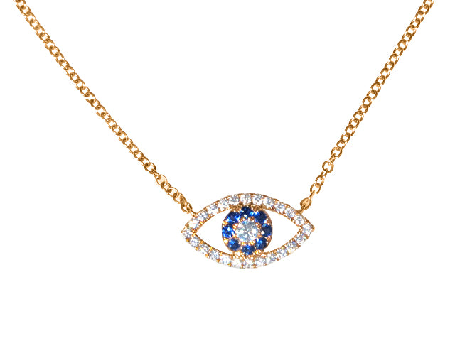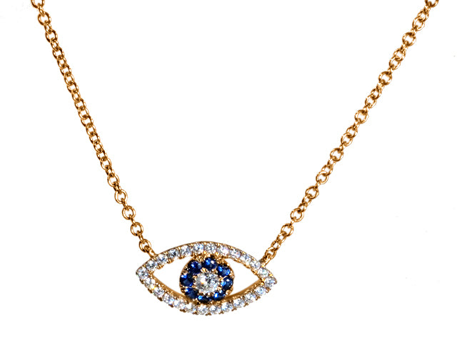 The Evil eye is an ancient Middle Eastern amulet symbolizing the Eye of God. In all faiths it is a protective sign. It brings it's owner happiness, luck, health, and good fortune. Our evil eye diamond pendant is made in 18k rose gold and inlaid with 0.39ct t.w. in round diamonds. Center sapphire is 0.10ct.
