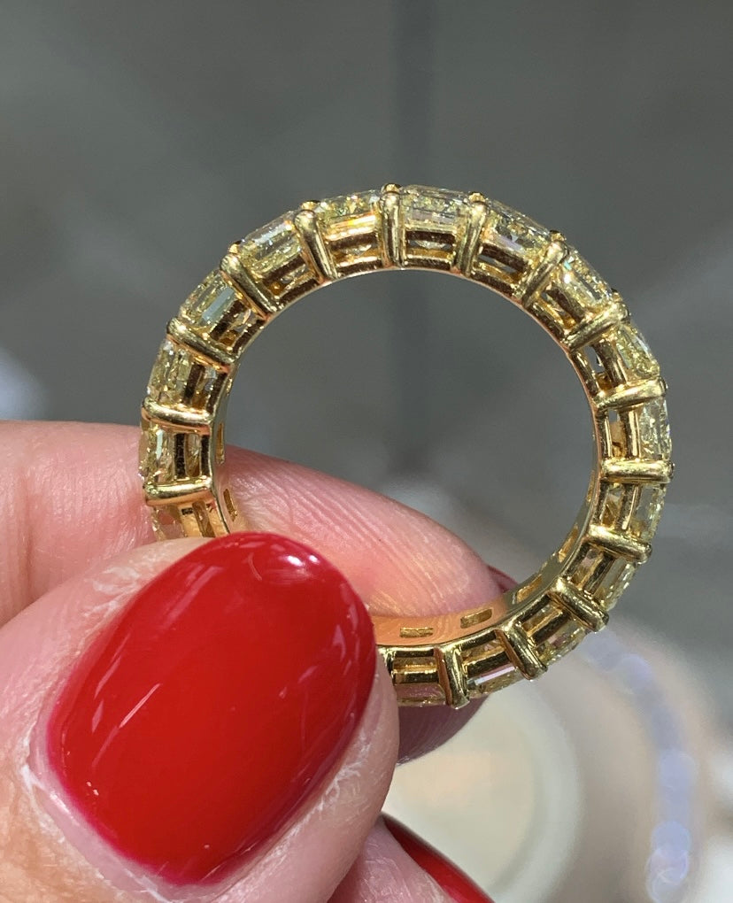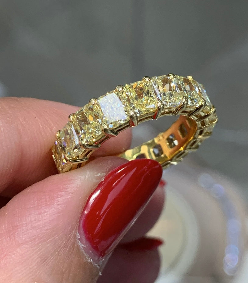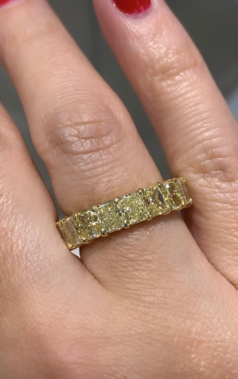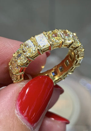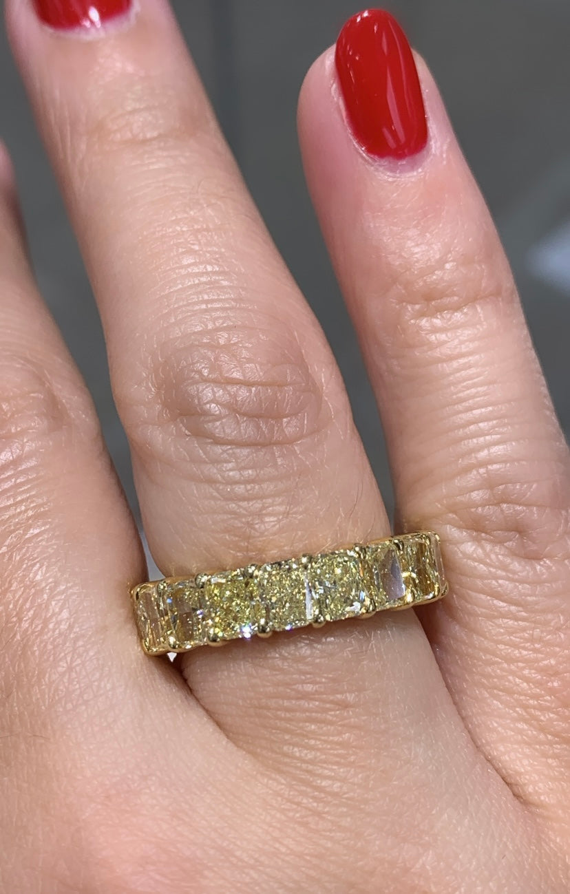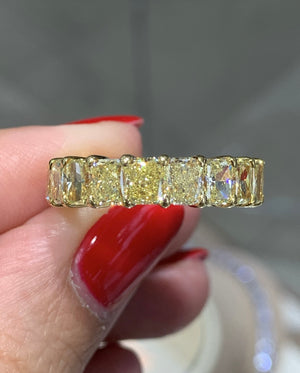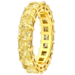 Breathtaking Radiant Cut diamond eternity ring made in rich yellow gold amazing and brilliant from all angles. Will take your breath away the moment you put it on. Perfectly matched circle of fancy yellow radiant cut diamonds, an ideal wedding or anniversary ring.